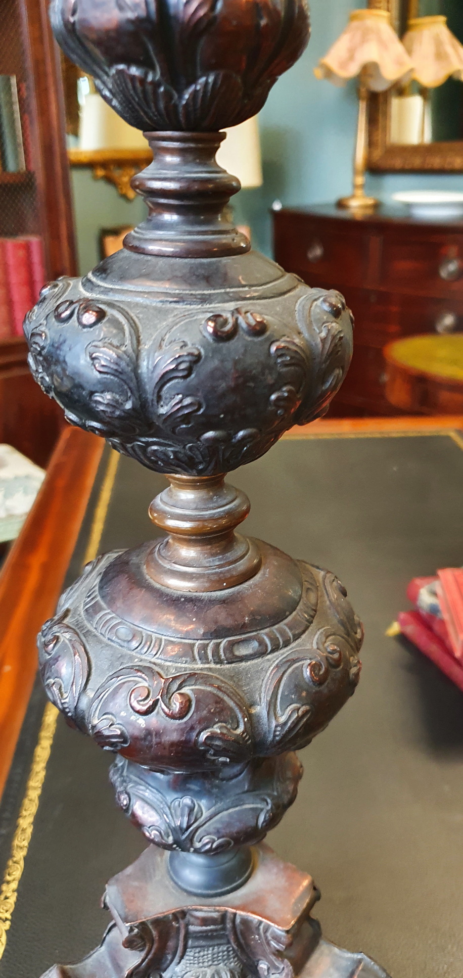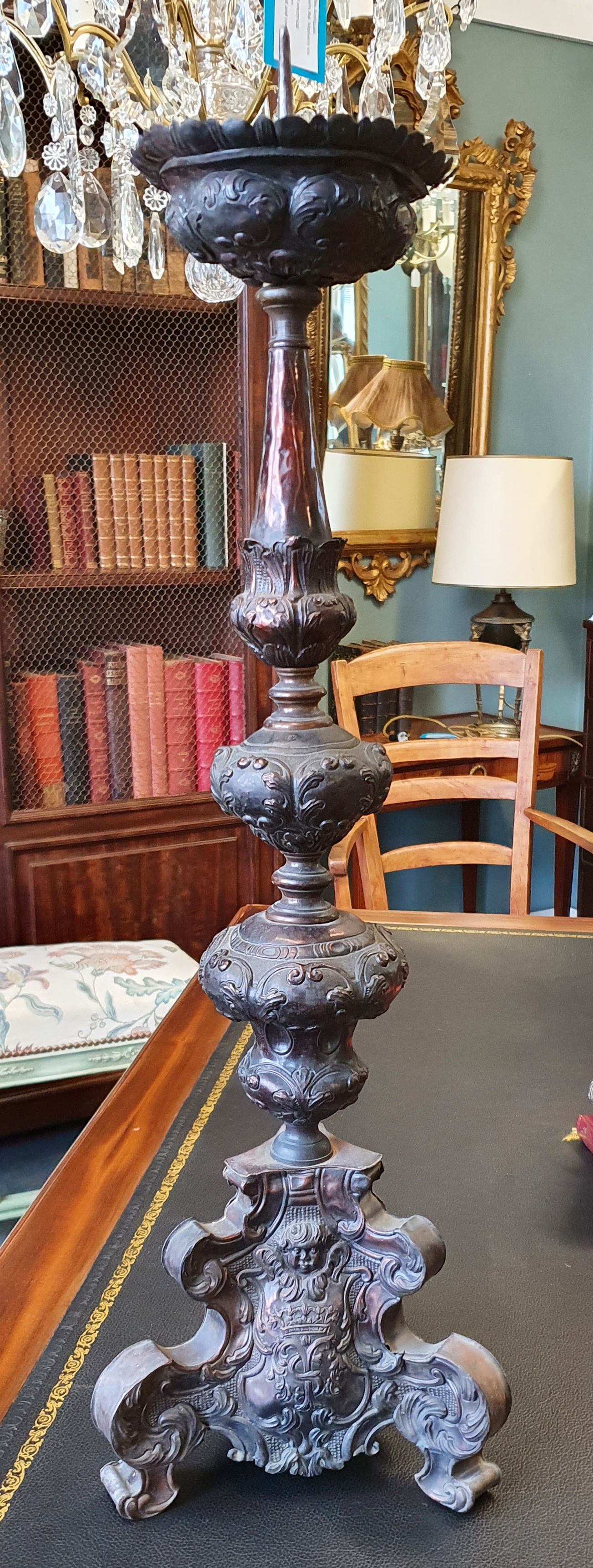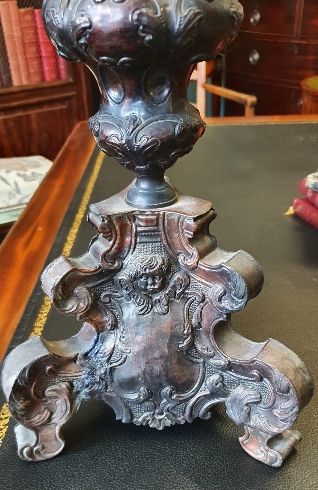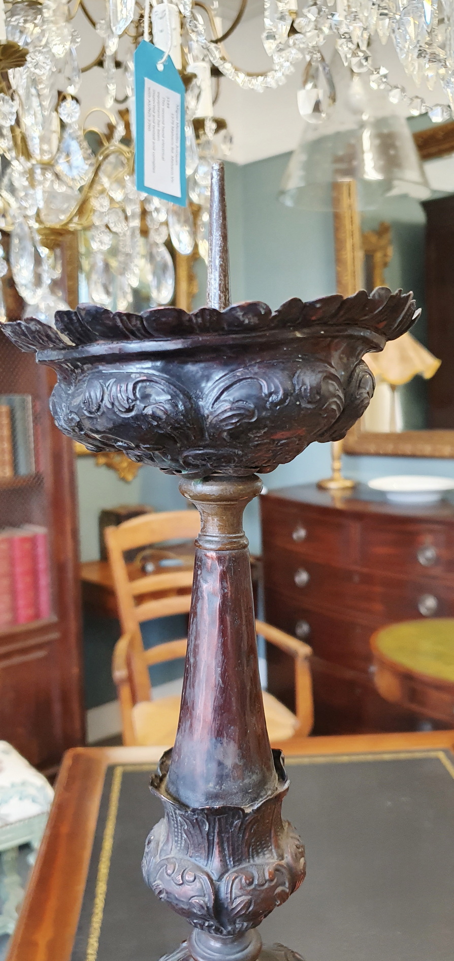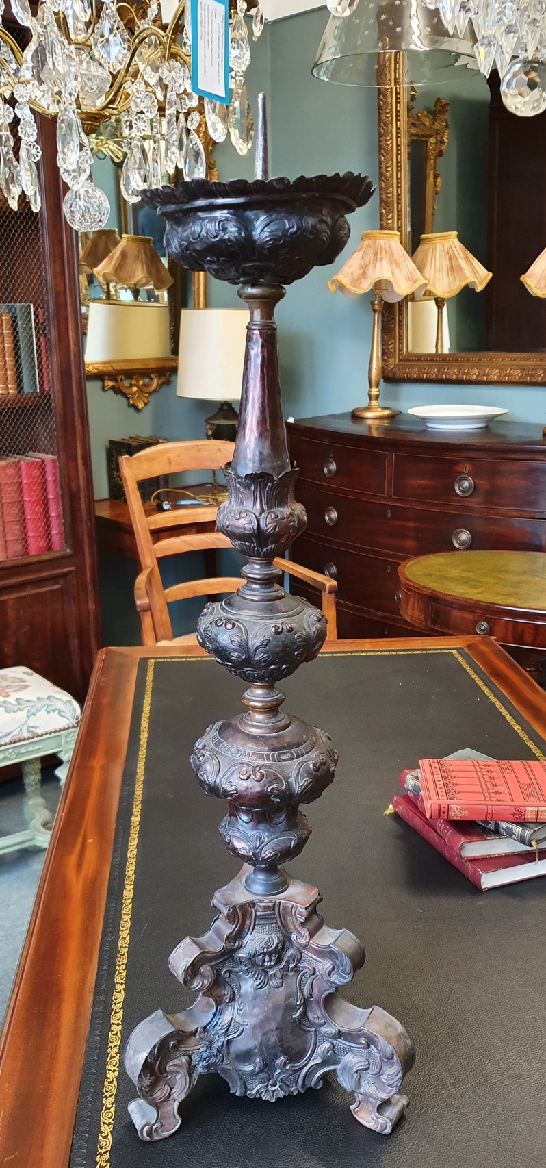 A late 17th century Italian candelabrum, the repousséd and chased silver-gilt metal well-worn and showing some of the brass beneath. Retaining an excellent patina. Area of Piedmont, circa 1680.