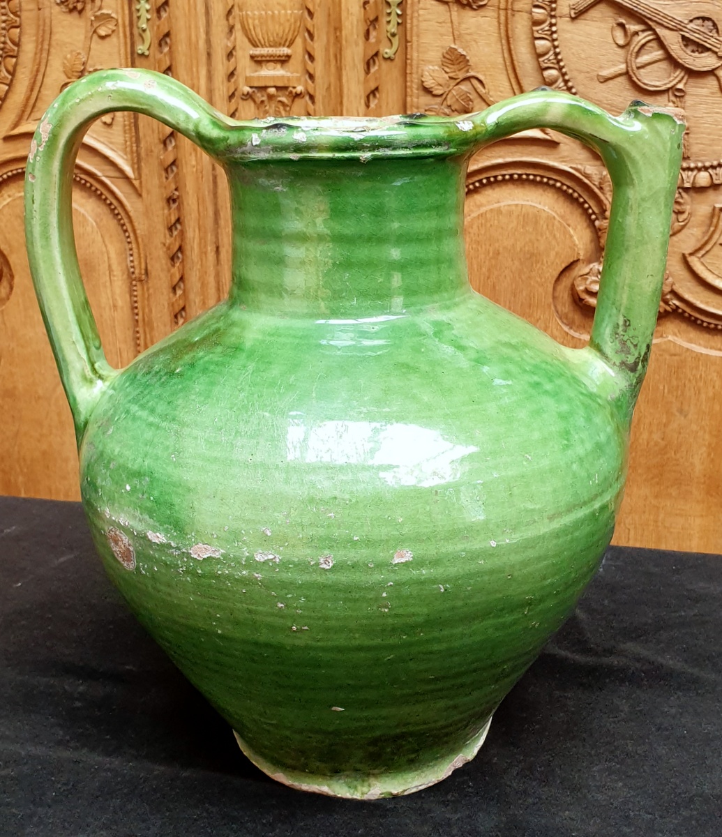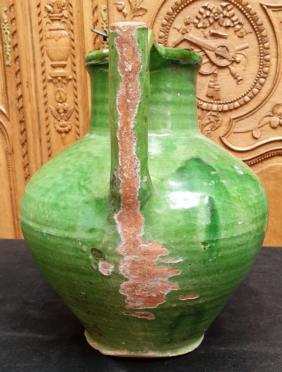 An 18th century French “Cruche” jug, a green glazed majolica water vessel retaining its carrying handles, one of which is also a pouring spout. Note the amount of wear along a handle and the bottom of the jug, from scraping against a fountain wall. Area of Toulouse, South West France, circa 1780.