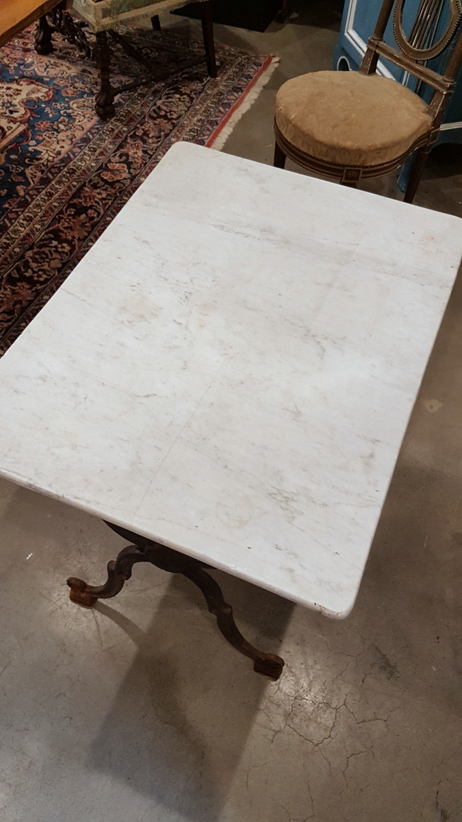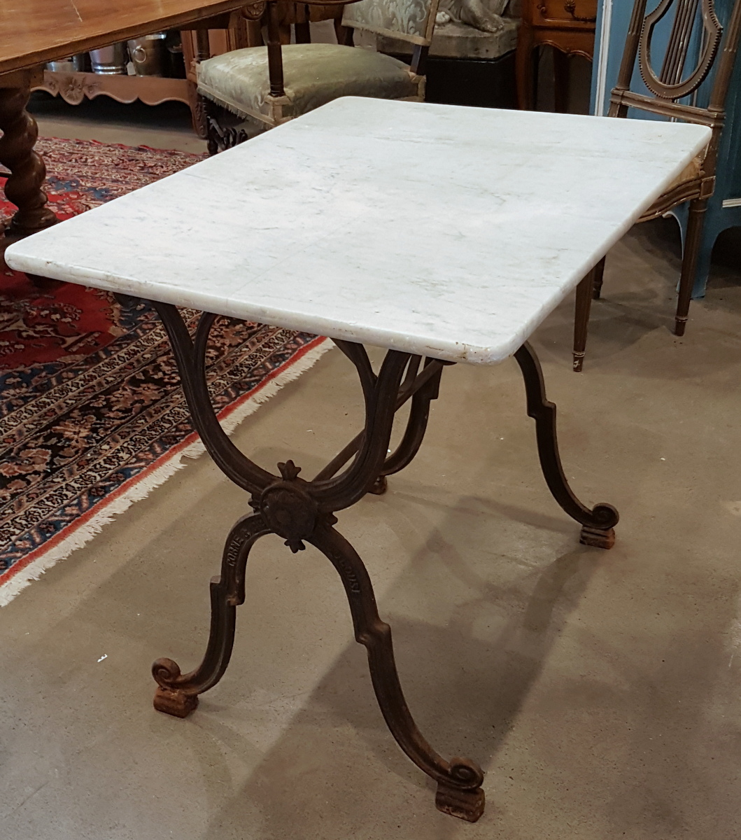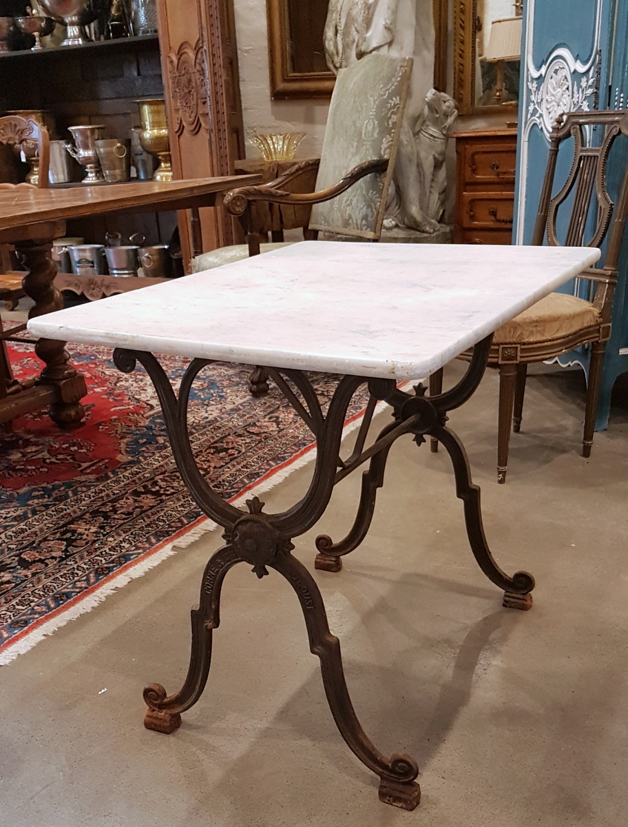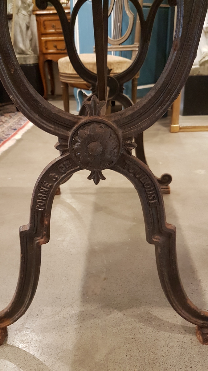 A 19th century French cast iron table fitted with its original Carrara marble top. Originally used in a French bistro, this table is suitable for indoor use, but also for all-year use in an outdoor garden setting. The wonderfully designed 'X' shaped cast iron structure with the manufacturer's mark. Area of Toulouse, South-West France, circa 1880.