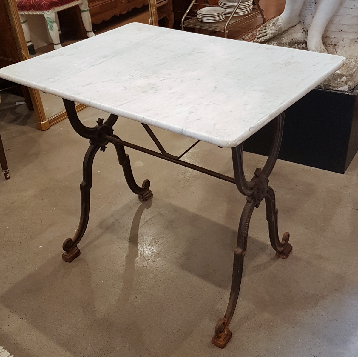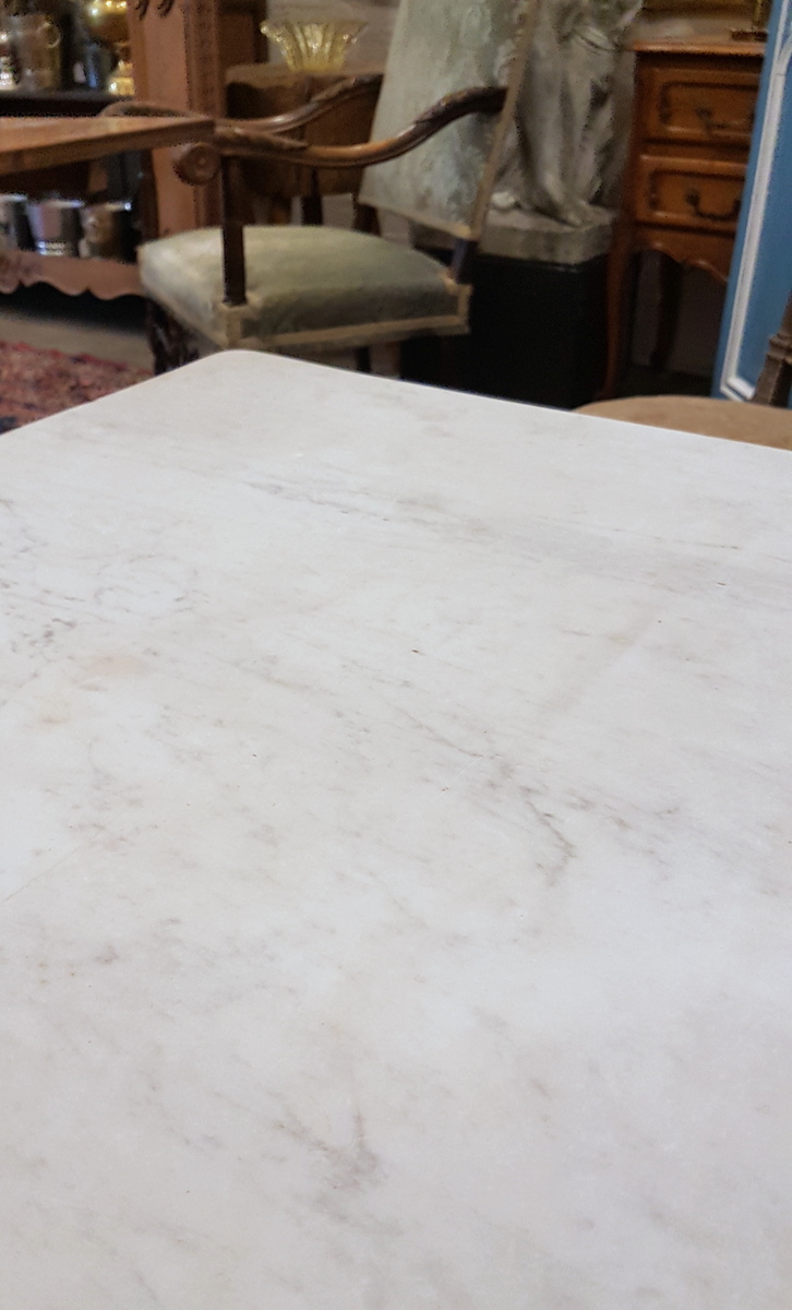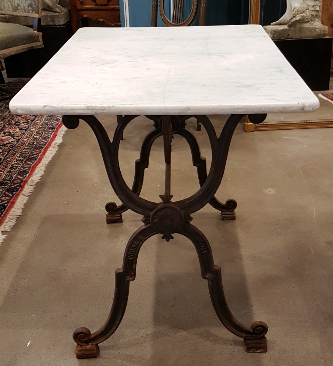 A 19th century French cast iron table fitted with its original Carrara marble top. Originally used in a French bistro, this table is suitable for indoor use, but also for all-year use in an outdoor garden setting. The wonderfully designed 'X' shaped cast iron structure with the manufacturer's mark. Area of Toulouse, South-West France, circa 1880.
