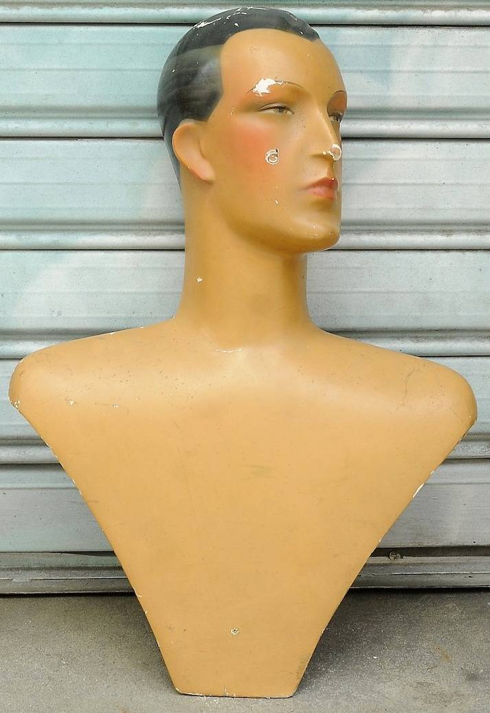 A 1930s French Art Deco period male mannequin bust retaining the original hand-coloured finishes.