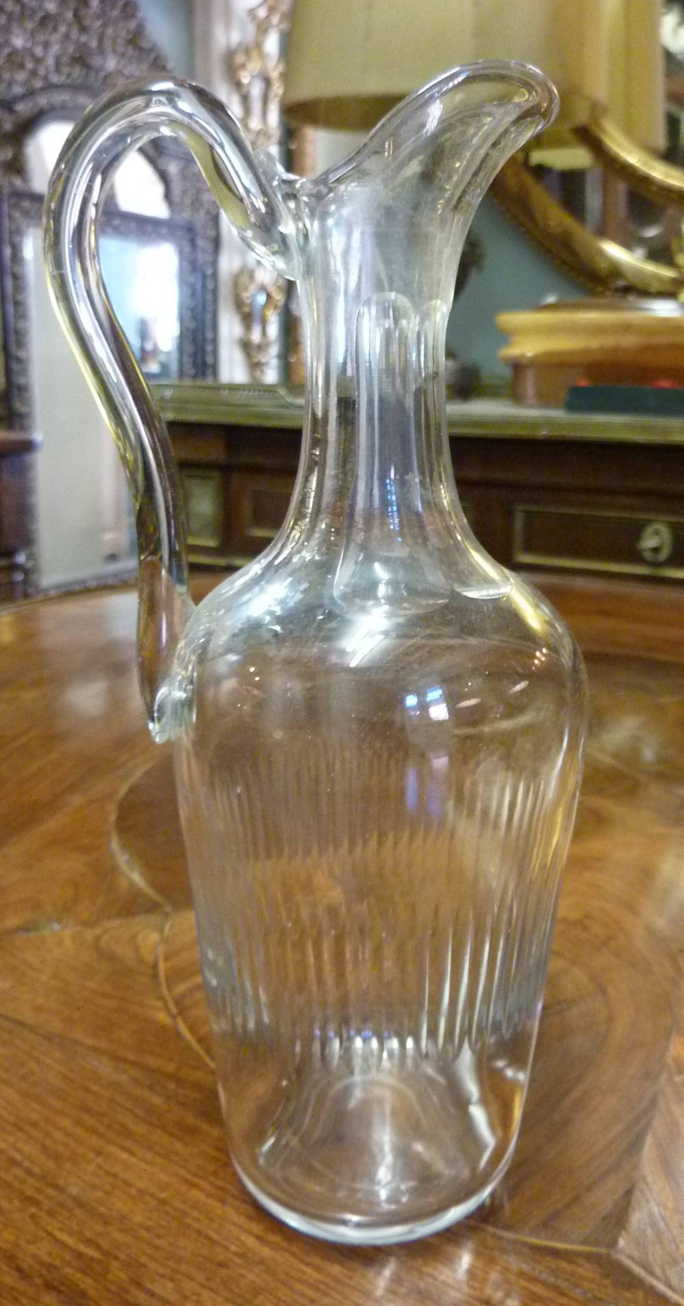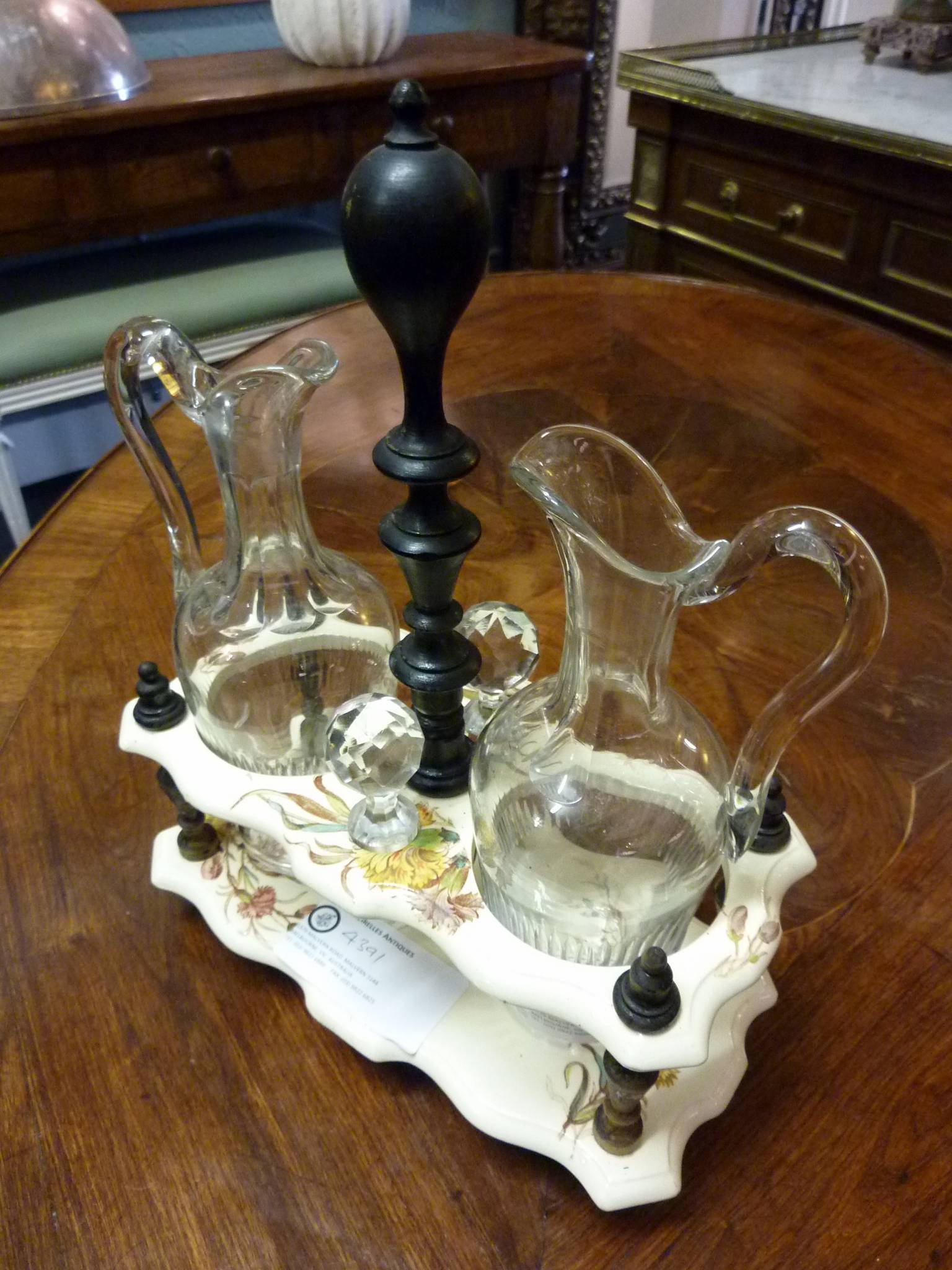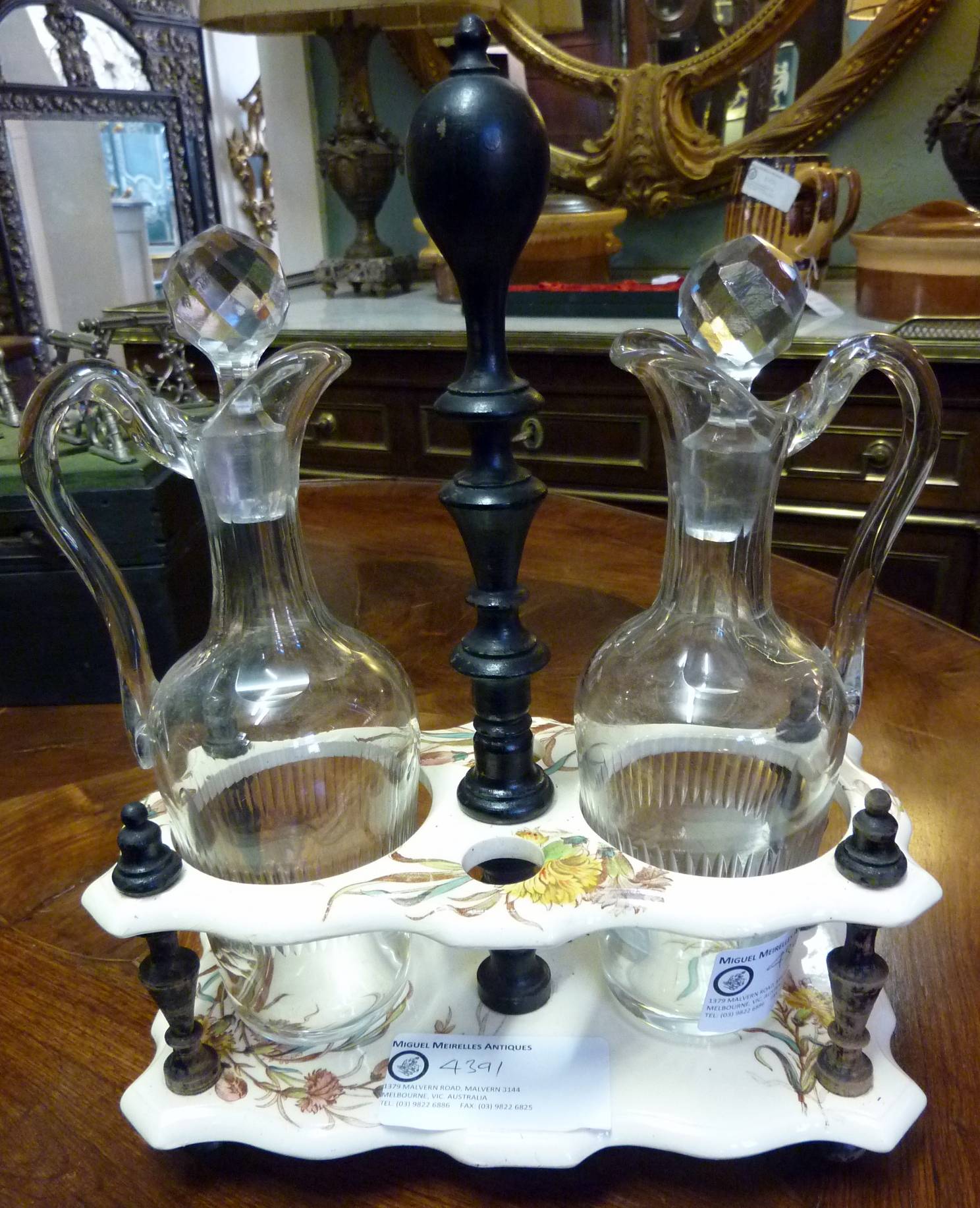A 19th century French majolica cruet set retaining the original cut glass bottles and stoppers, decorated with delicate flower motifs. The underside stamped with "Fabrique huiliers AL & CK, Saint-Senis s/Seine". Paris, circa 1880.