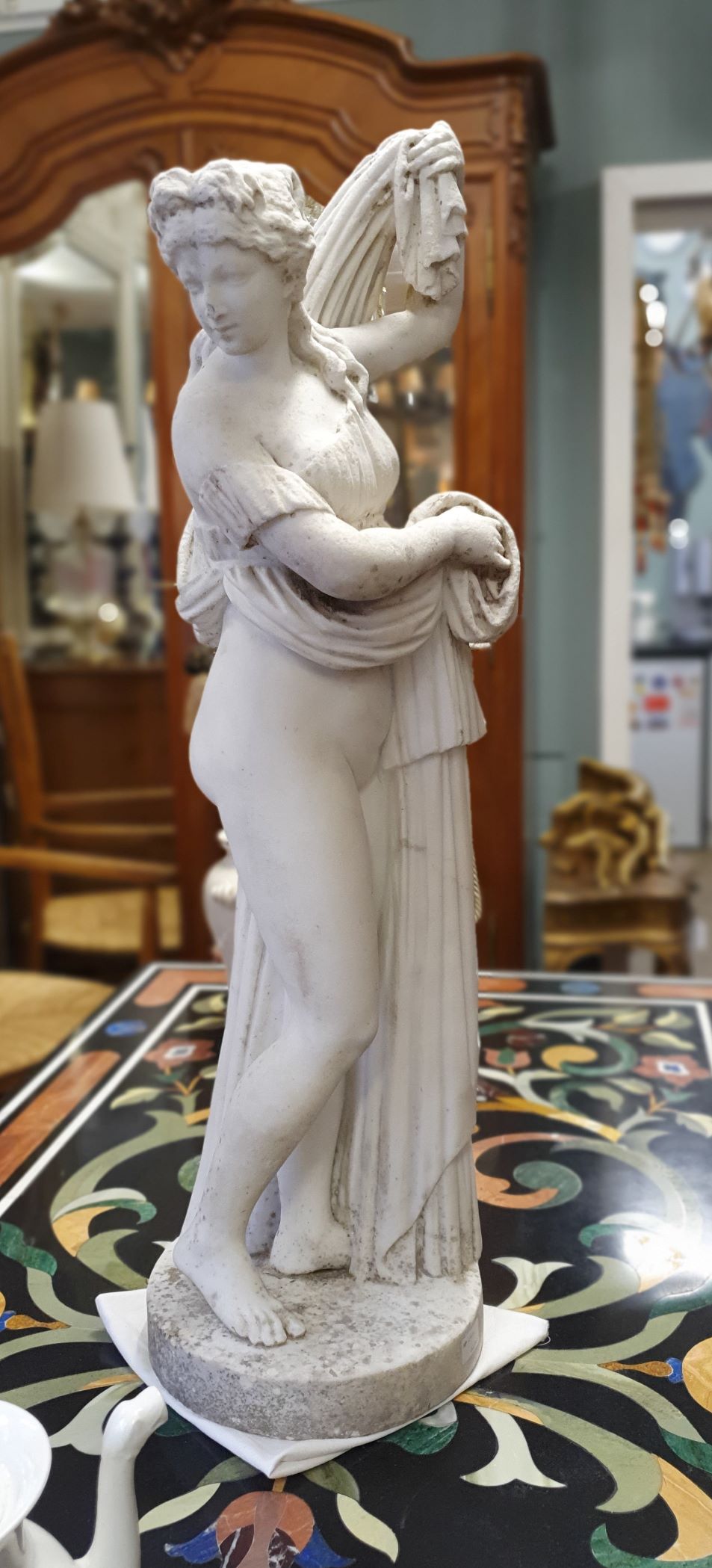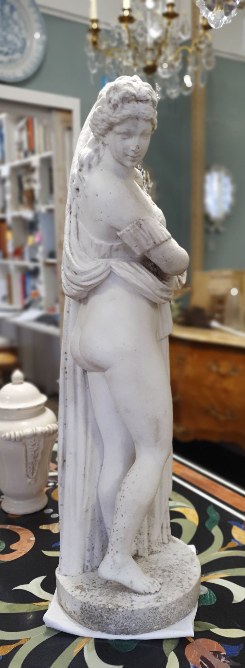 An 18th century French white Carrara marble garden statue in the style of the "Venus Callipyge", a 1st century BC Classical Roman statue now located in the National Archaeological Museum in Naples, Italy. The Venus is depicted looking over her shoulder in an elegant, half-turned pose. Area of Paris, circa 1780.