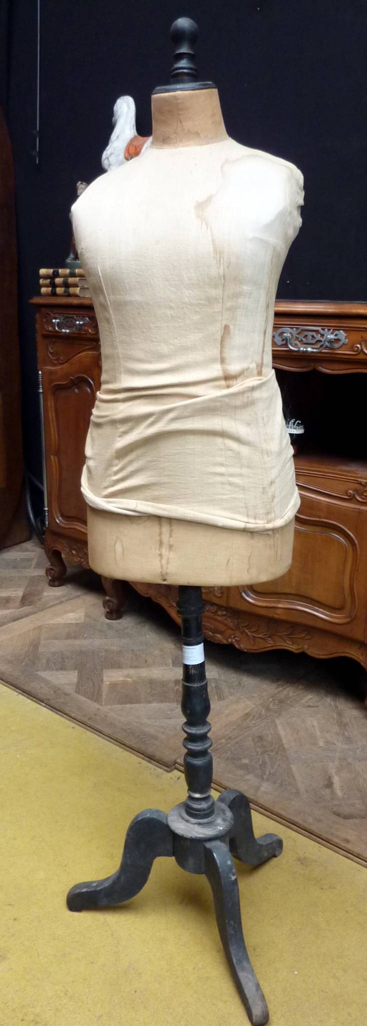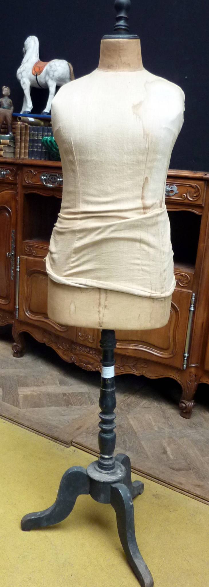A late 19th century French turned and upholstered timber dressmakers mannequin, standing on a turned and ebonised tripod base.