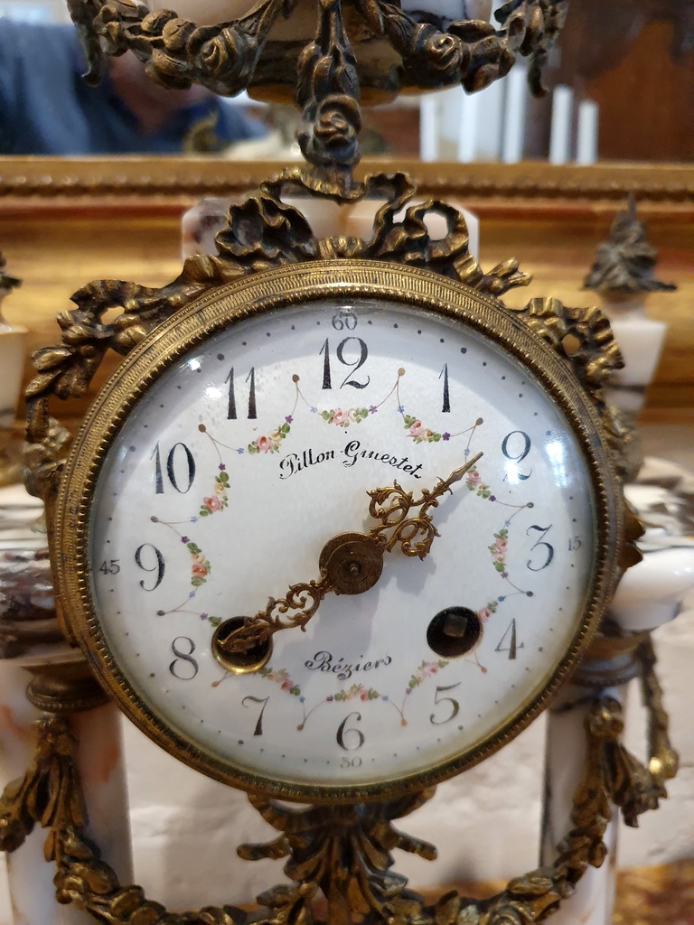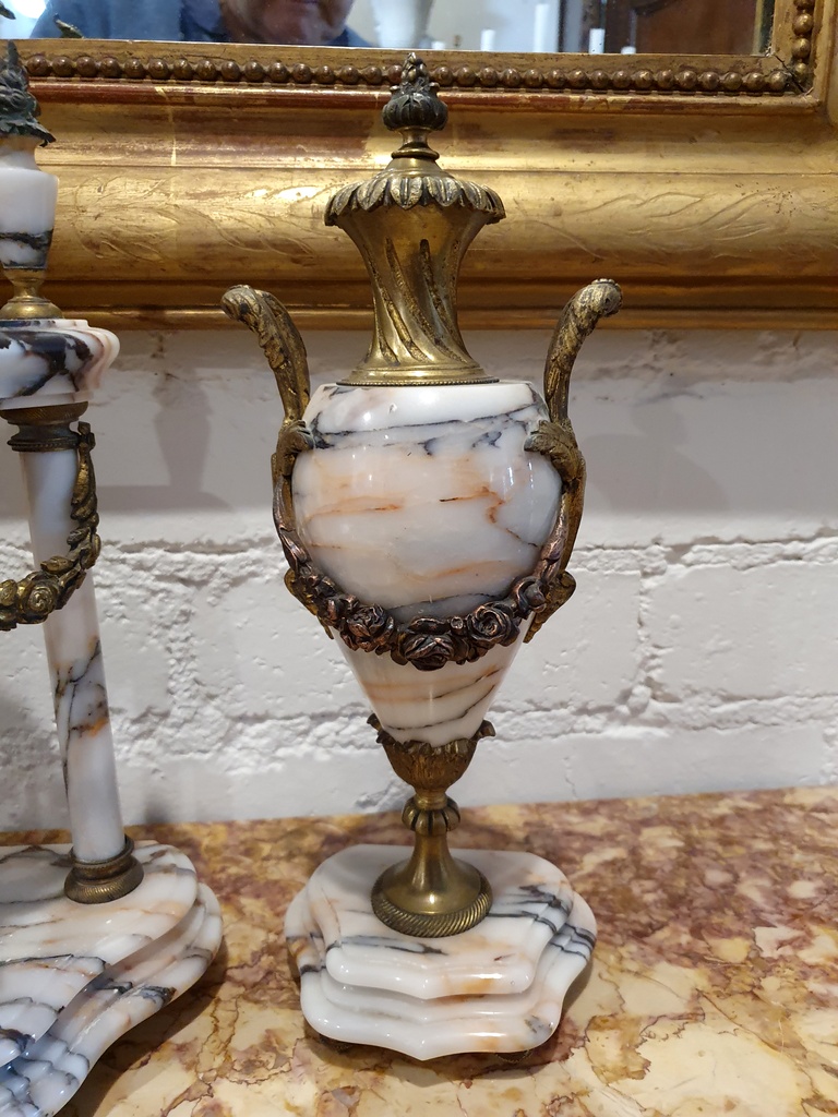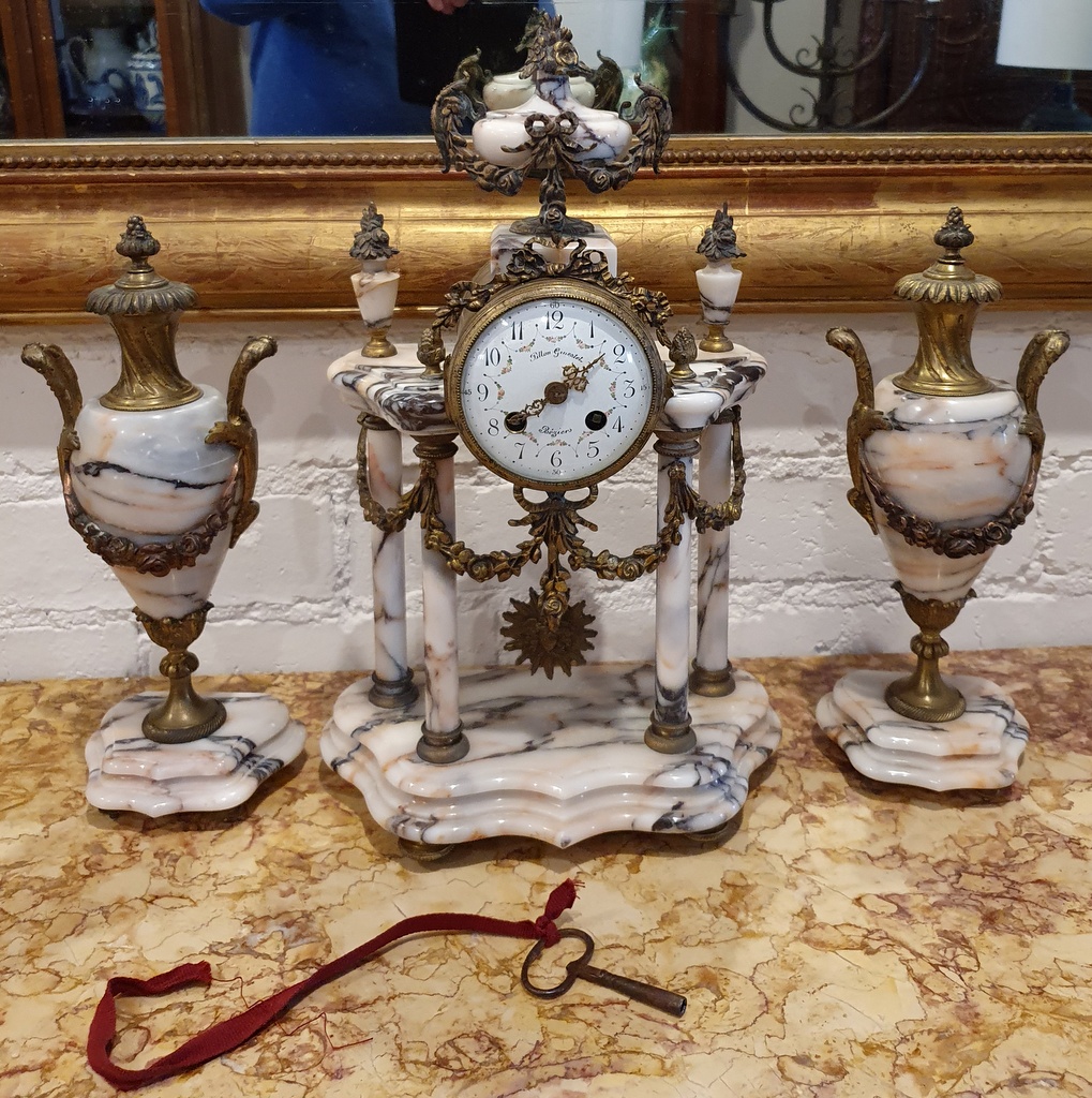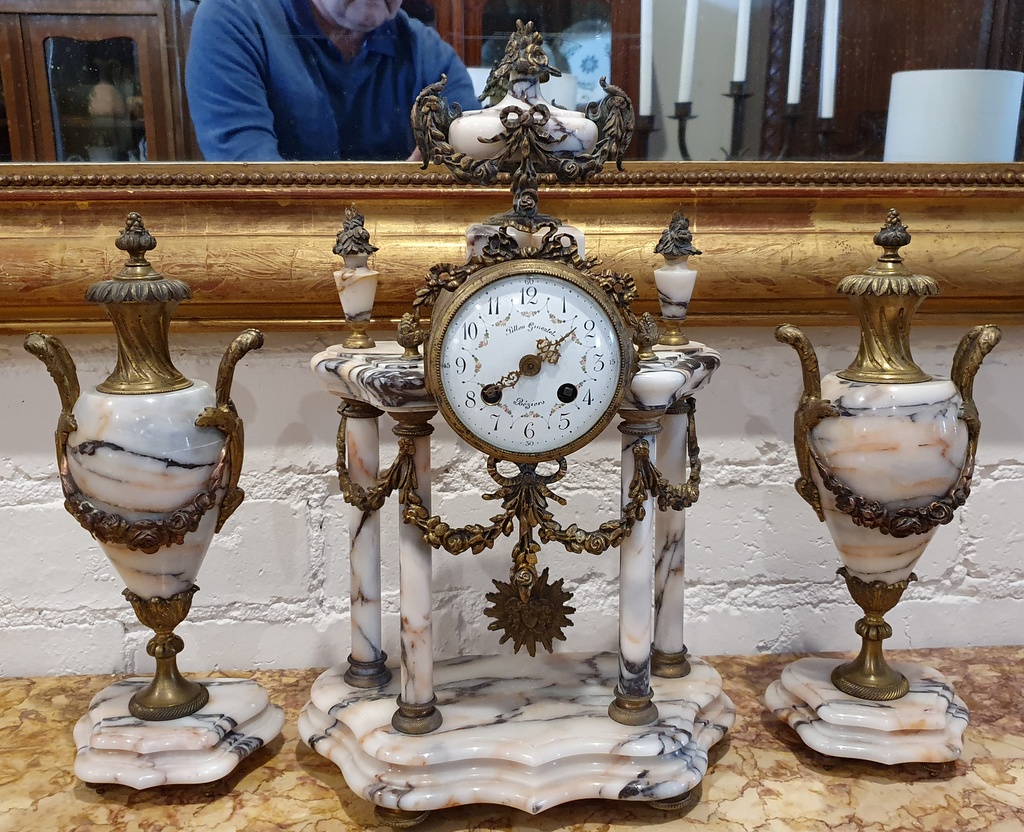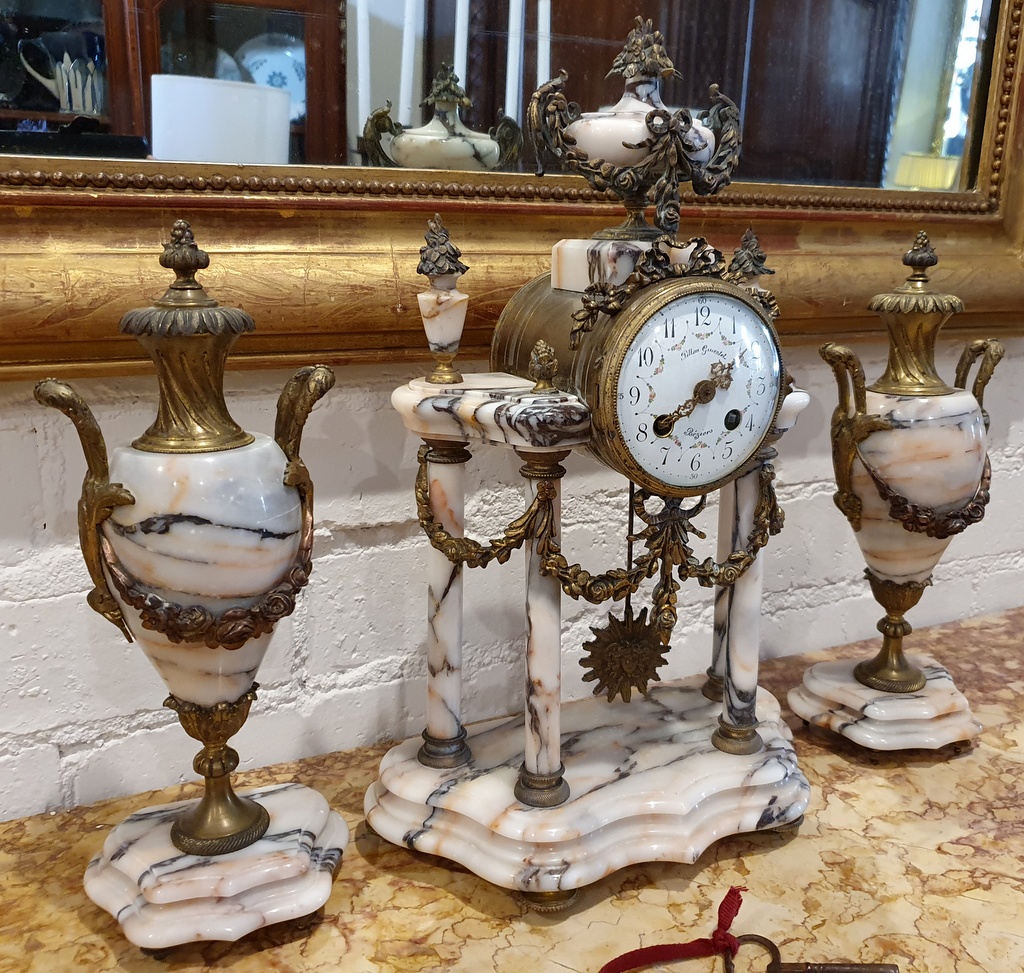 A 19th century French Louis XVI style, Napoleon III period gilt metal and 'Skyros' marble Garniture, comprising a clock and two Medici urns, decorated with mounted gilt metal knotted bows, swags of flowers, finials and Classical handles. The face of the clock with the maker's name, the pendulum in the shape of a sun-burst. Retaining the original winding key for the clock spring and for the time-keeping bell. Area of Béziers, Southern France, circa 1870.