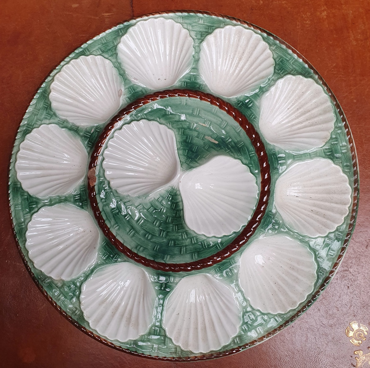 A French glazed majolica oyster-serving platter decorated with twelve white haut-relief scallops, sitting on a green woven basket pattern. The French tend to place twelve oysters, one in each scallop, and then a form a 'pyramid' of oysters above this bottom layer. France, circa 1950.
