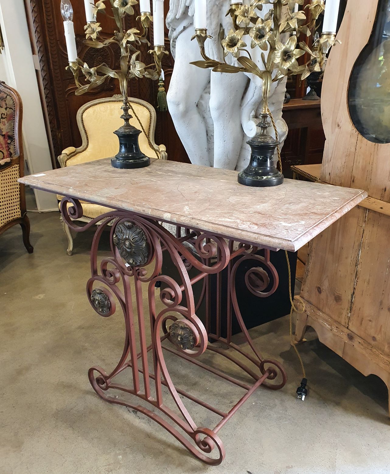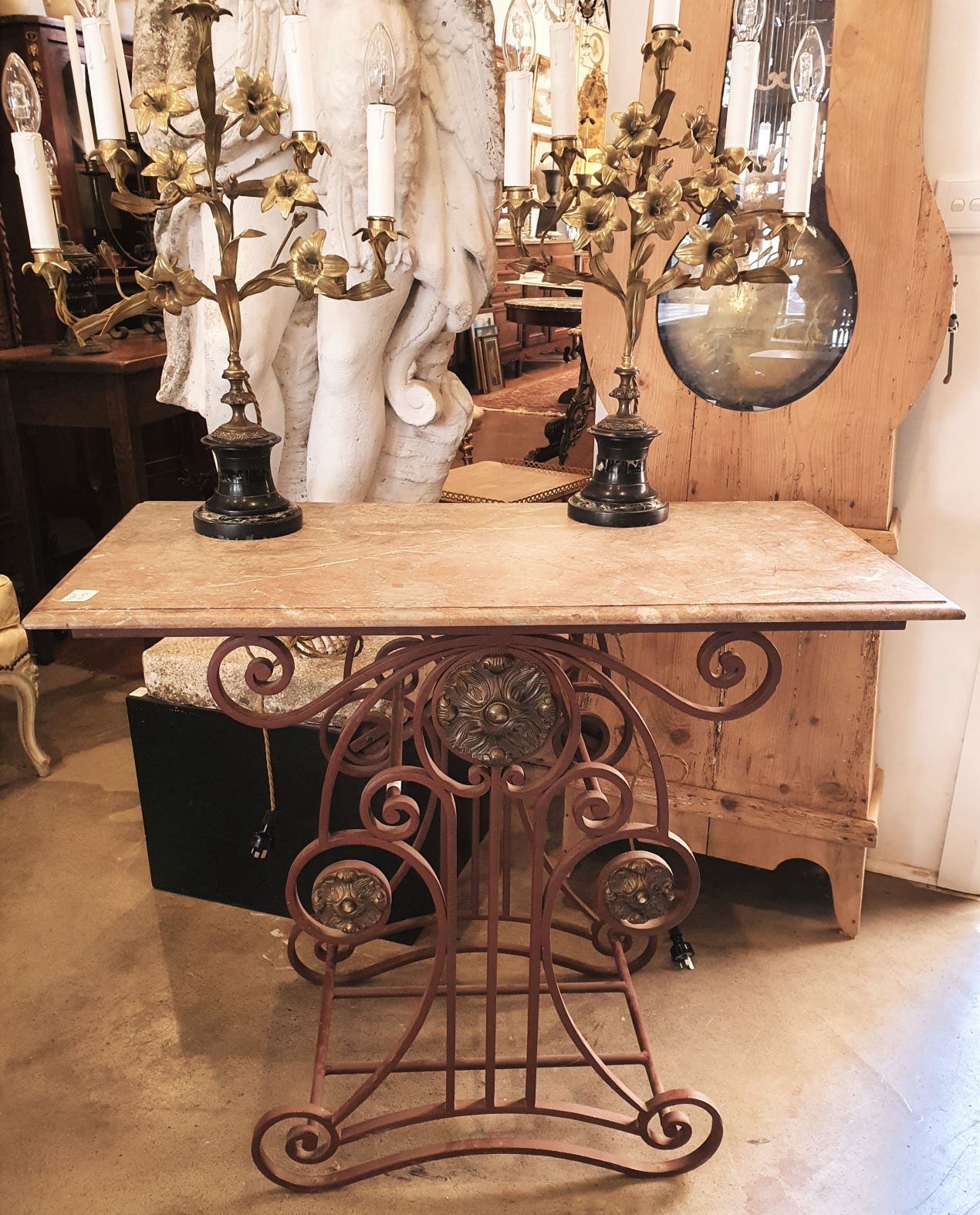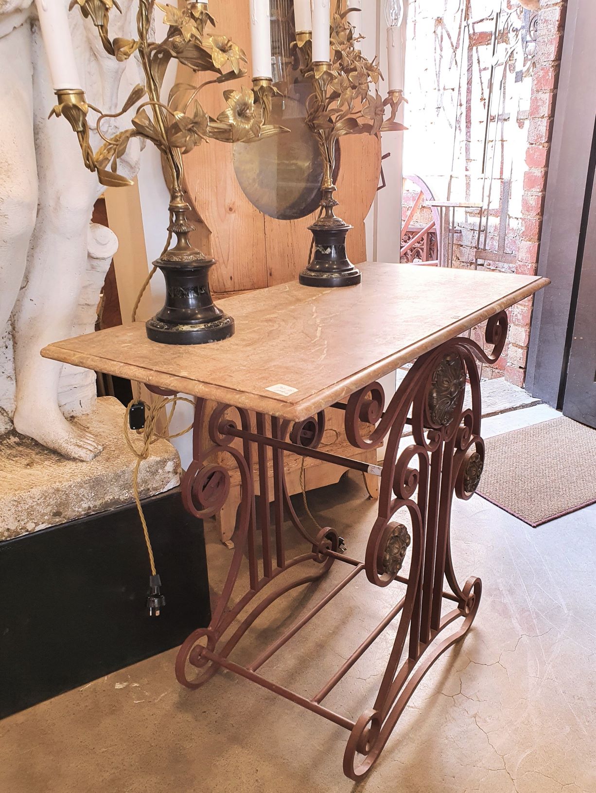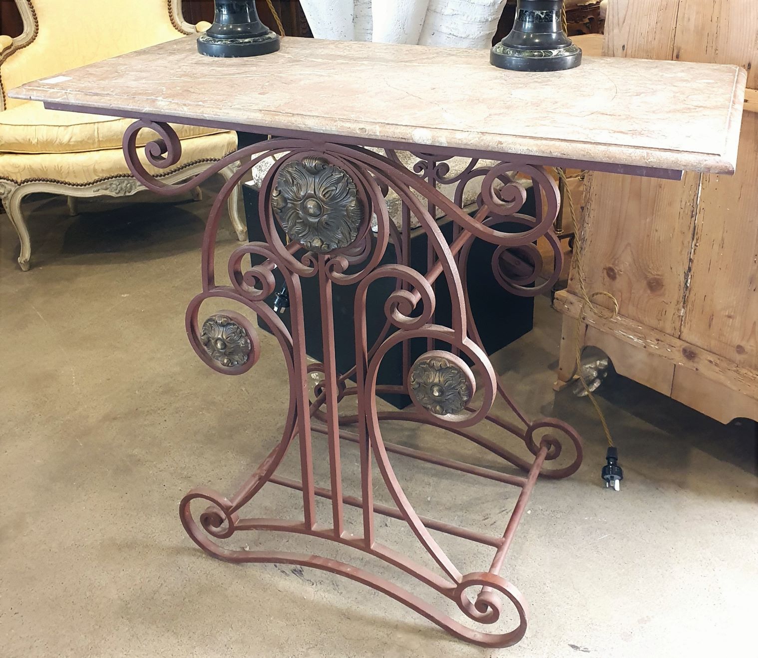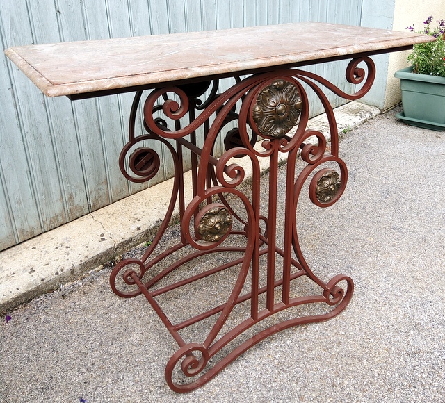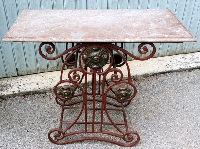 An elegant French wrought iron and finely cast brass Patisserie Table, (also known as a “Table de Boucher”), the original moulded edge marble top above a scrollwork base decorated with large brass paterae. These tables were commonly used as centrepieces in French bakeries and in butchers' shops, to display special products on. Area of Paris, circa 1900.