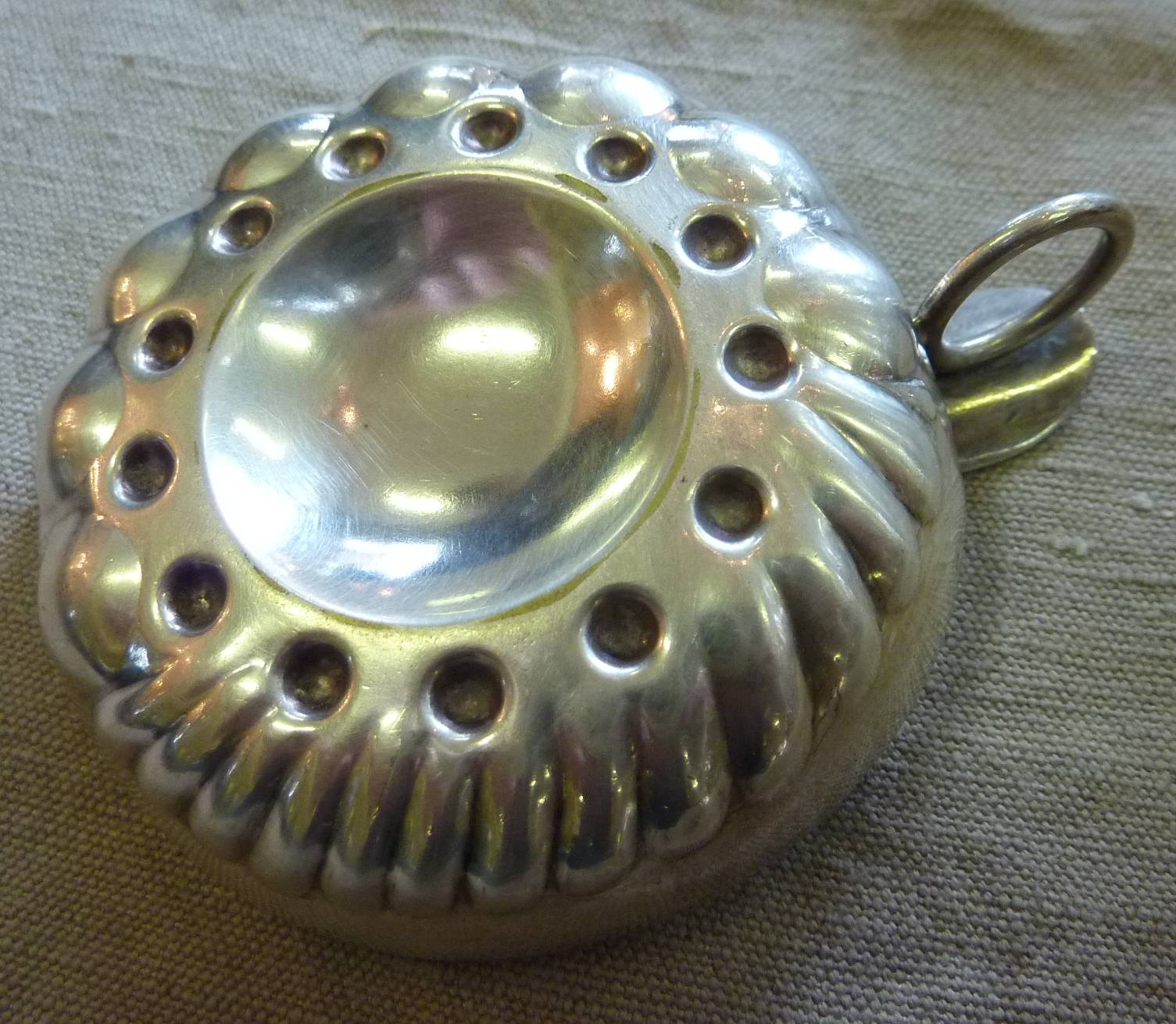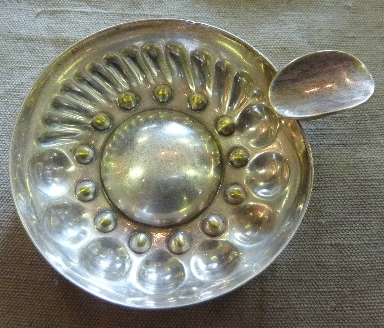 A mid 20th century French plated tin 'Tastevin' (from the French "tasse a vin"), a wine-tasting cup. The Tastevin cup was invented in Burgundy in the 17th century to allow a lover of wine to smell, taste and look at wine. The bas-relief patterns on the cup are designed to help air the wine.