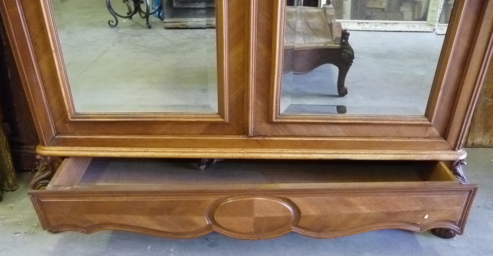 A large and elegant late 19th century French Louis XV style finely carved walnut two door Armoire, the doors fitted with the original hand-bevelled mirrors. Note the Parisian quality of the mouldings and of the cross-banded timbers. Internally fitted with drawers and adjustable-height shelves. Our shop can fit an internal hanging-bar on request.