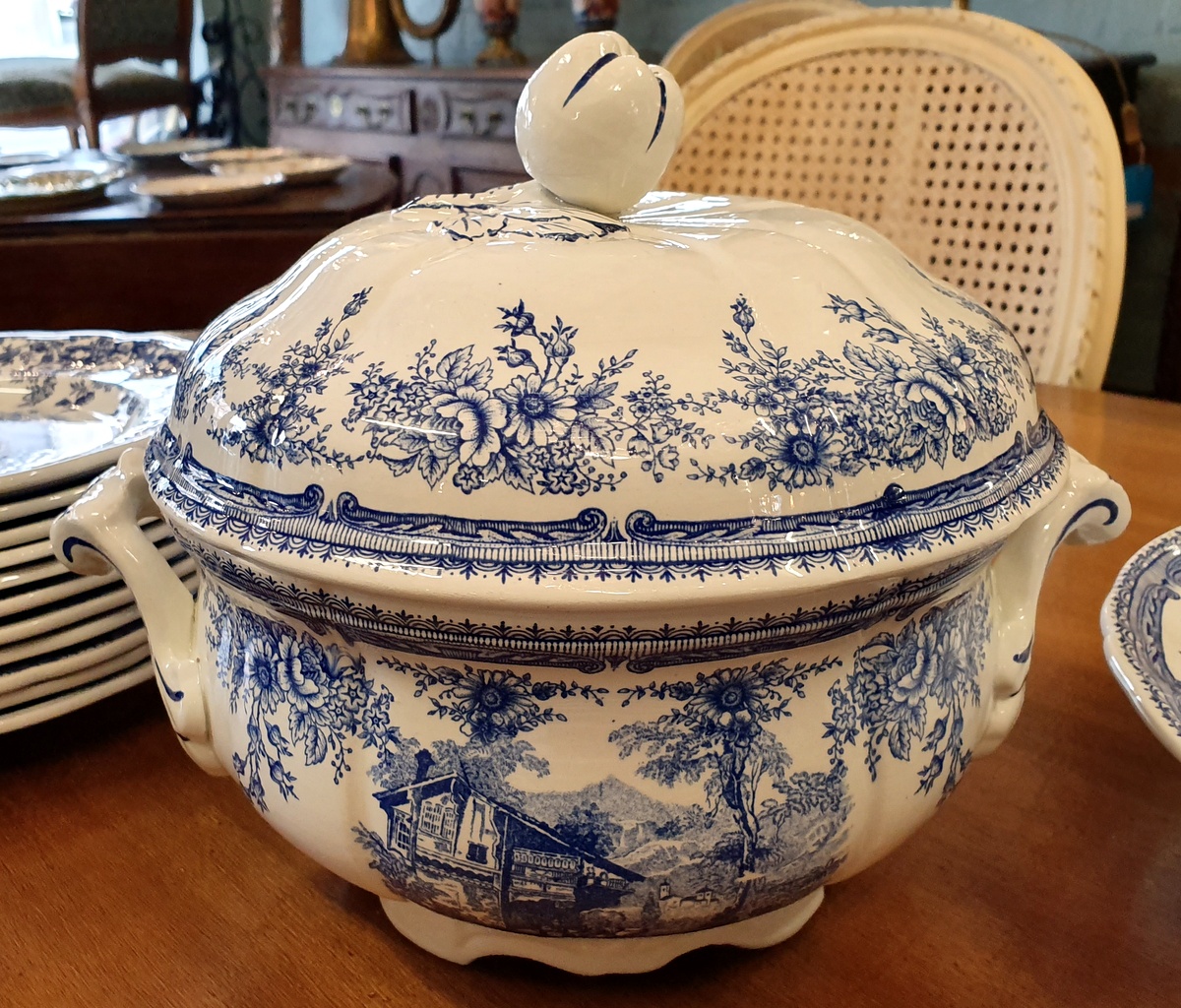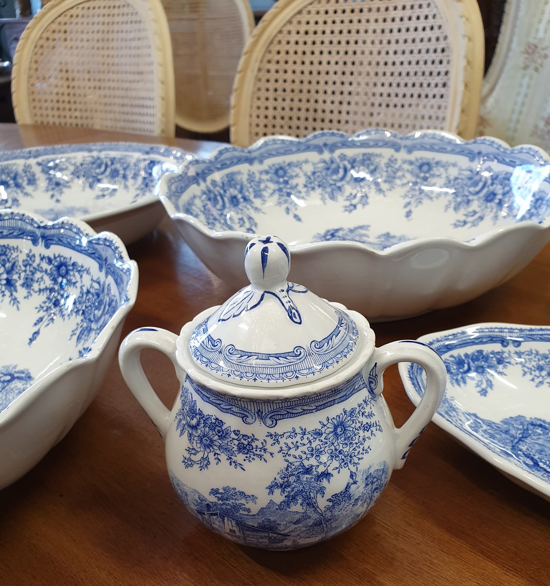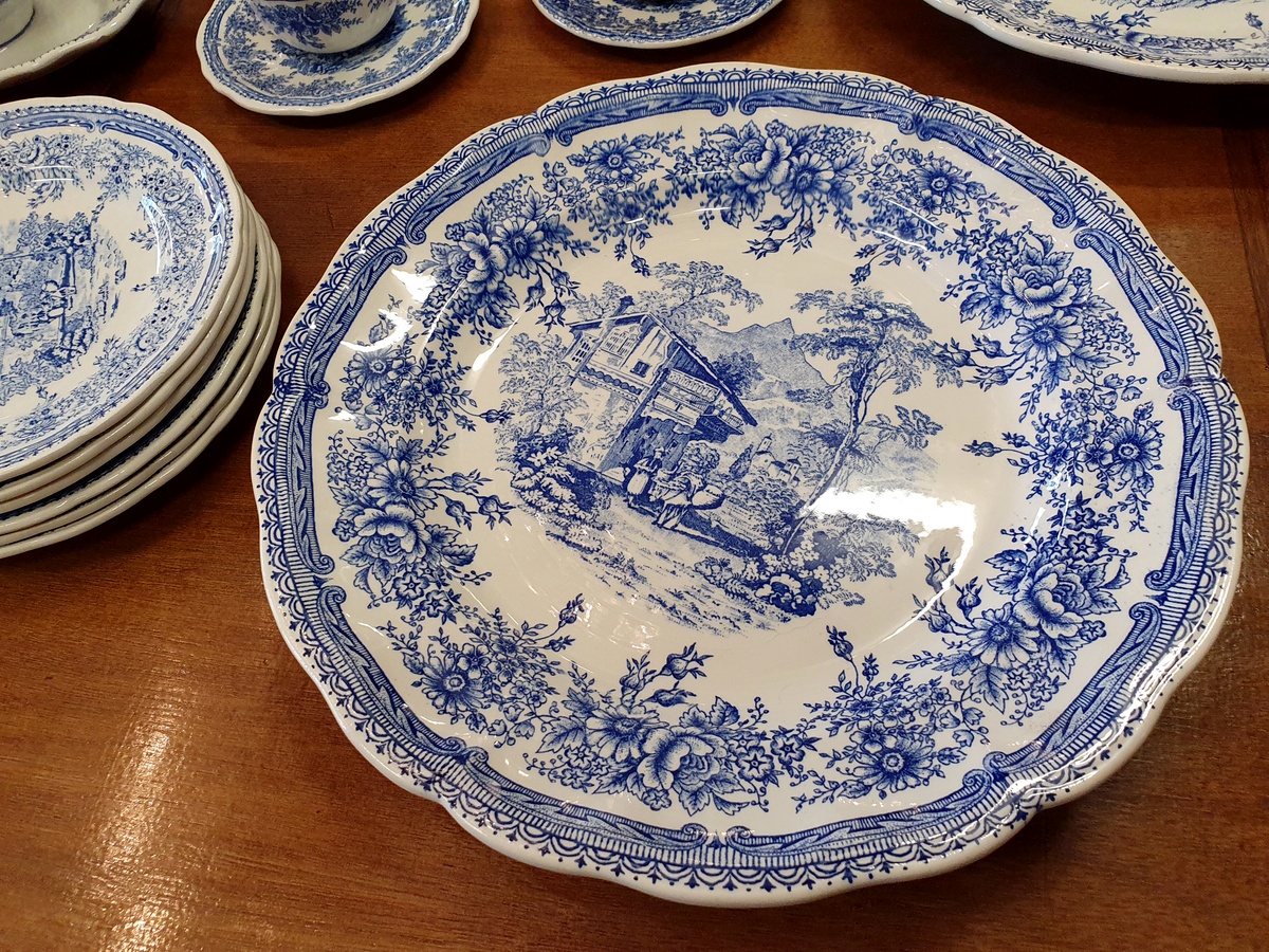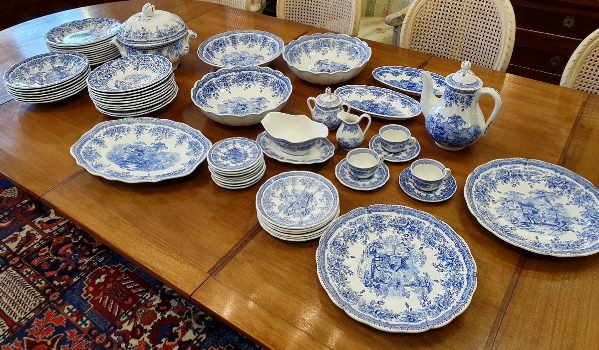 A French blue on white faience 58 piece dinner set, consisting of 10 soup bowls, 18 dinner plates, 6 side plates, 2 salad bowls, a sauce boat, a soup turren with lid, 6 serving platters, 3 coffe cups with saucers, coffee pot, sugar bowl and milk jug. The plates and bowls have delicately scalloped edges and are decorated with English style "Cottage" motifs and with flower borders. The undersides stamped with the Luneville's "Cottage", and Luneville's "Grand feu" stamps. Area of Luneville, North East France, circa 1930. Price is for the entire set.