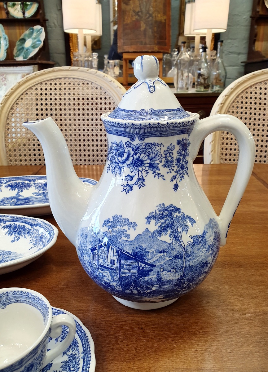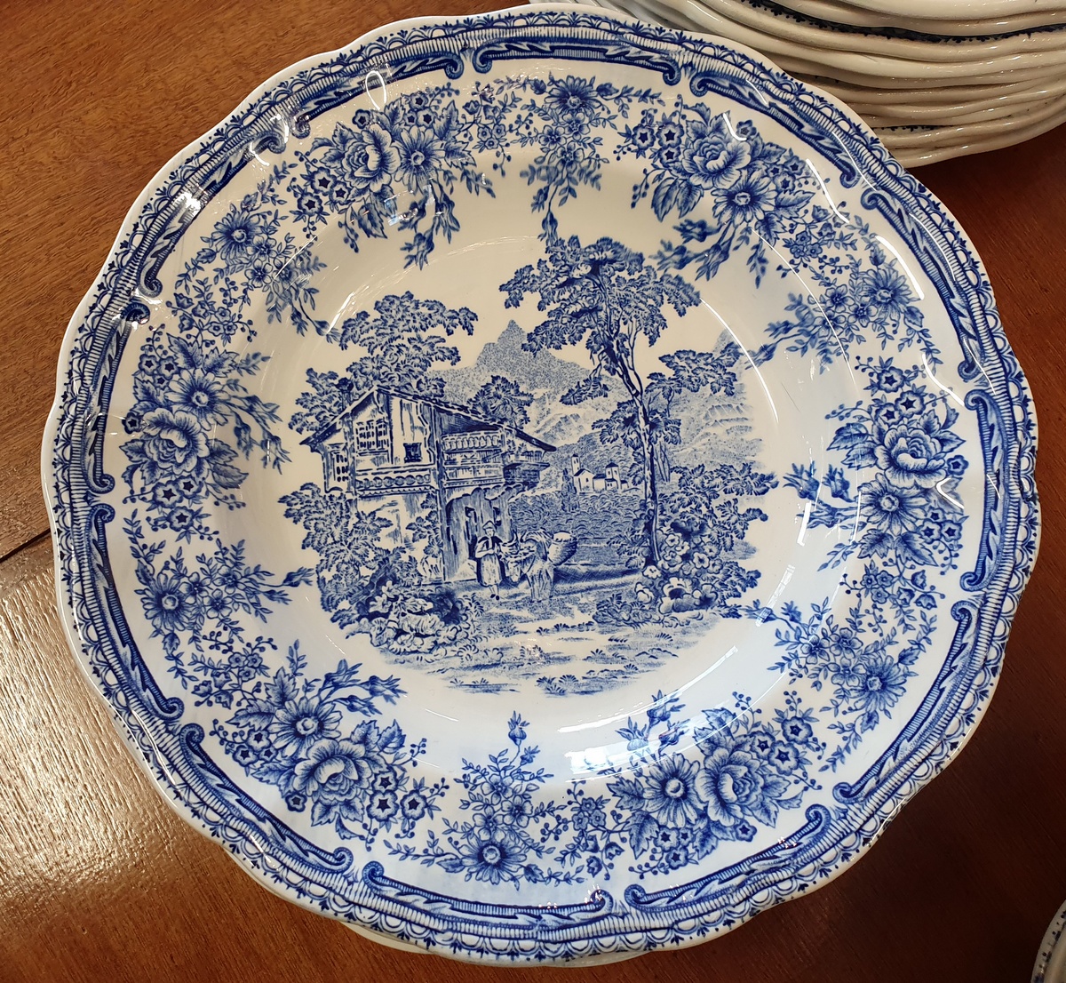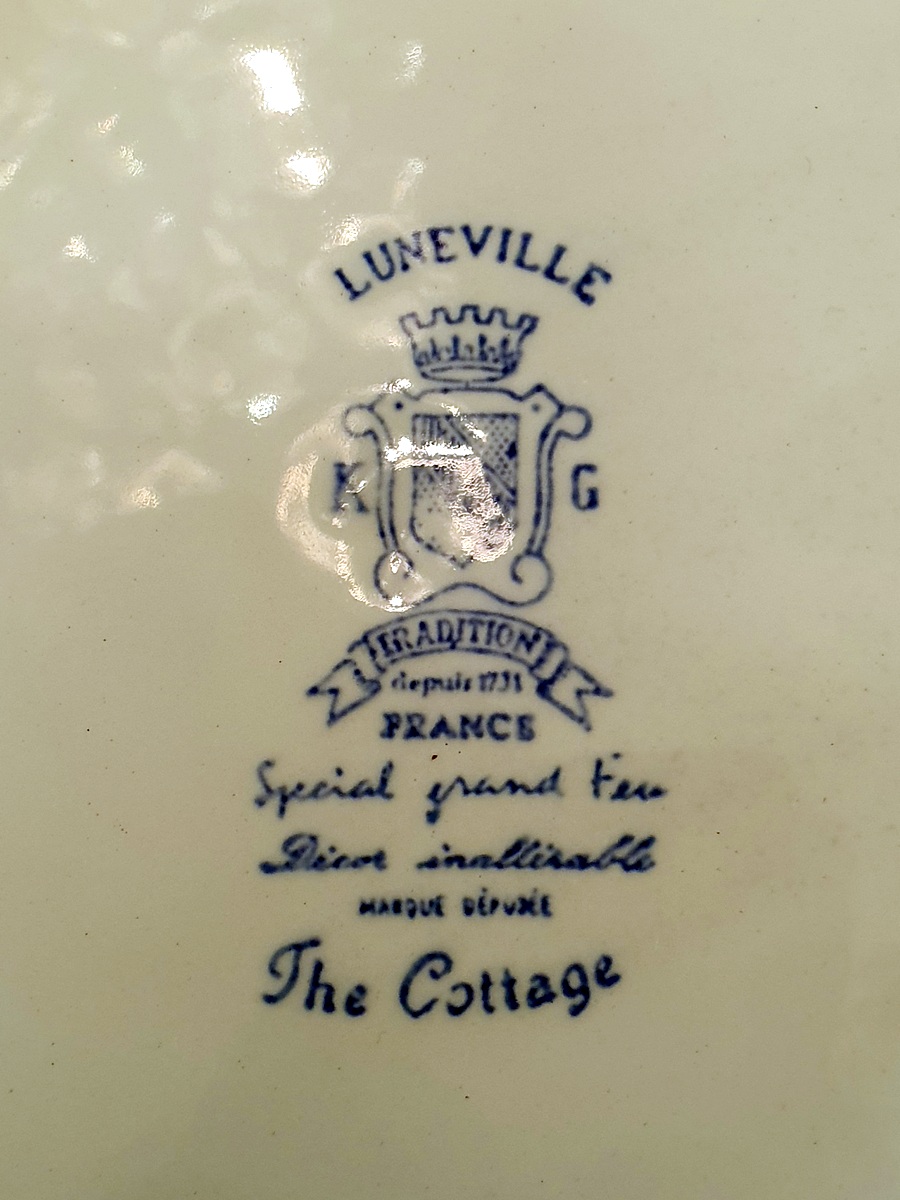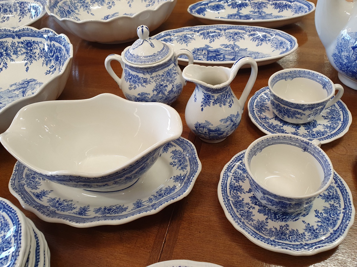 A French blue on white faience 58 piece dinner set, consisting of 10 soup bowls, 18 dinner plates, 6 side plates, 2 salad bowls, a sauce boat, a soup turren with lid, 6 serving platters, 3 coffe cups with saucers, coffee pot, sugar bowl and milk jug. The plates and bowls have delicately scalloped edges and are decorated with English style "Cottage" motifs and with flower borders. The undersides stamped with the Luneville's "Cottage", and Luneville's "Grand feu" stamps. Area of Luneville, North East France, circa 1930. Price is for the entire set.