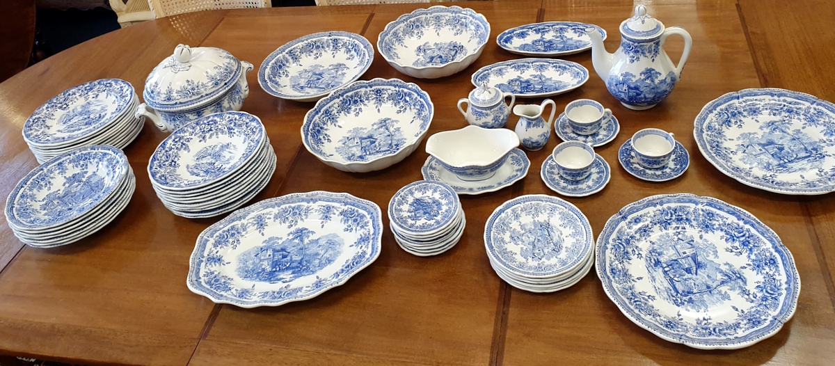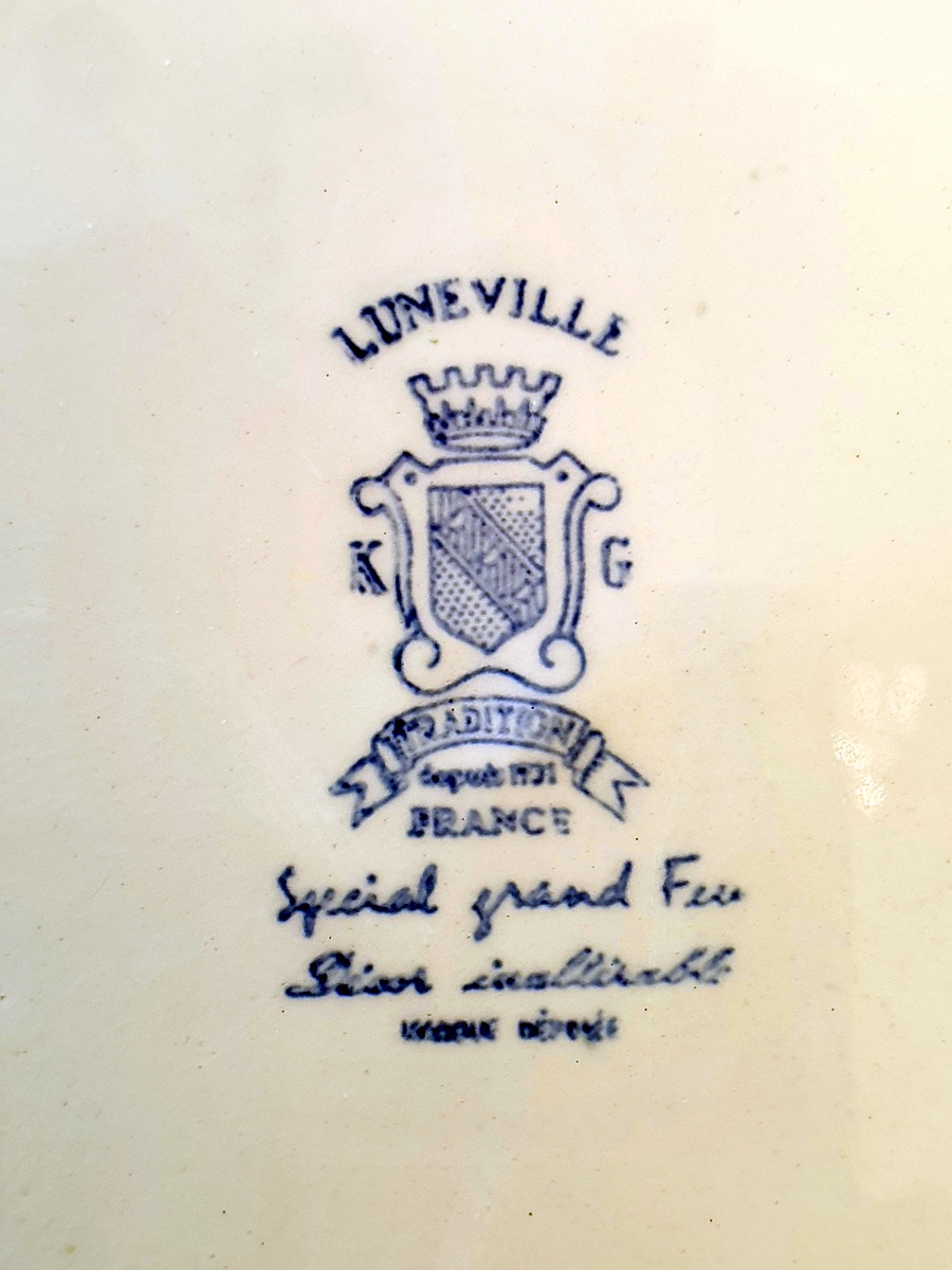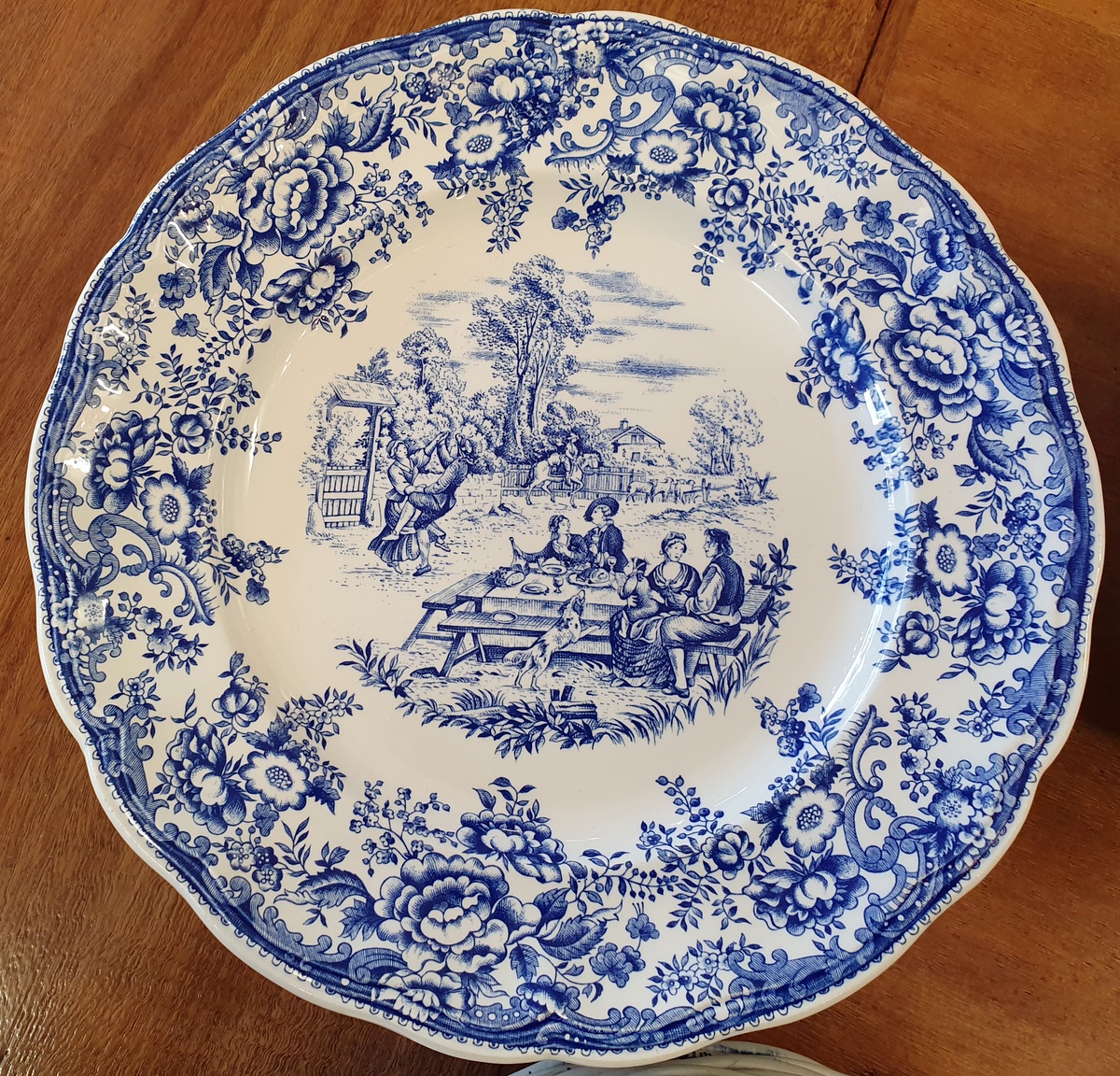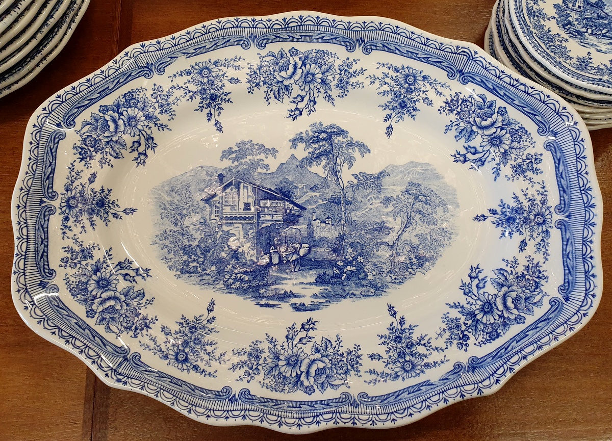 A French blue on white faience 58 piece dinner set, consisting of 10 soup bowls, 18 dinner plates, 6 side plates, 2 salad bowls, a sauce boat, a soup turren with lid, 6 serving platters, 3 coffe cups with saucers, coffee pot, sugar bowl and milk jug. The plates and bowls have delicately scalloped edges and are decorated with English style "Cottage" motifs and with flower borders. The undersides stamped with the Luneville's "Cottage", and Luneville's "Grand feu" stamps. Area of Luneville, North East France, circa 1930. Price is for the entire set.