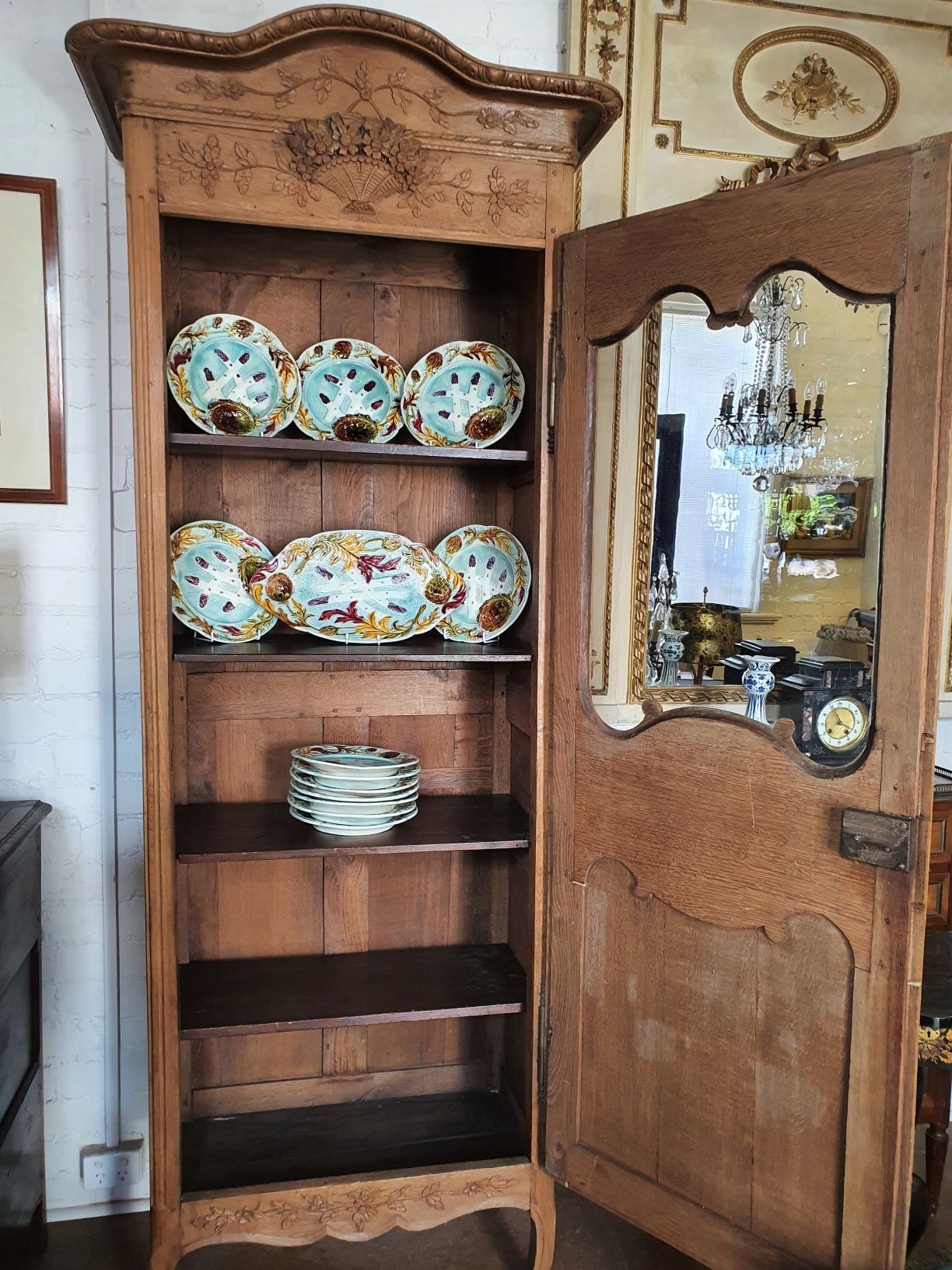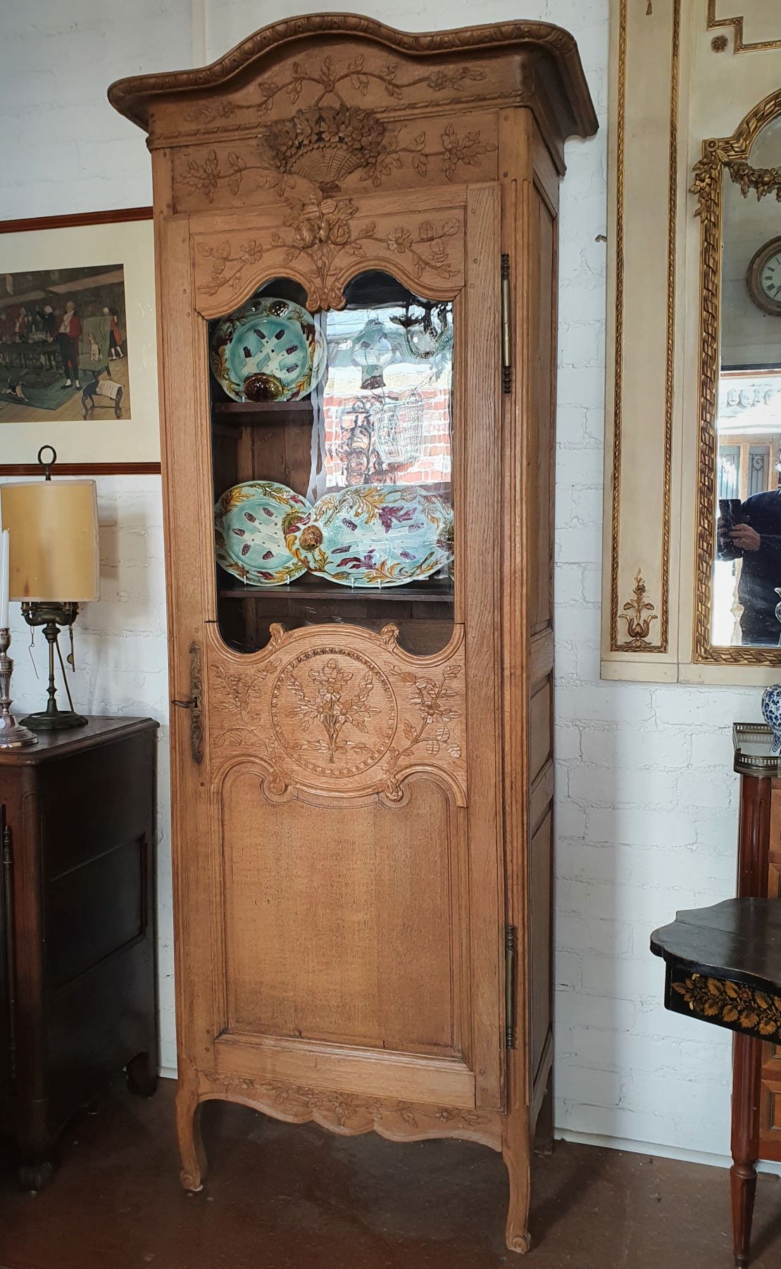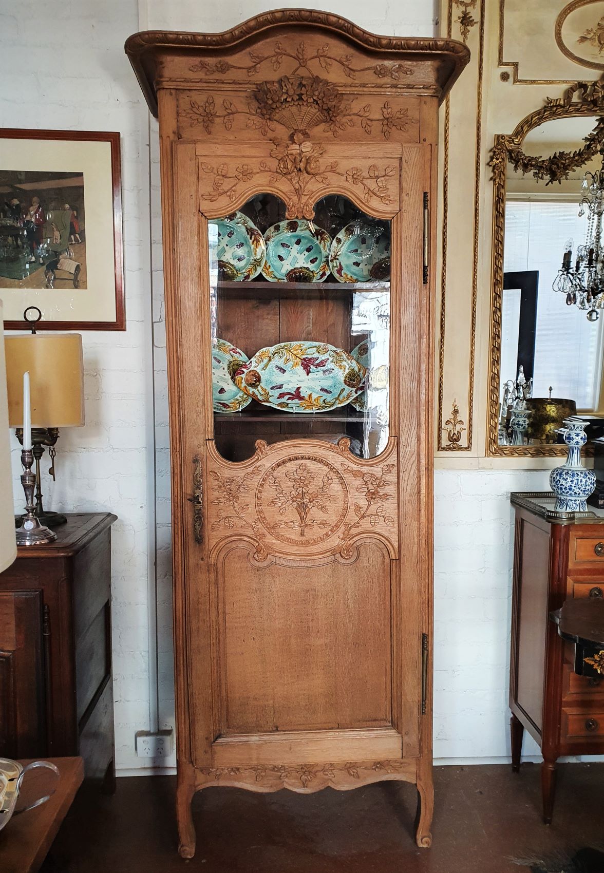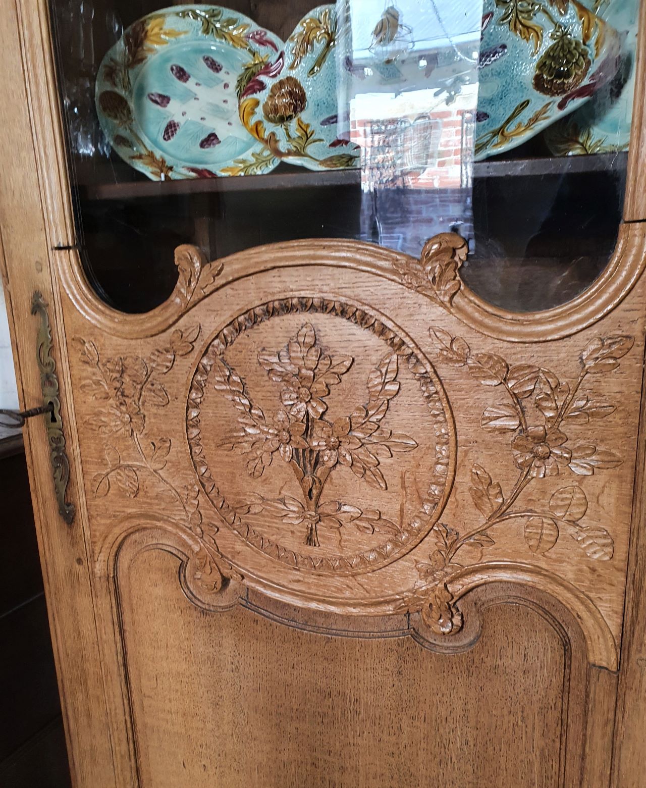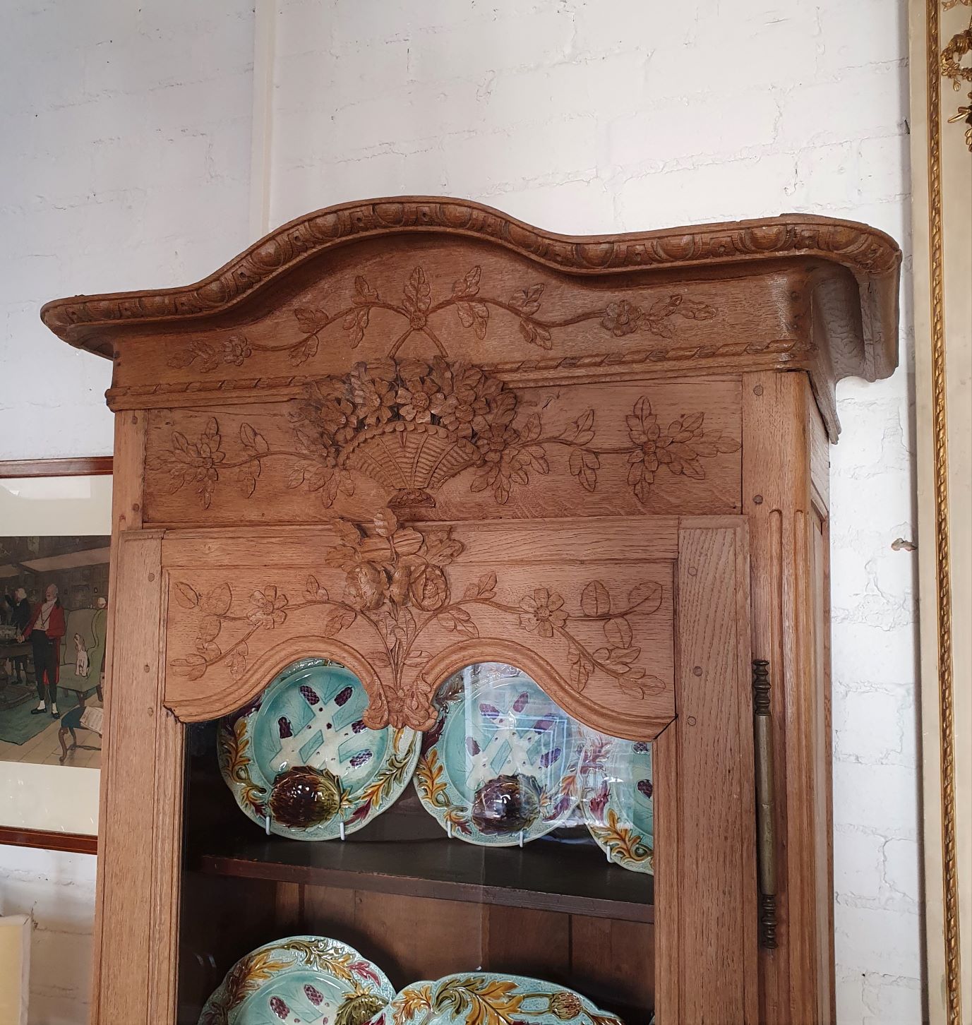 A 19th century French Louis XV style haut-relief carved solid oak and glazed single door “Vitrine“, the “Chapeau de Gendarme” pediment decorated with a bouquet of flowers (an allegory for Spring Time) above an out-sized foliate scroll, the panels of the doors with haut-relief foliate scrolls. The top door panel fitted with a pane of clear glass, the oak timbers with a wonderful, luminous patina. Area of Normandy, circa 1860.