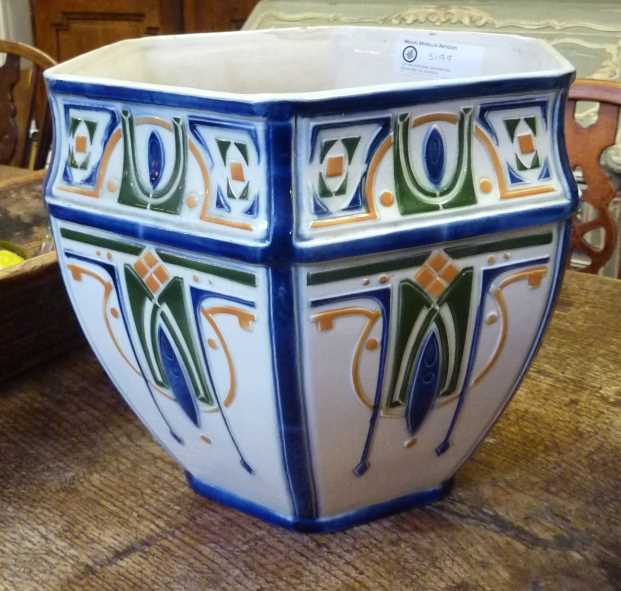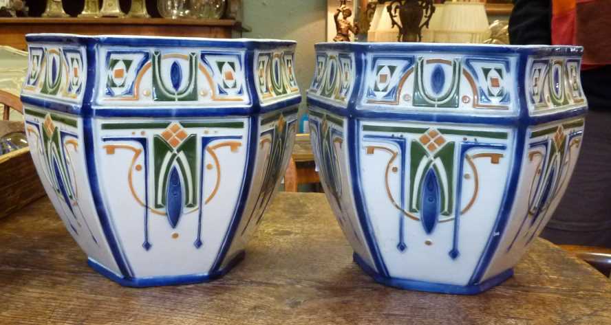 An elegant and strikingly decorated pair of early 20th century French Art Deco period glazed majolica cache-pots (pot plant holders). Manufacture of St. Clement, circa 1930. (See also vase, stock id 3786).