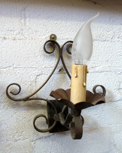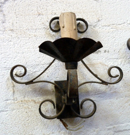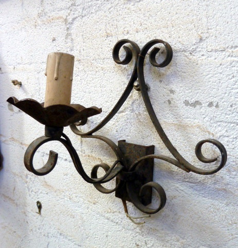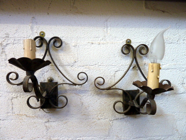 A pair of early 20th century French provincial wrought iron wall lights, each with single arm. Typical artisanship of Normandy, circa 1930.