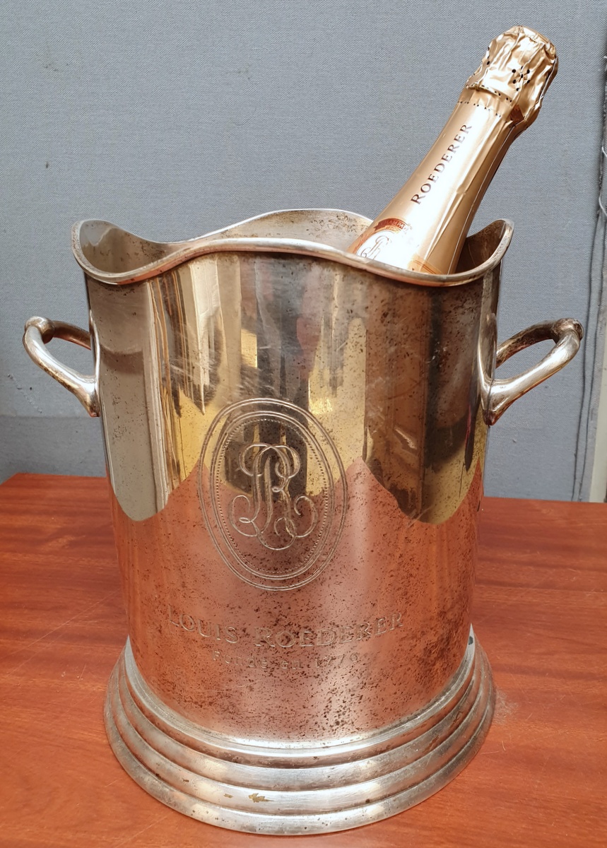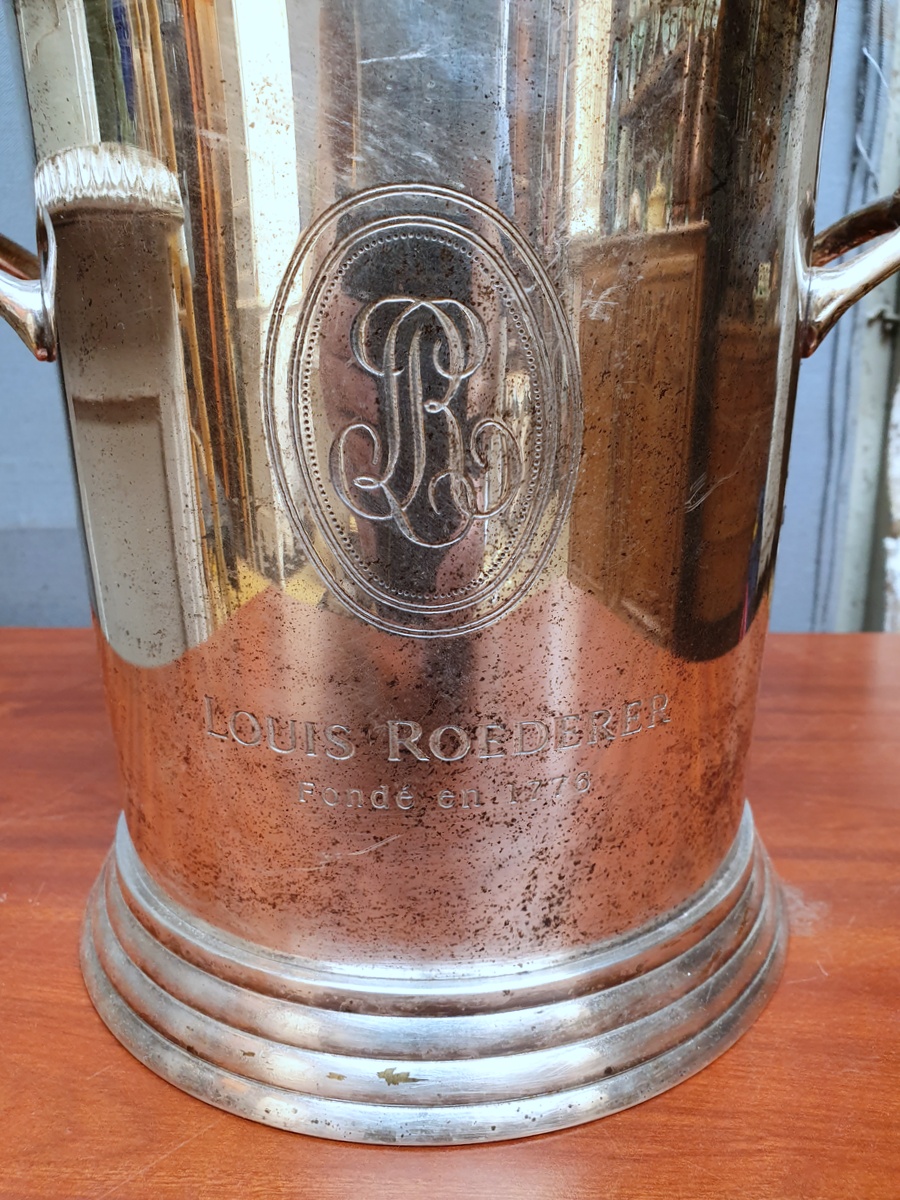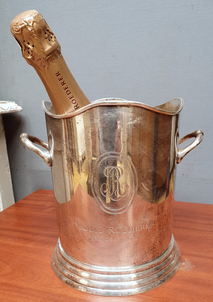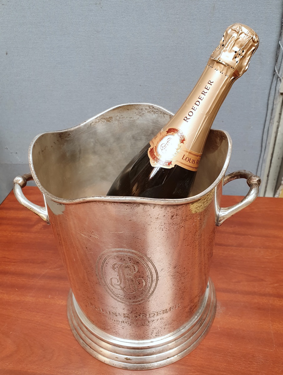 A vintage French turned silver plated brass Champagne ice bucket, the top shaped and moulded and fitted with elegant handles, with the original, etched advertising badge for “Louis Roederer” Champagne.