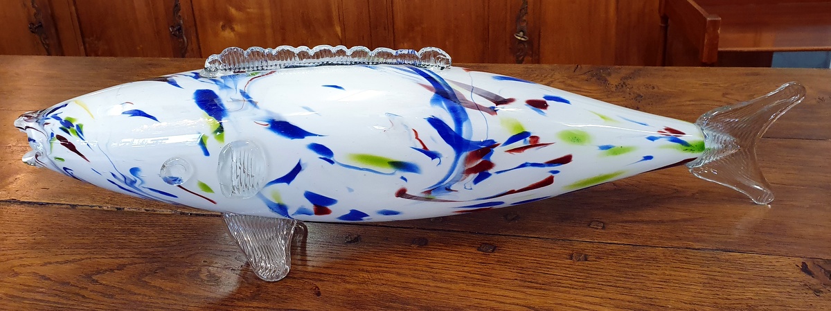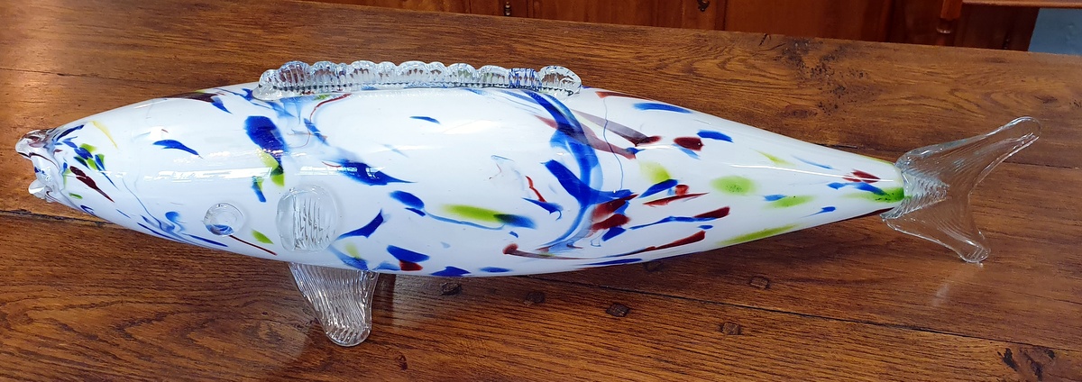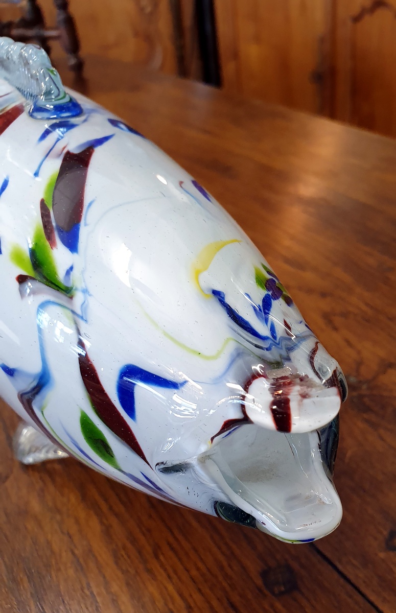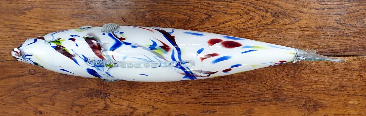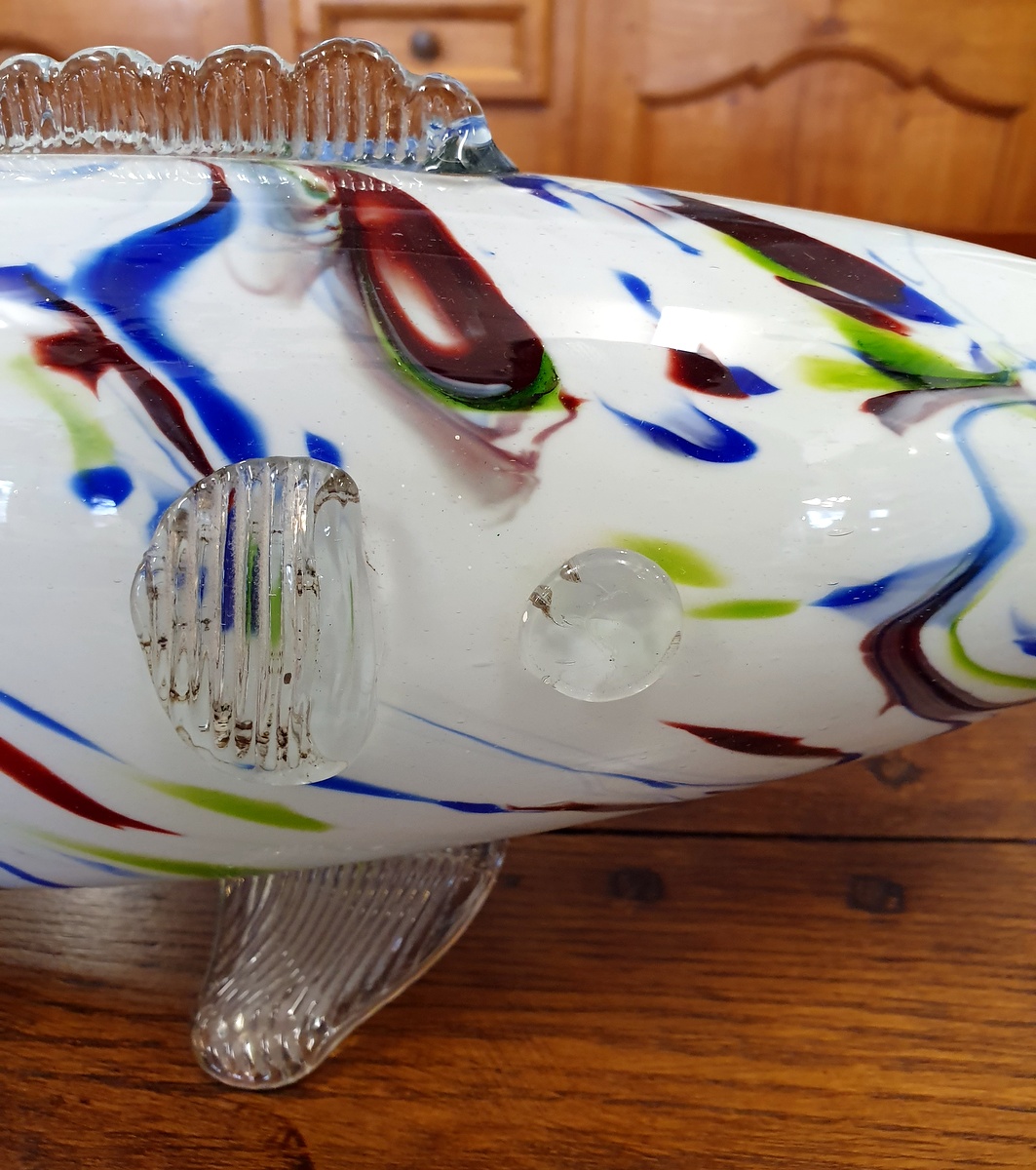 A mid 20th century hand-blown Murano glass fish standing on its fins and tail, the body decorated with multi-coloured 'rainbow' glass. Area of Venice, circa 1960.