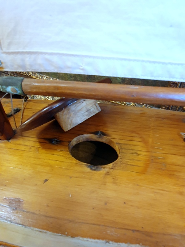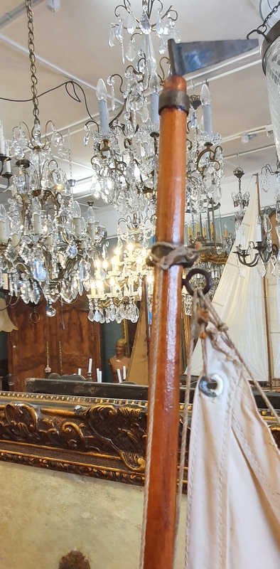 A vintage pond yacht made with classic Bermuda rigging, workshop-built (note the hand-carved mahogany hatch), retaining its original, stained sails and its stand.  A true pond-sailor, the bottom of the hull is lead-ballasted. Area of England, 1950s.