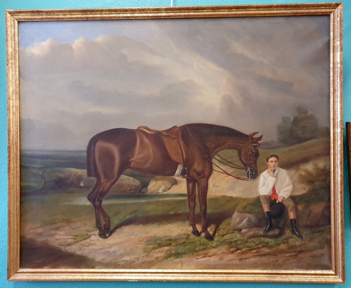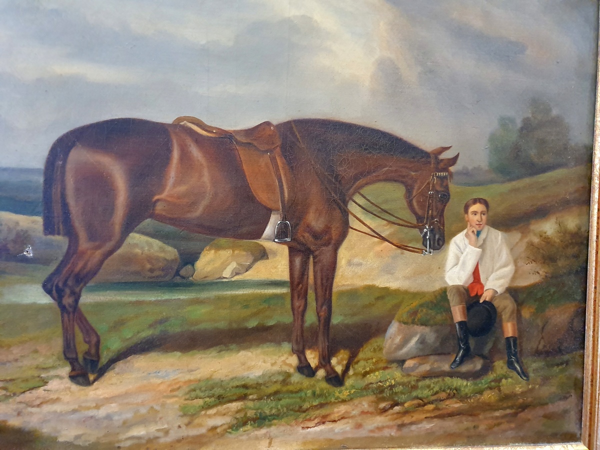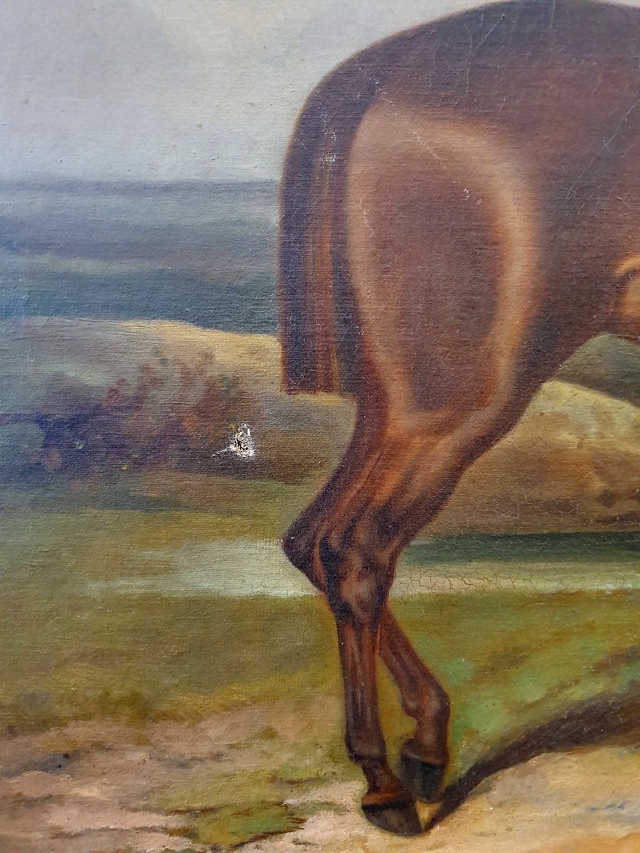 In good and un-restored condition. A repairable, small hole in the canvas, just under the horse's tail.