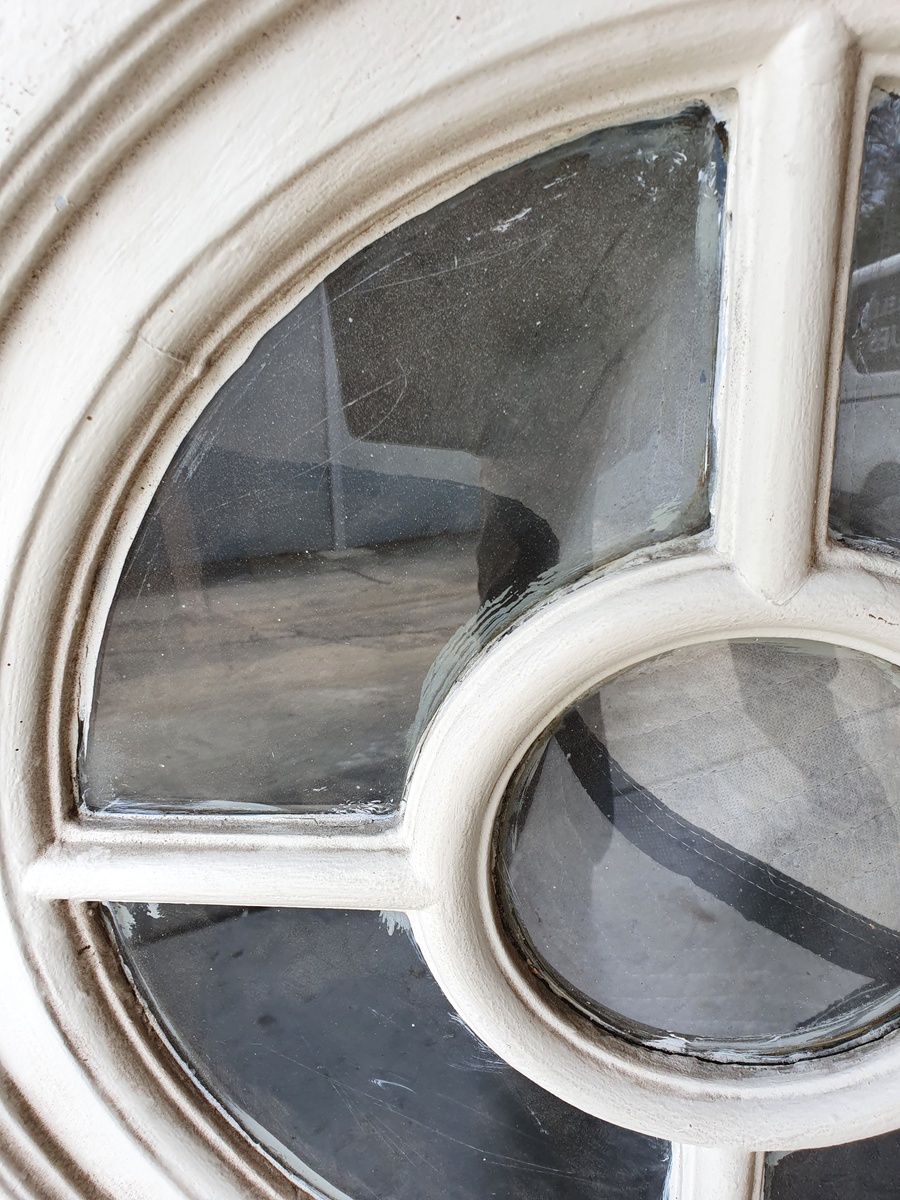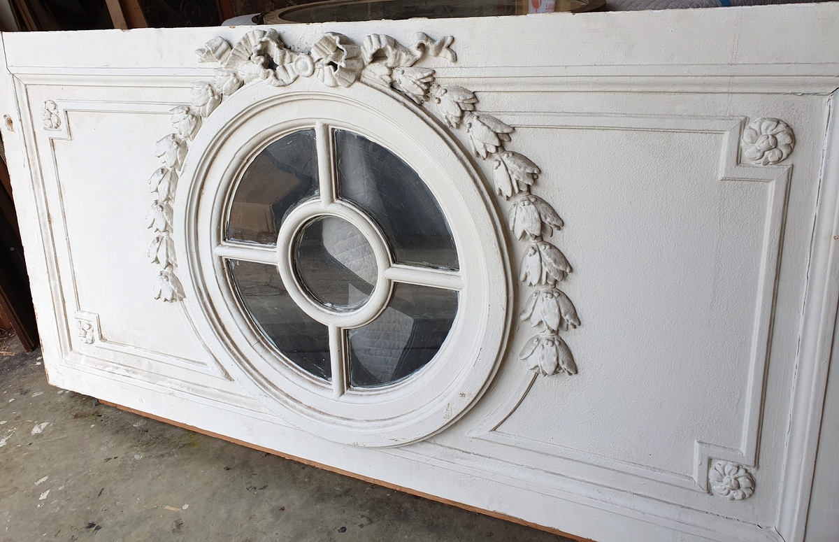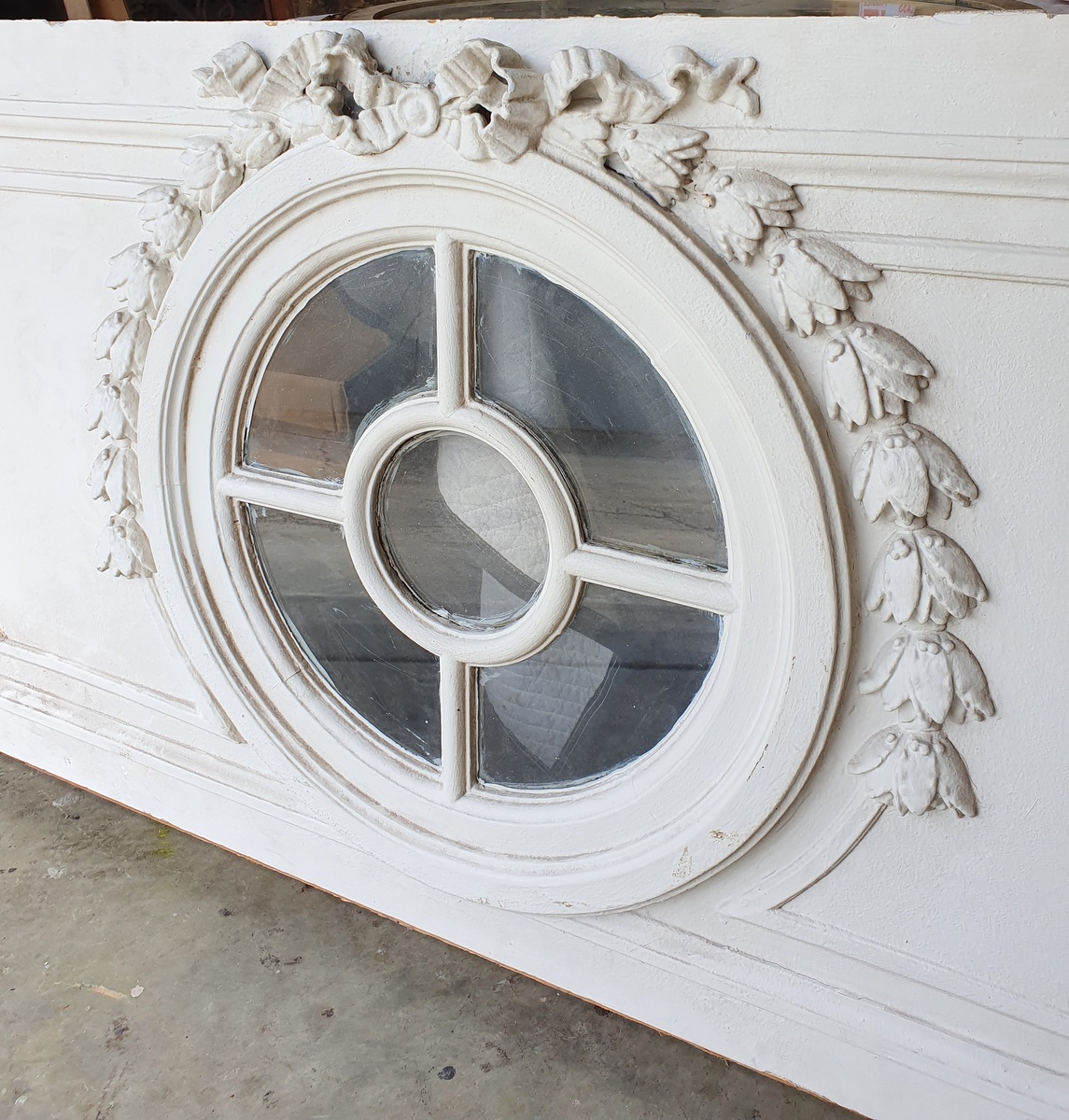 A large French Napoleon III period, Louis XVI style carved and painted over-door panel, fitted with a central 'Oeil de Boeuf' window, surmounted by haut-relief carved laurel wreaths and out-sized knotted bows. This type of window is usually fitted with mirrors. Area of Paris, circa 1860.