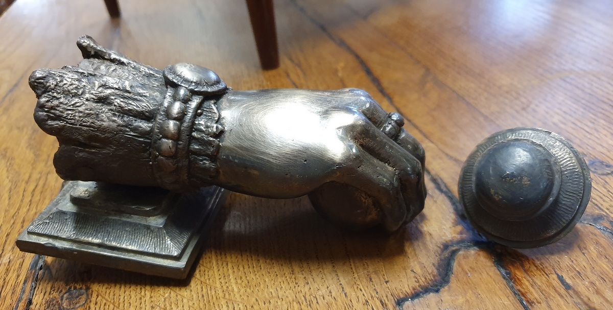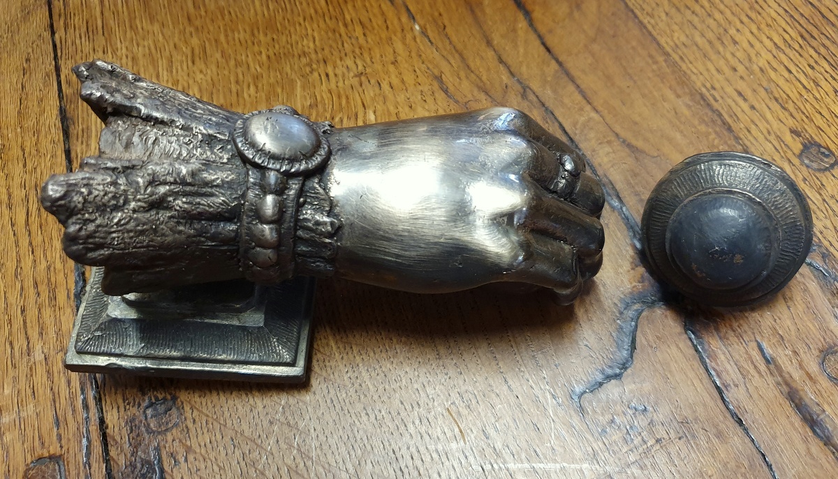 A good quality lost-wax cast and patinated bronze door knocker in the shape of a clenched hand hinged onto a square plinth plate, with its separate striker plate. The hinged hand is lifted, to strike down onto the strike plate.
