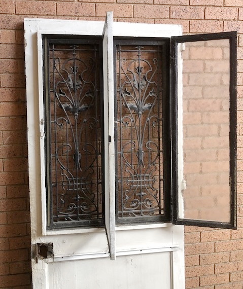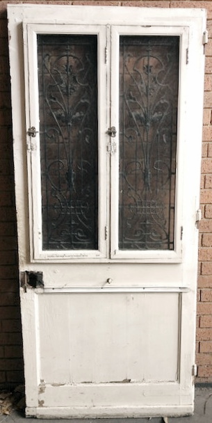 A 19th century French solid pine entrance door of classic design and with a good width, a pair of windows opening behind the two cast iron grilles. The door is traditionally jointed and moulded, the grilles are decorated with thistles and with stylised foliate scrolls. Area of Isle de France (Greater Paris), circa 1890.