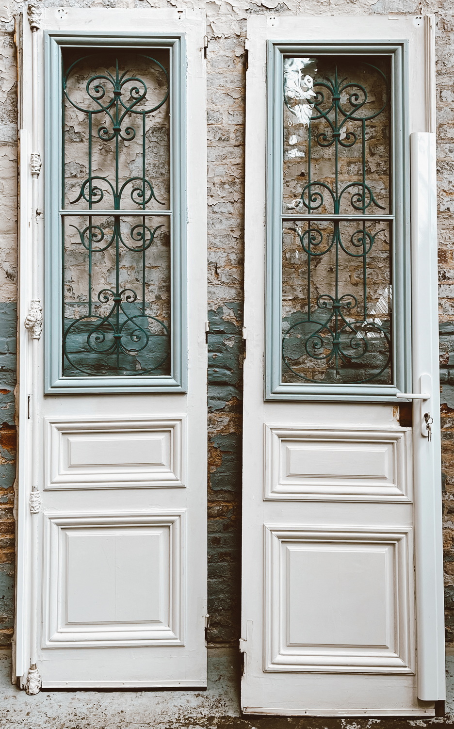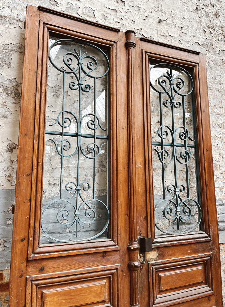 A large pair of 19th century French painted pitch pine and cast iron entrance doors of excellent size and of Classical proportions. Each door with a glazed window opening behind a scrollwork-pattern cast iron grille, above panelled and moulded bottom-sections. Retaining the original cremorne bolt. Area of Paris, circa 1880.