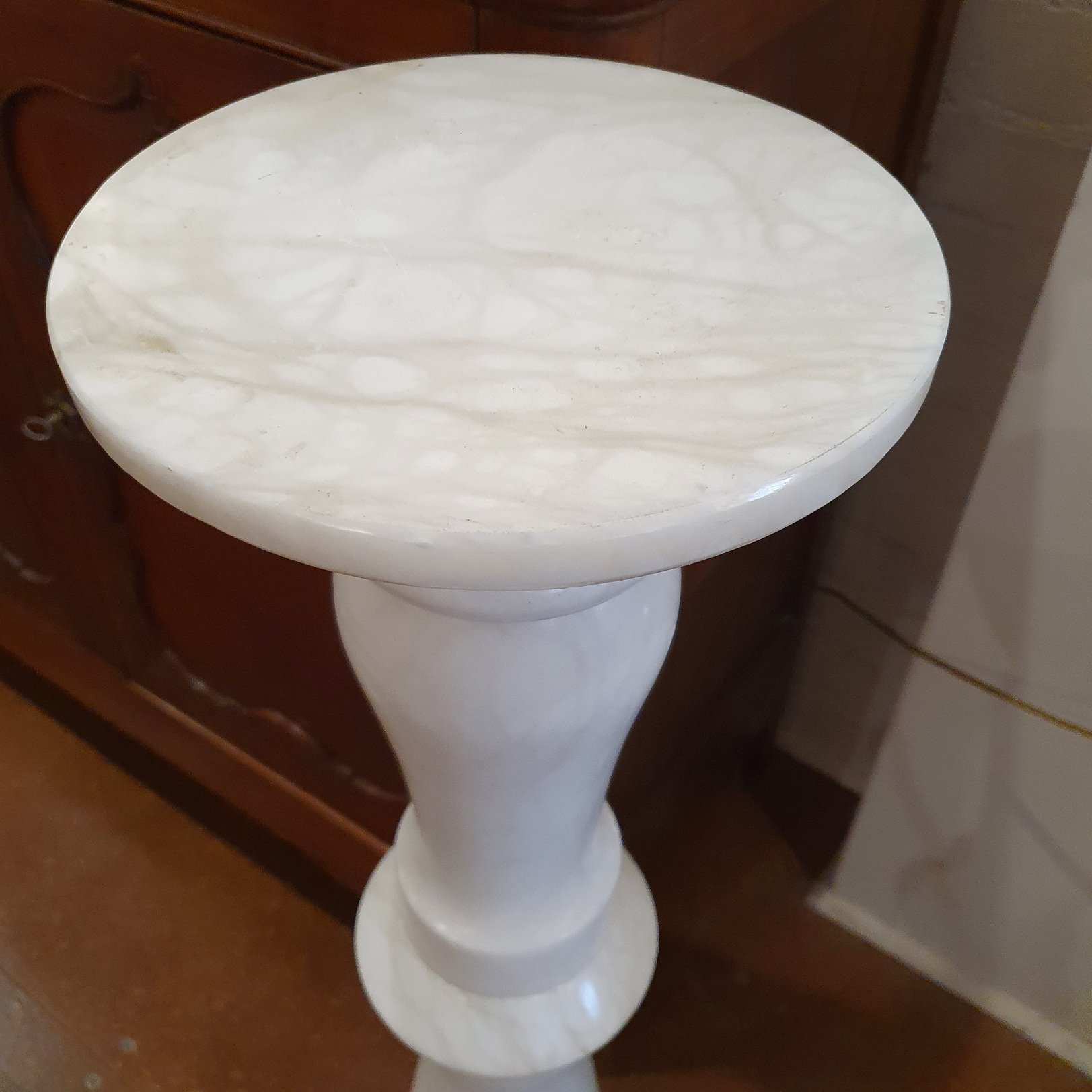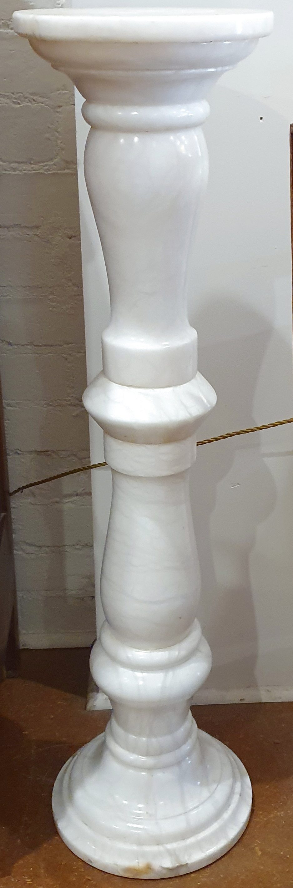 A tall, Italian turned alabaster vase and statuette pilaster stand, the upright decorated with Classical baluster turned mouldings. Area of Volterra, Tuscany, circa 1950.