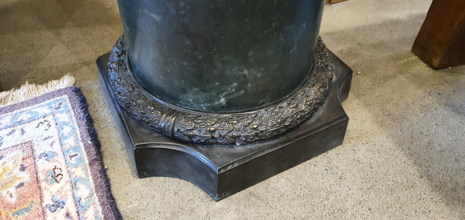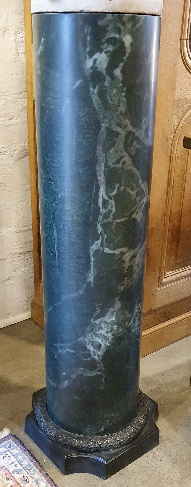 A French Louis XVI style turned solid dark green and veined Neoclassical marble pedestal, designed as a column which fits onto a finely cast bronze plinth which is decorated with haut-relief acanthus leaf patterns. This column is an ideal as a support for a bust or for an urn. Area of Paris, circa 1900.