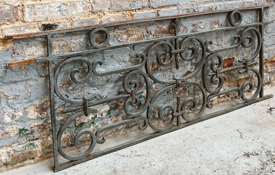 A 19th century French wrought iron balcony grille decorated in a geometric scroll pattern. This grille can be reused as a balcony, or our workshop can build to measure a traditional French “cache-radiateur”, a long and narrow console table using this grille. For examples of a similar console, please see attached photo below.