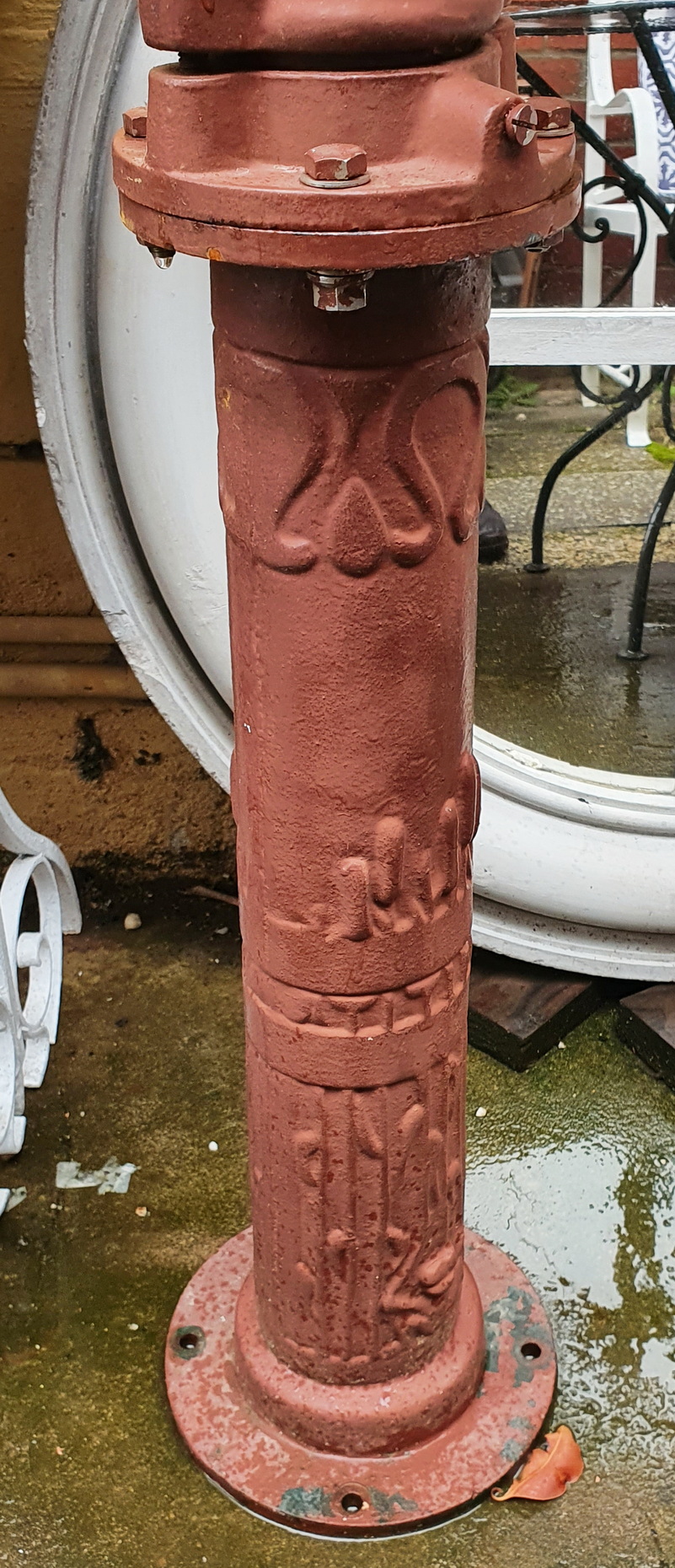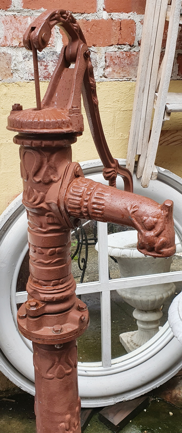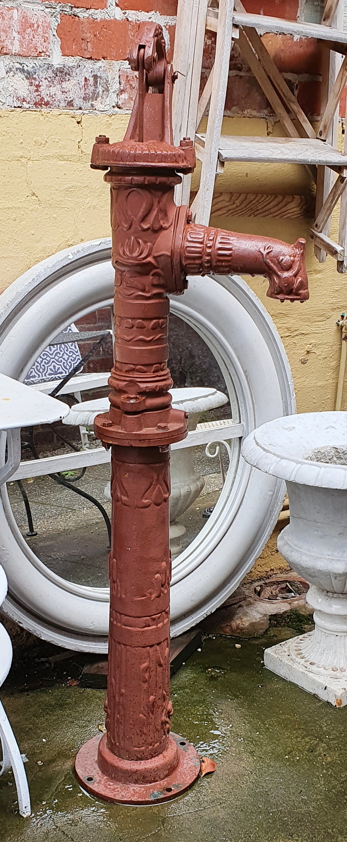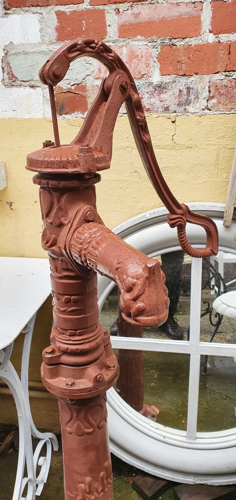 A vintage French provincial cast iron water fountain, the vertical shaft with a hand-operated handle to pump water up from a well. Externally decorated with haut relief stylised foliate motifs, the large spout decorated with a clinging frog. France, circa 1960.