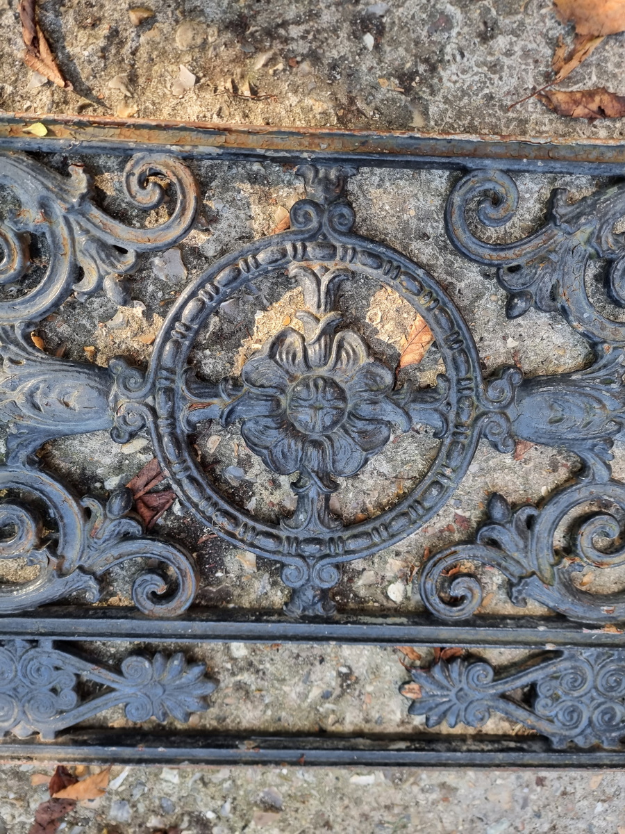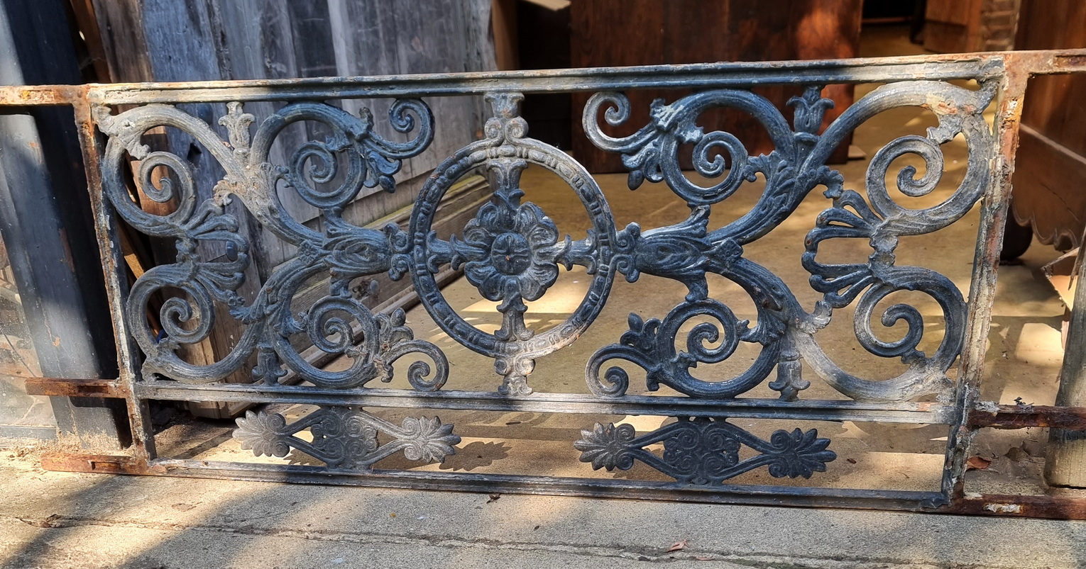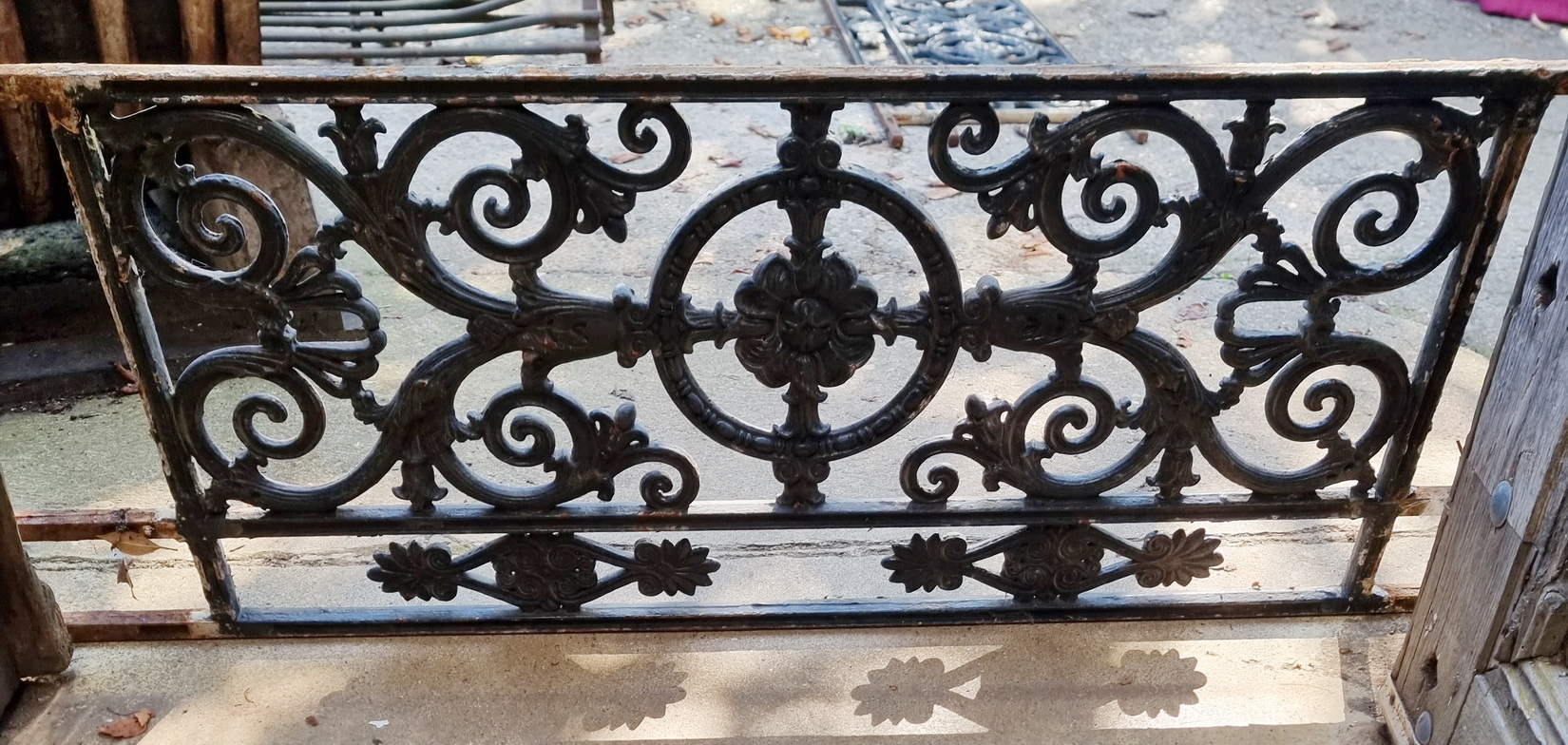 A set of four early 19th century French Restauration, Charles X period cast iron balcony grilles, each decorated with stylised Neoclassical scroll patterns and a central medallion with a Patera motif. Please note the fine quality and crispness of the ironwork. Area of Paris, circa 1820.