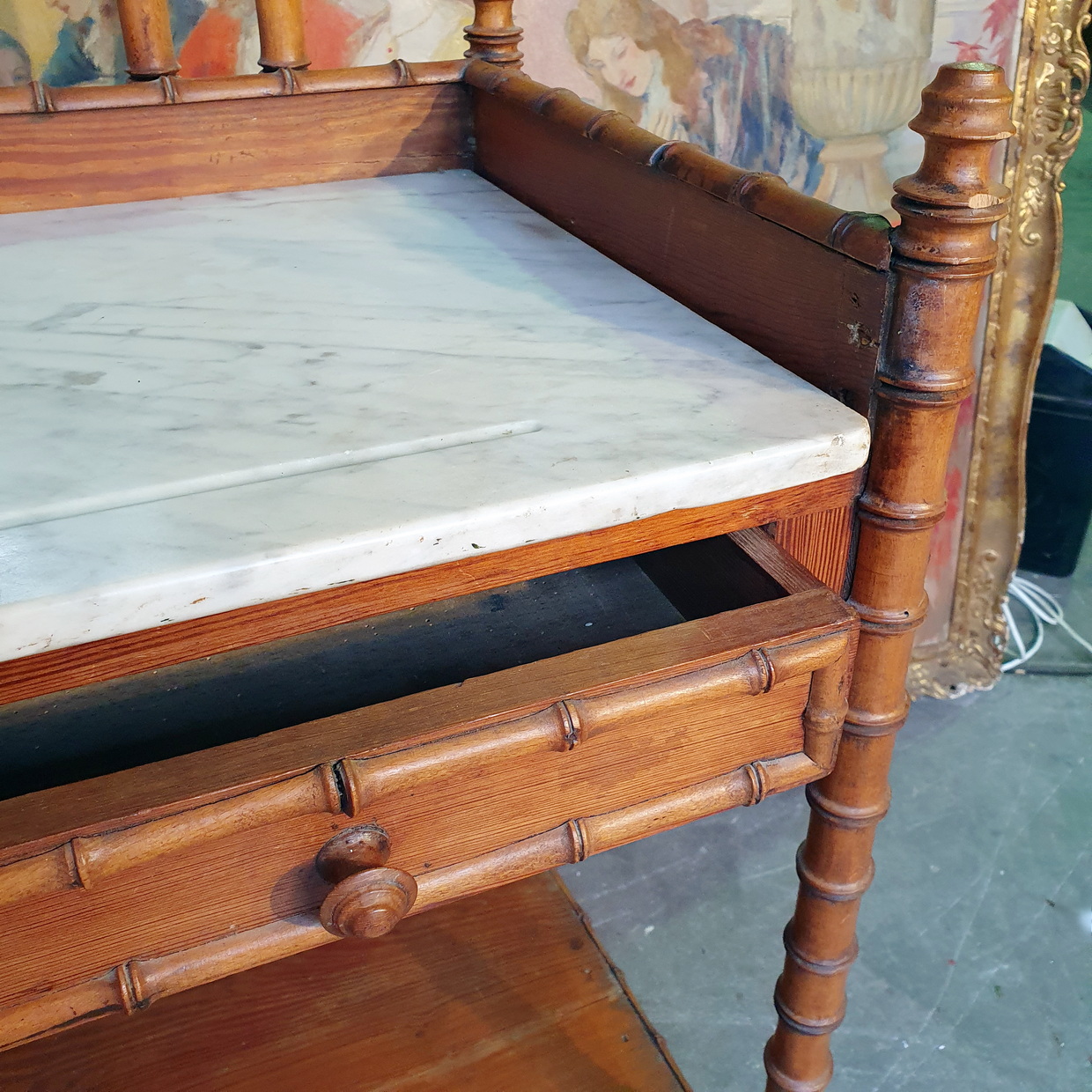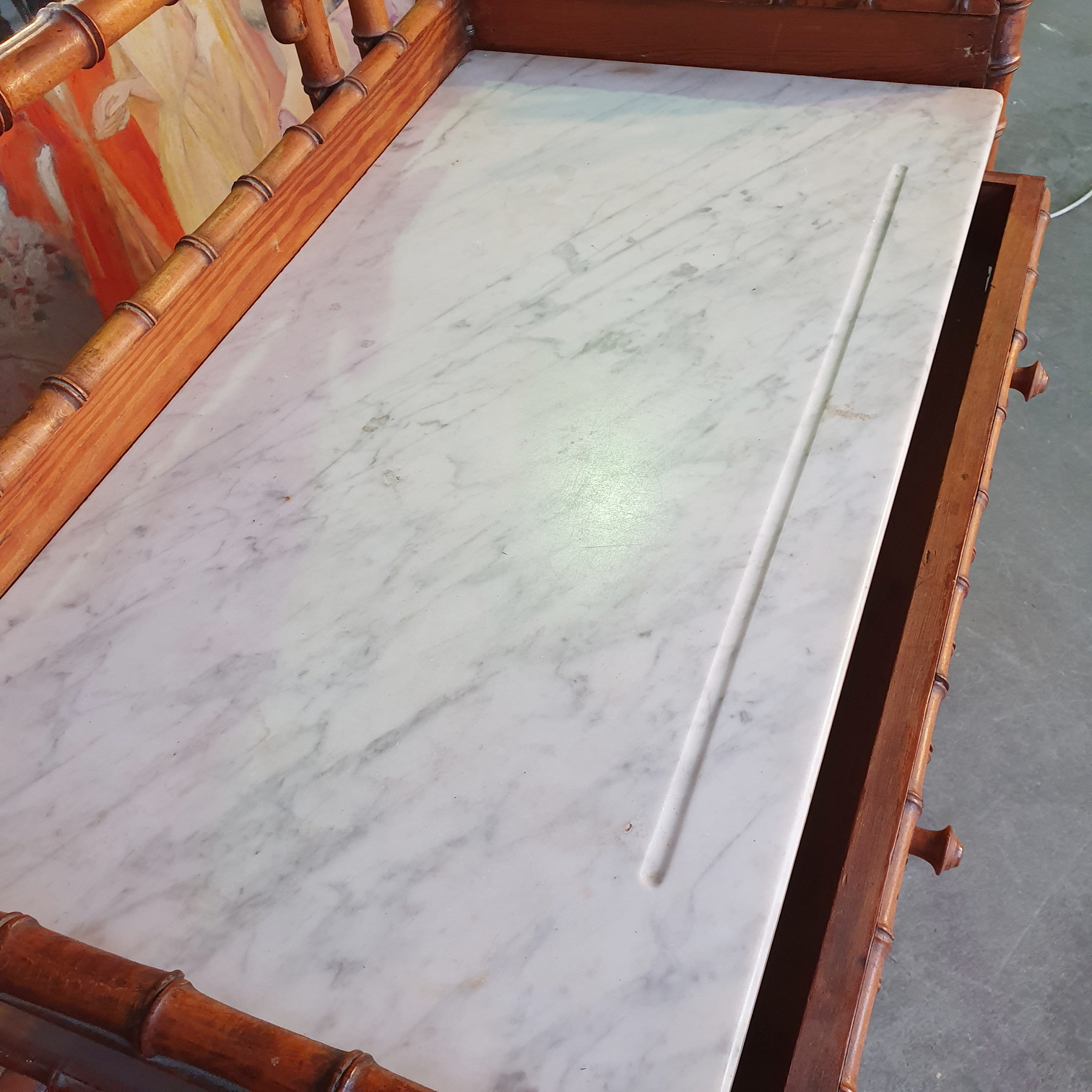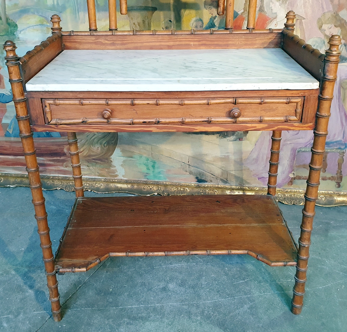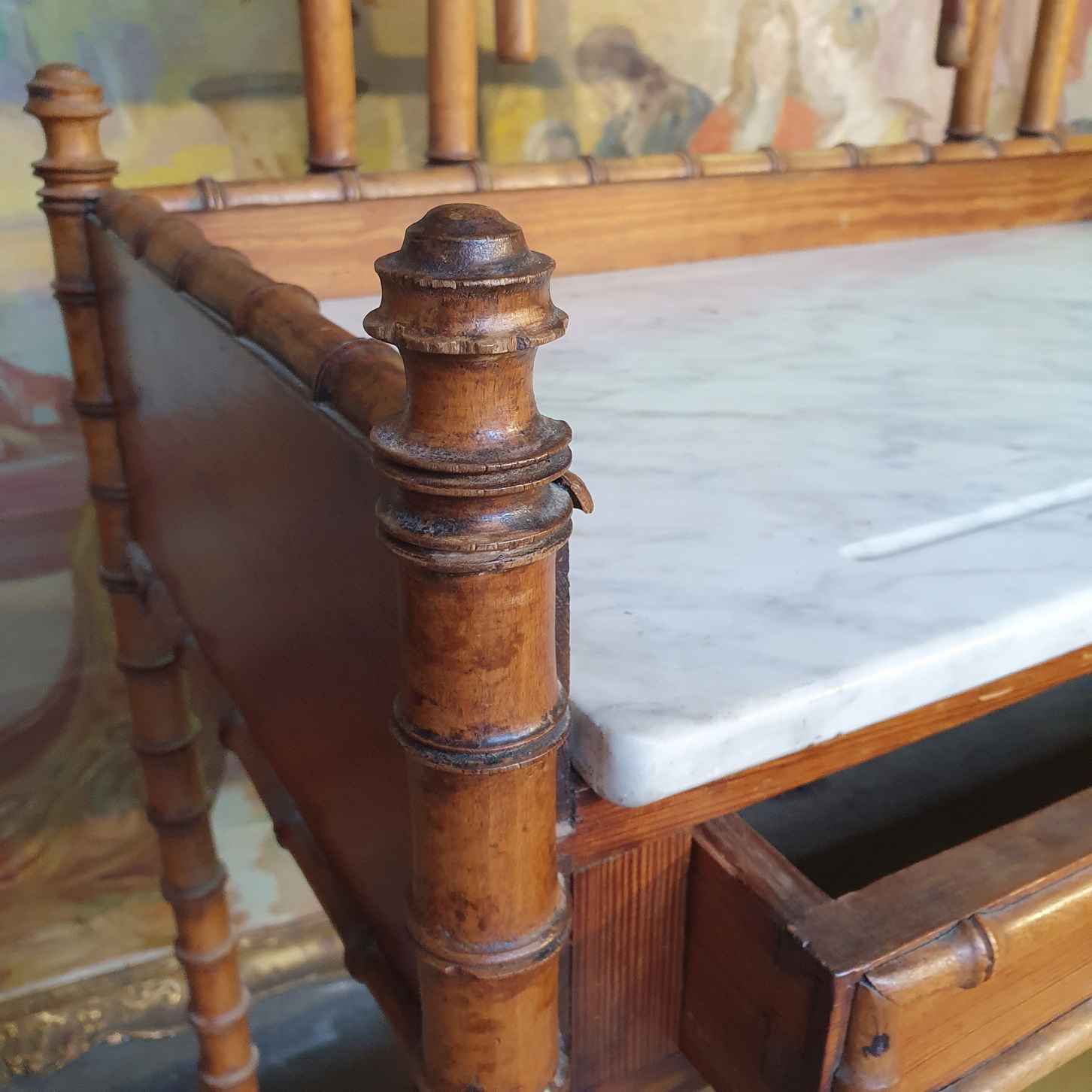 A 19th century French Napoleon III period beechwood and pine 'Coiffeuse' dressing table decorated with turned and carved faux-bamboo motifs, the swivelling mirror retaining its original mirror plate, above a tall dressing table fitted with its original Carrara marble top, above a shallow drawer. A shaped shelf hangs between its four turned legs. Area of Paris, circa 1870.