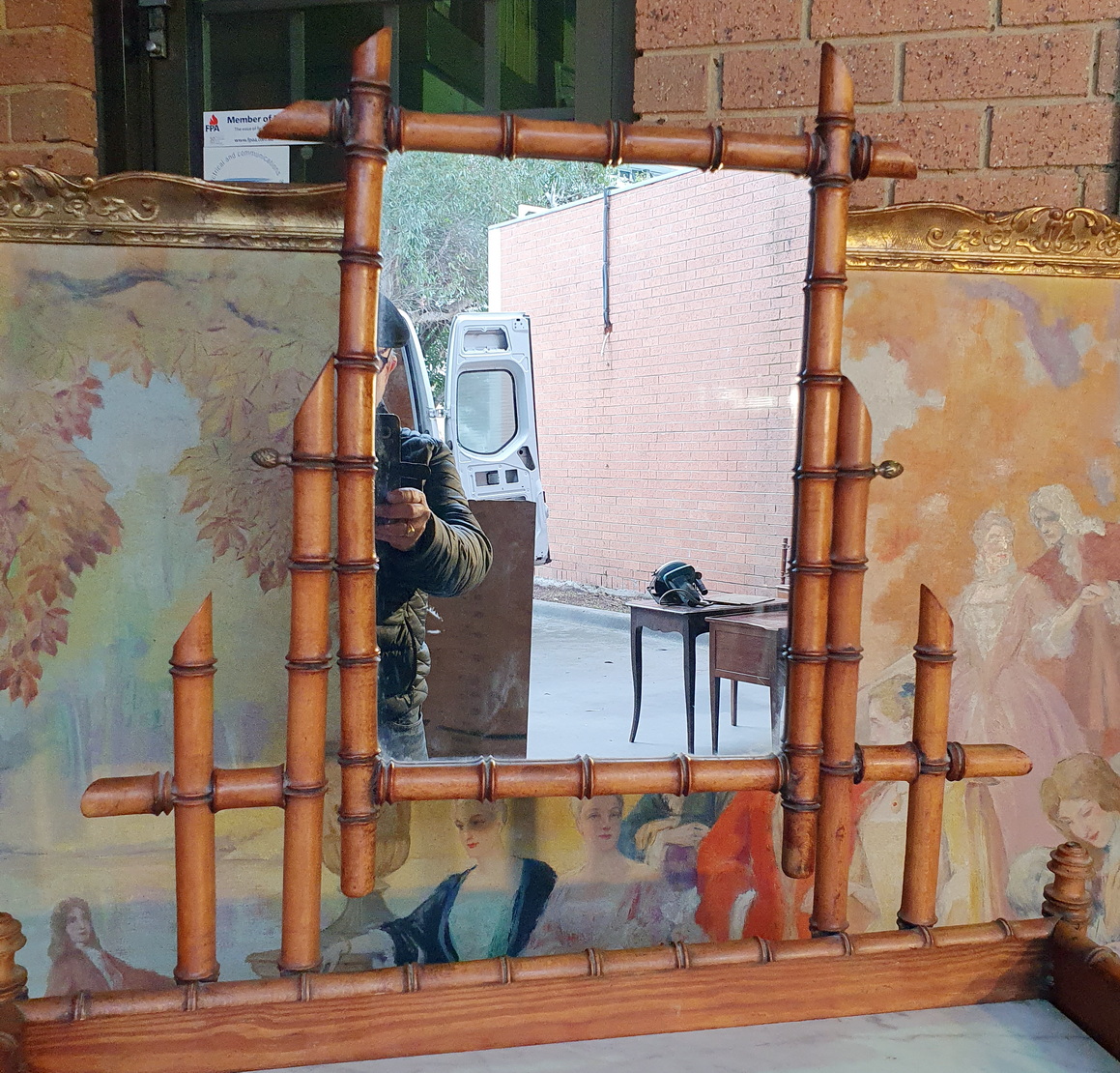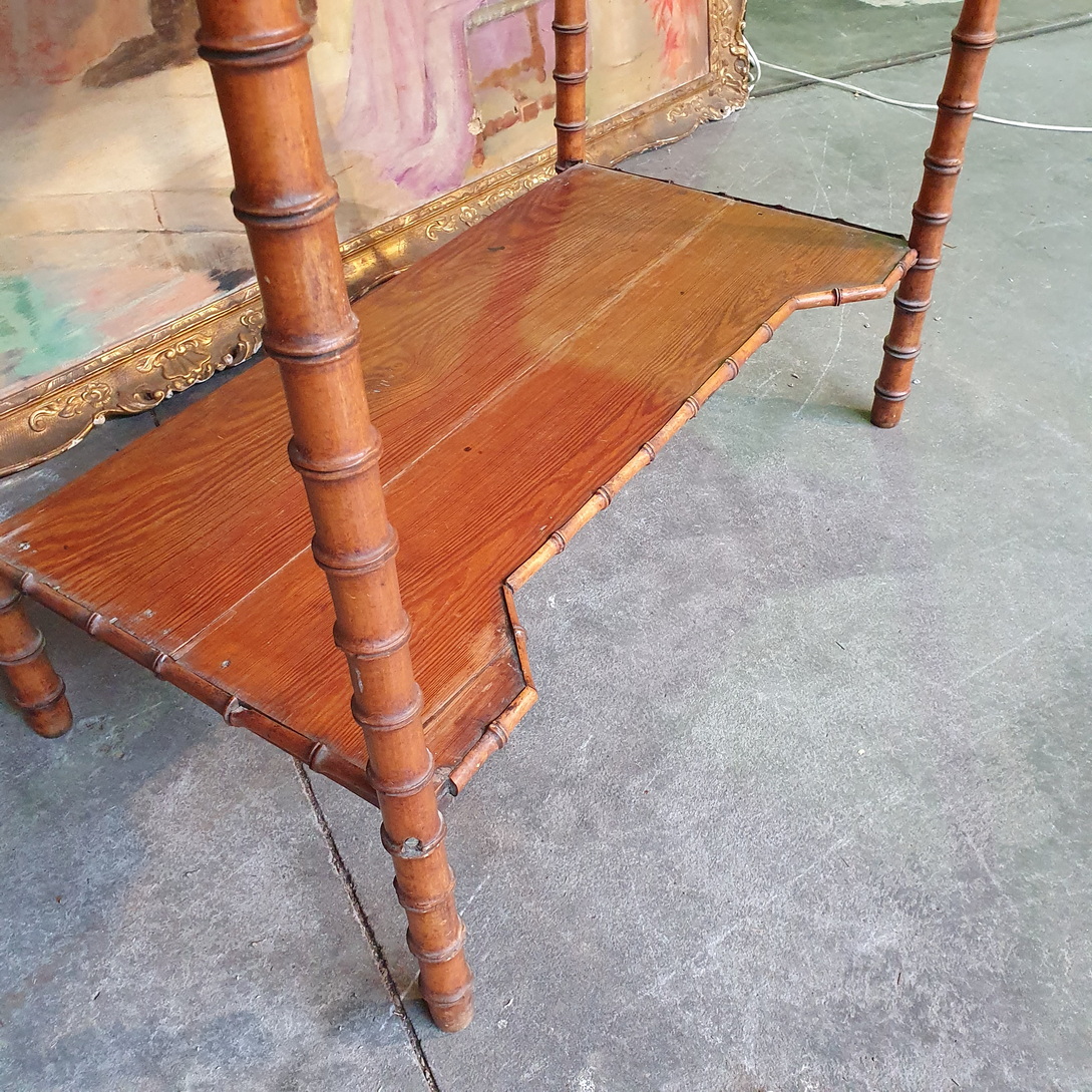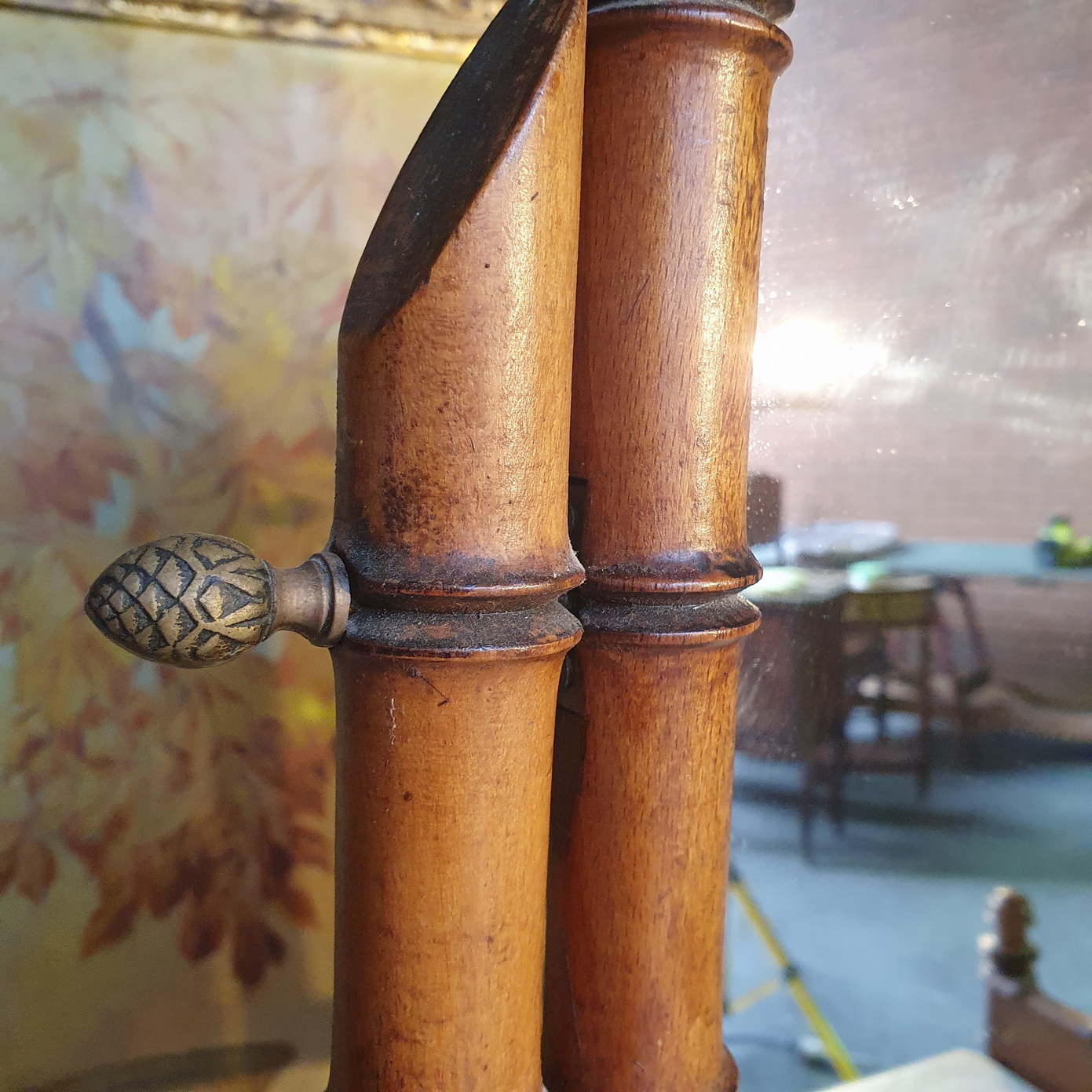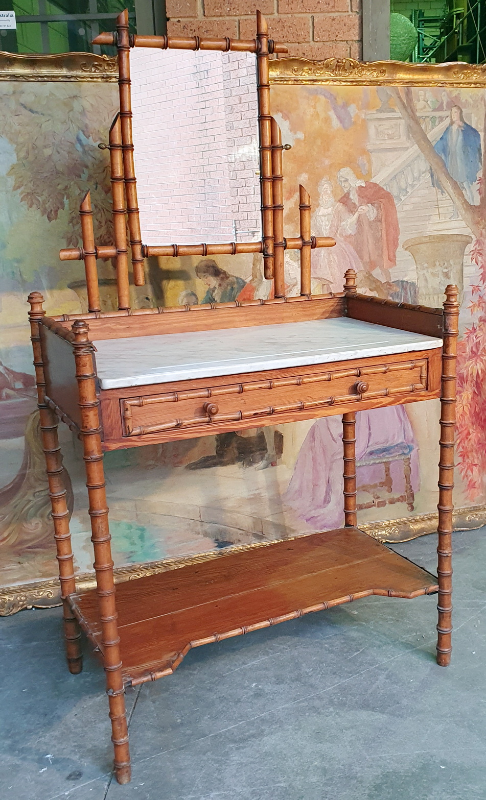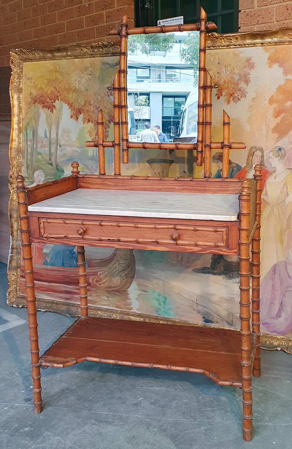 A 19th century French Napoleon III period beechwood and pine 'Coiffeuse' dressing table decorated with turned and carved faux-bamboo motifs, the swivelling mirror retaining its original mirror plate, above a tall dressing table fitted with its original Carrara marble top, above a shallow drawer. A shaped shelf hangs between its four turned legs. Area of Paris, circa 1870.