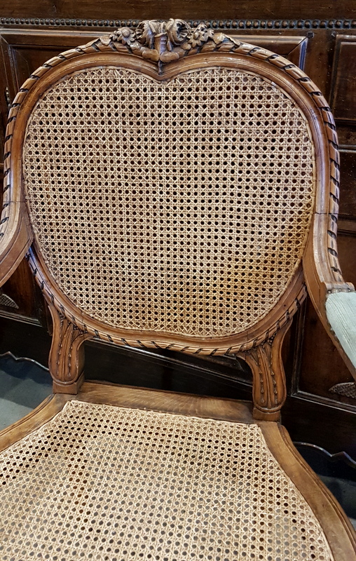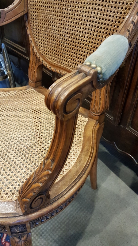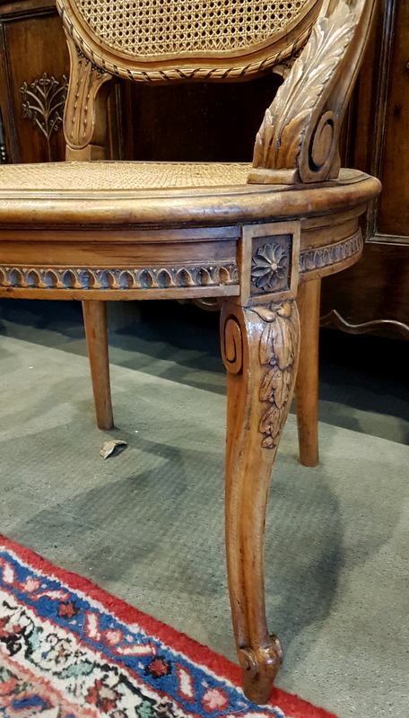 A 19th century French Louis XVI style carved walnut armchair, elegantly carved, the large medallion-back and ample seat fitted with woven rattan. Please note the wonderfully shaped back-rest. Area of Paris, circa 1880.
