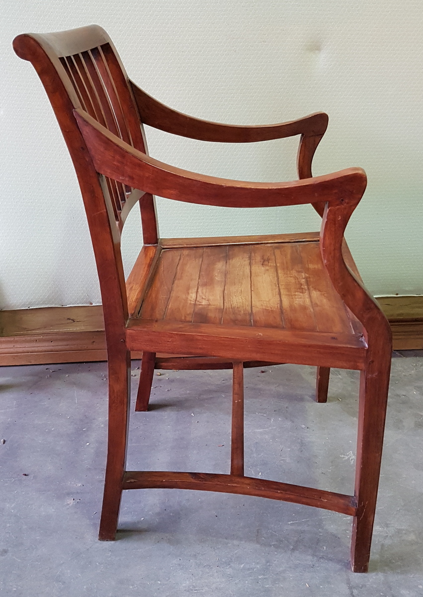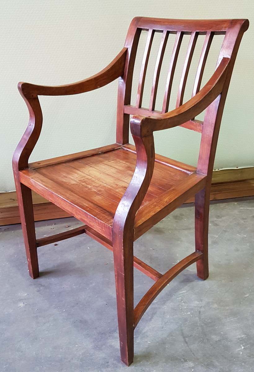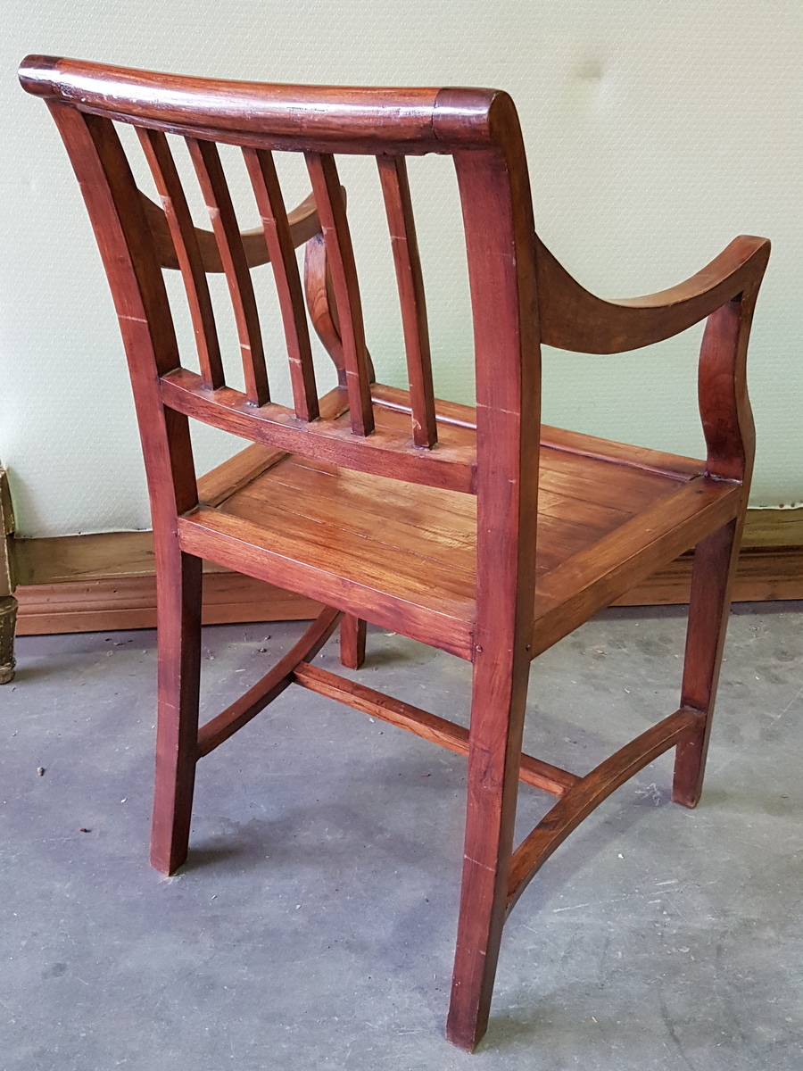 A pair of early 20th century Anglo-Indian teakwood Sheraton style armchairs, with typically shaped arm rests and back splats, and with elegantly curved 'H' stretchers. Area of Delhi, circa 1930. Price is for the pair.