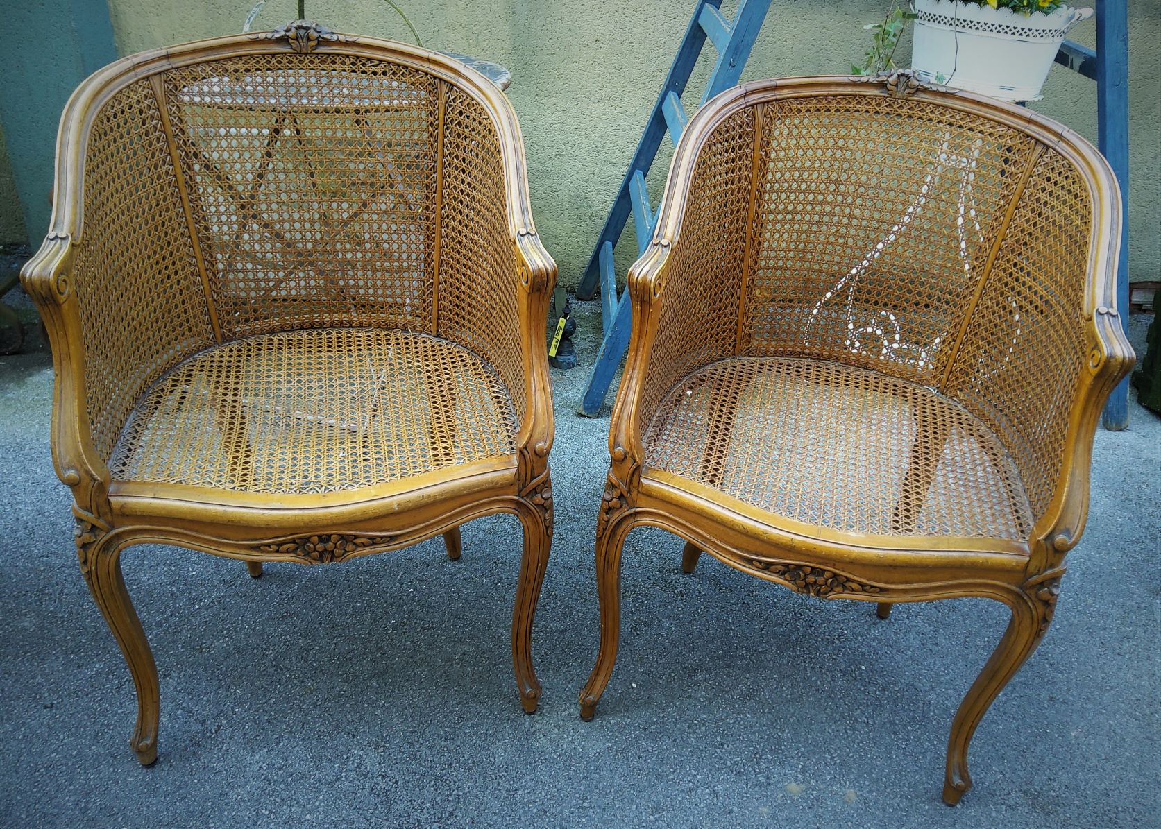A pair of French Louis XV style carved beechwood "Bergère en Gondole" tub armchairs, the seat heights suitable for use as a desk armchair. Note the elegantly curved back rest and the chair seats and wrap-around backs fitted with finely woven rattan. Area of Paris, circa 1930.
