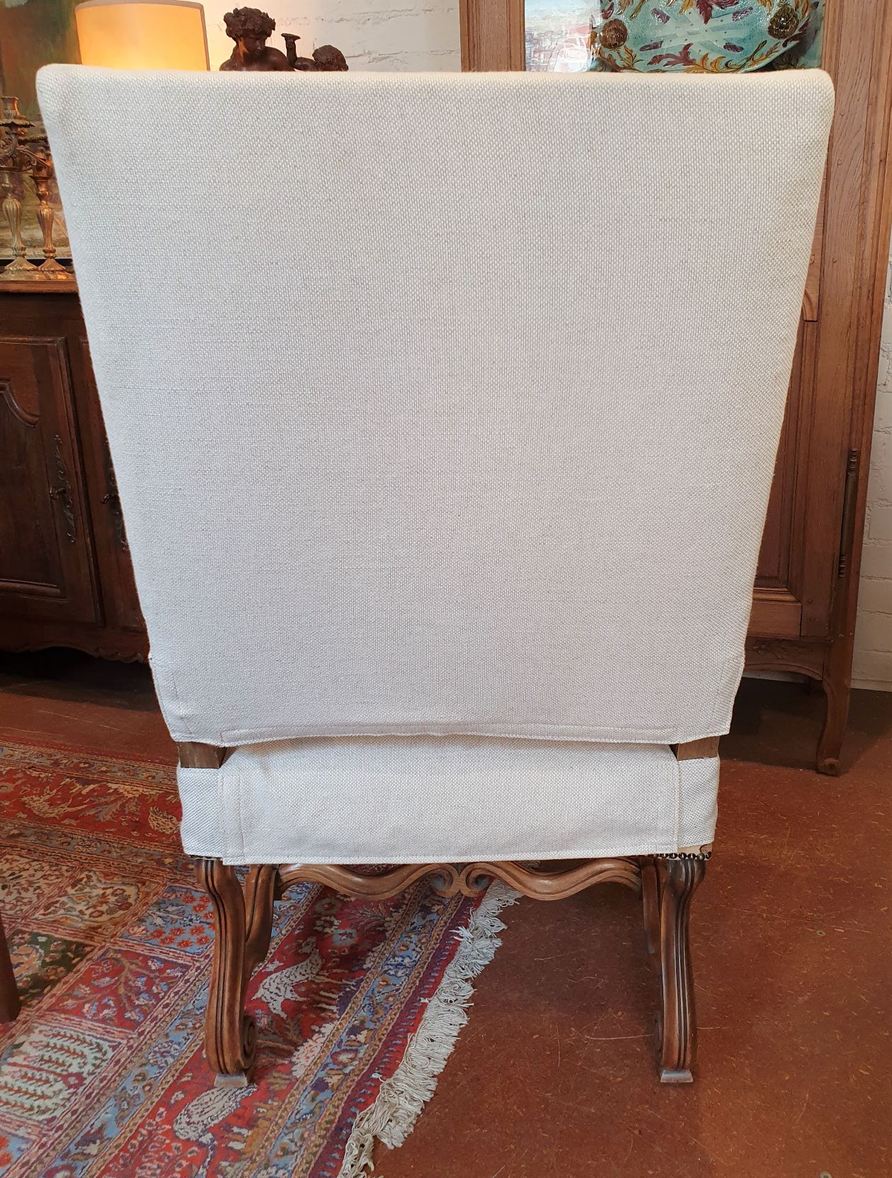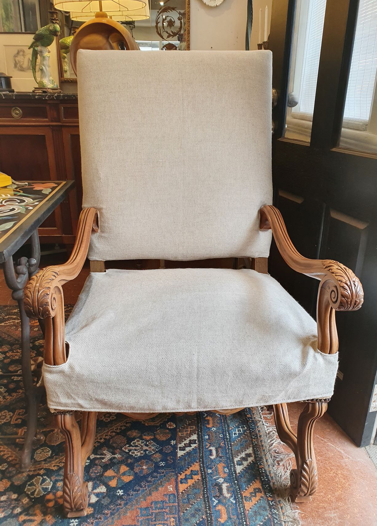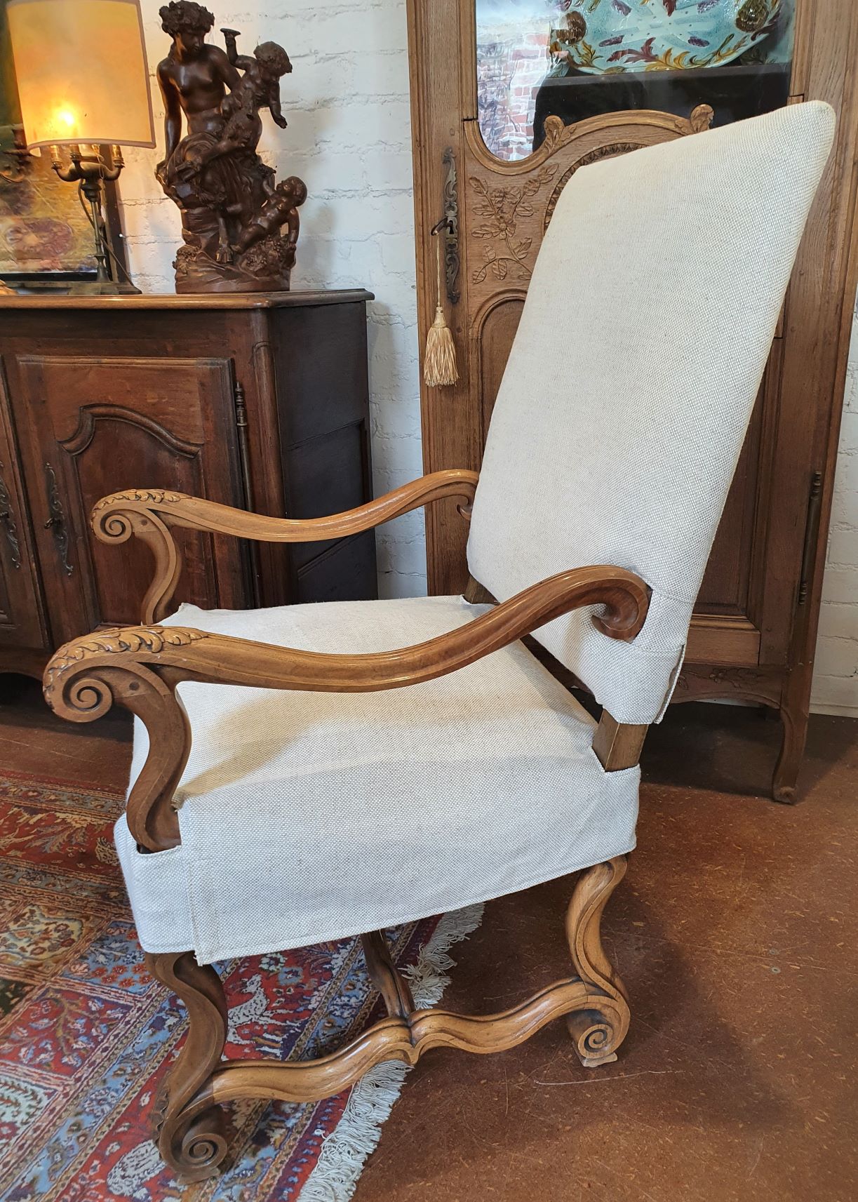 A large 19th century French Regence style carved walnut armchair decorated with the typical broad back rest and sweeping arms, standing on carved "Os de MoutonĀ legs" joined by a shaped stretcher base. Retaining a wonderfully burnished and luminous walnut patination. Please note: the armchair's seat is tall enough for a person to sit at a desk or table. Area of Paris, circa 1880.