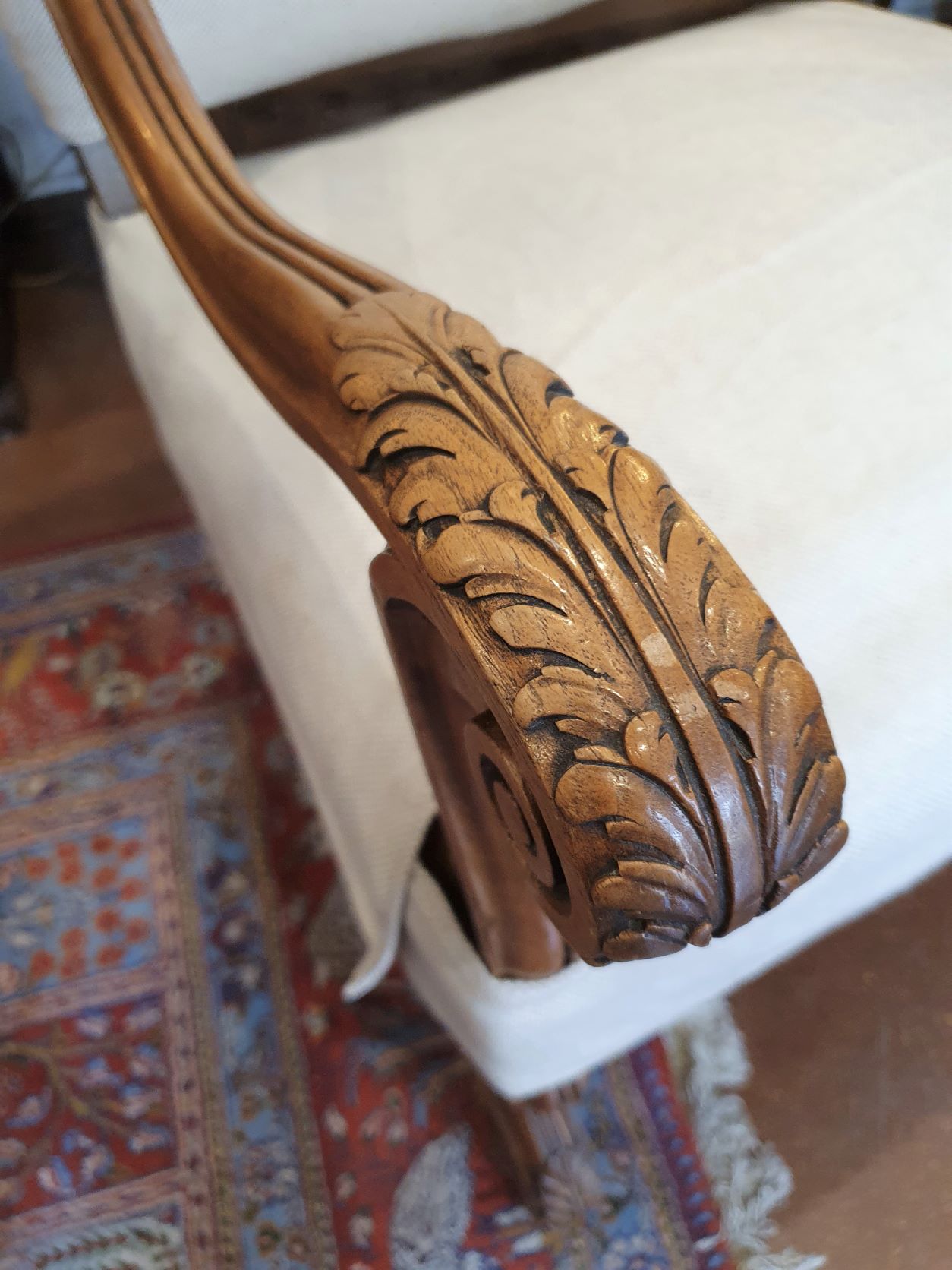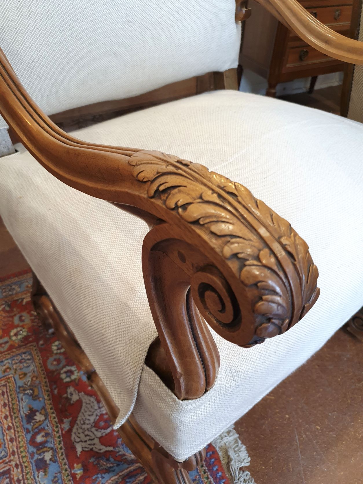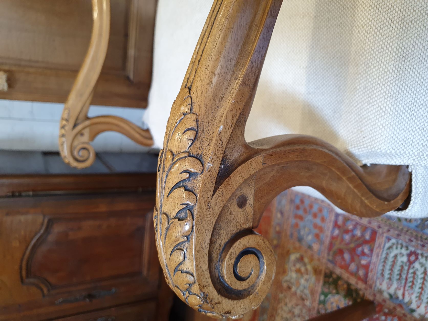 A large 19th century French Regence style carved walnut armchair decorated with the typical broad back rest and sweeping arms, standing on carved "Os de MoutonĀ legs" joined by a shaped stretcher base. Retaining a wonderfully burnished and luminous walnut patination. Please note: the armchair's seat is tall enough for a person to sit at a desk or table. Area of Paris, circa 1880.