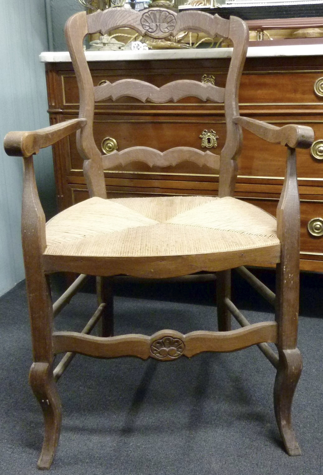 A French Provincial ladderback armchair of typical Southern French design, fitted with a hand rush-seated, the oak timbers bas-relief carved with shell motifs. Lightweight and comfortable to sit on. Area of Provence, circa 1930.
