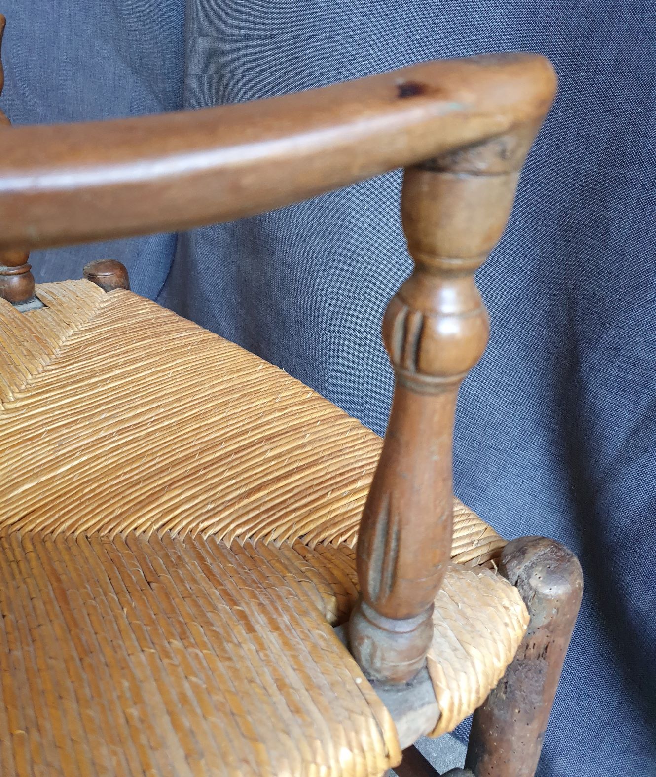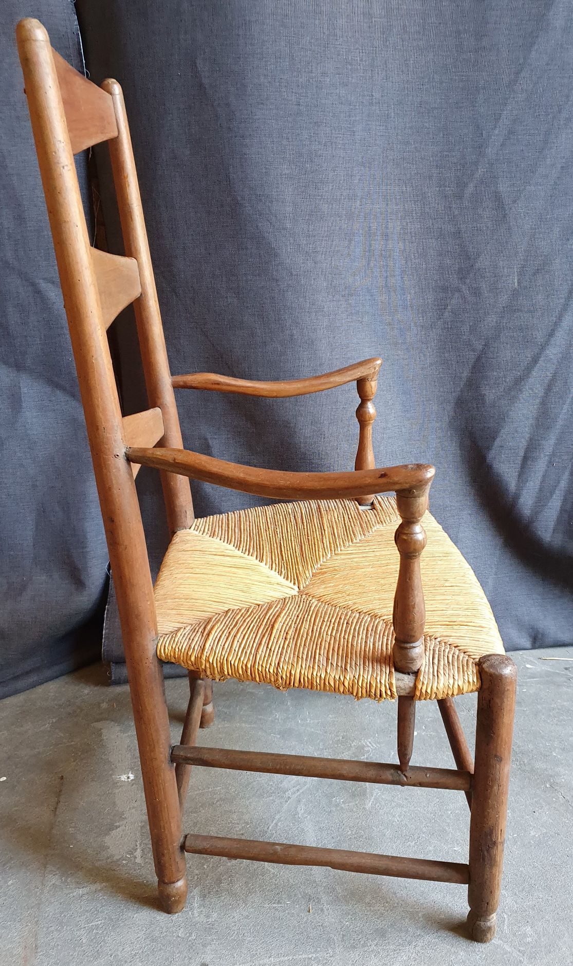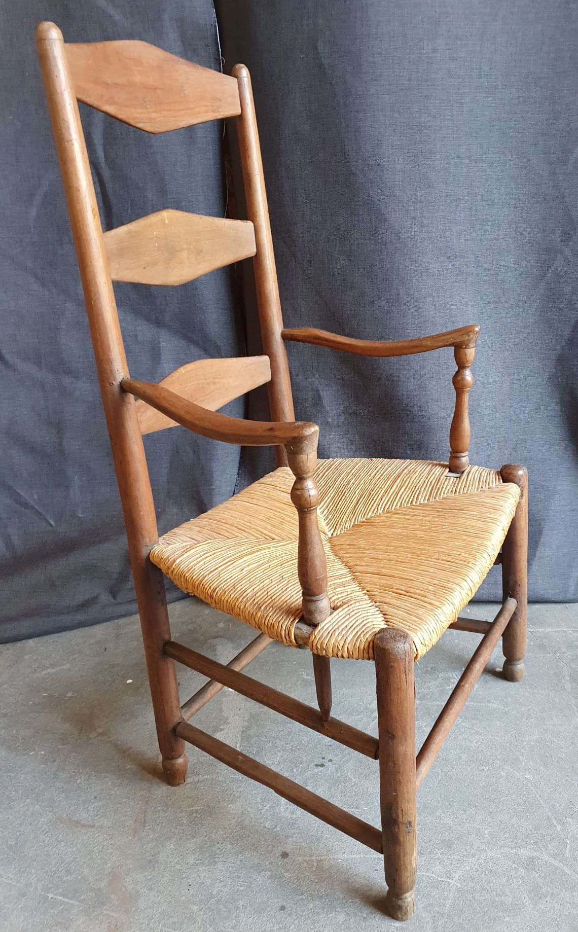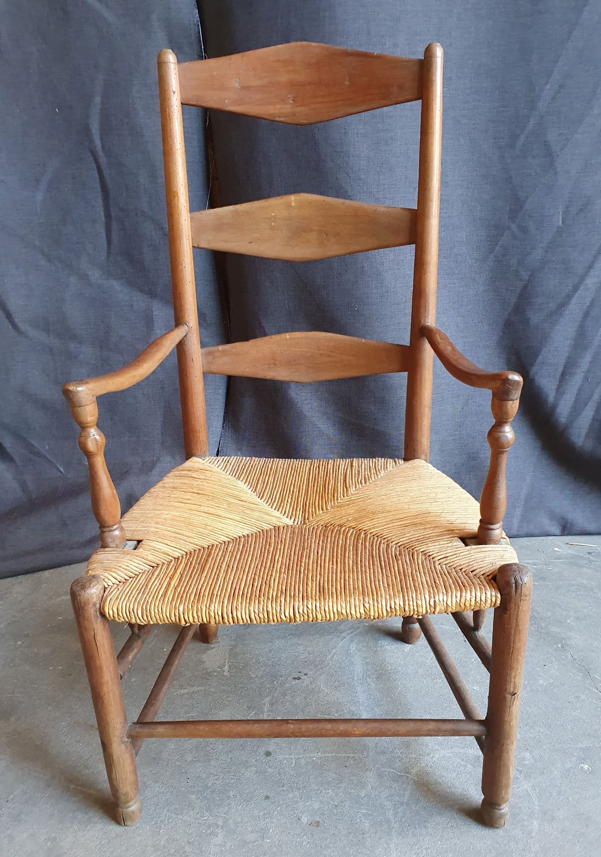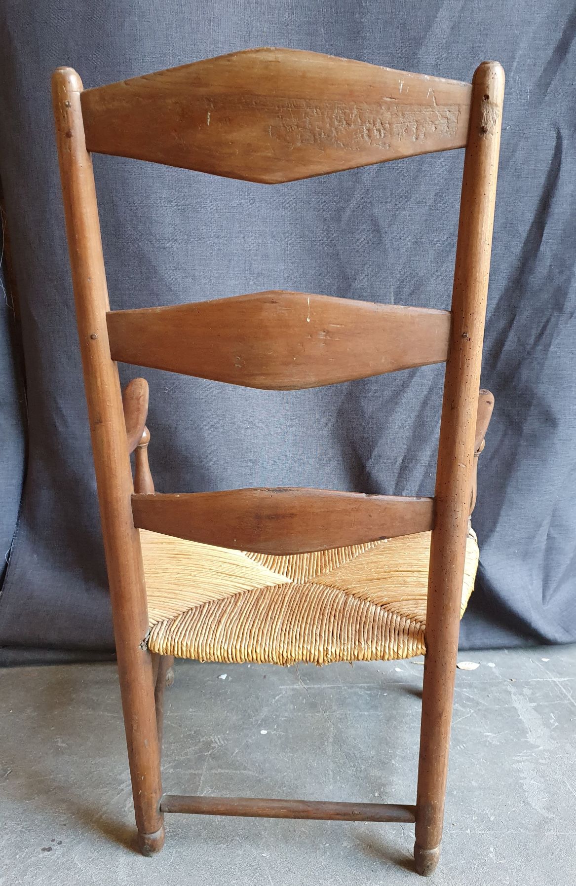 A large and comfortable, early 19th century French provincial walnut and oak ladderback armchair, the ample seat with woven rush. Typical provincial-Directoire design from the area of Picardie, circa 1820.