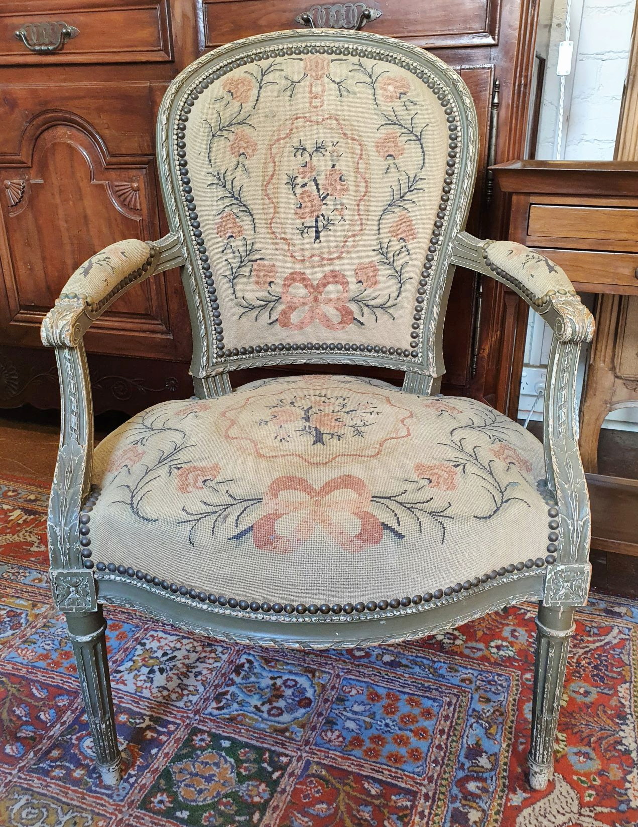 A pair of 19th century French Napoleon III period, Louis XVI style, carved and painted 'Fauteuils Cabriolet' armchairs of Classical proportions, the seats, the backs and armrests retaining the original tapestries, which were made specifically for these armchairs. Elegantly carved and comfortable to sit on, both armchairs retaining the original horse hair upholstery. Each of the undersides of the seats is stamped with the maker's mark, "Maison Krieger".
