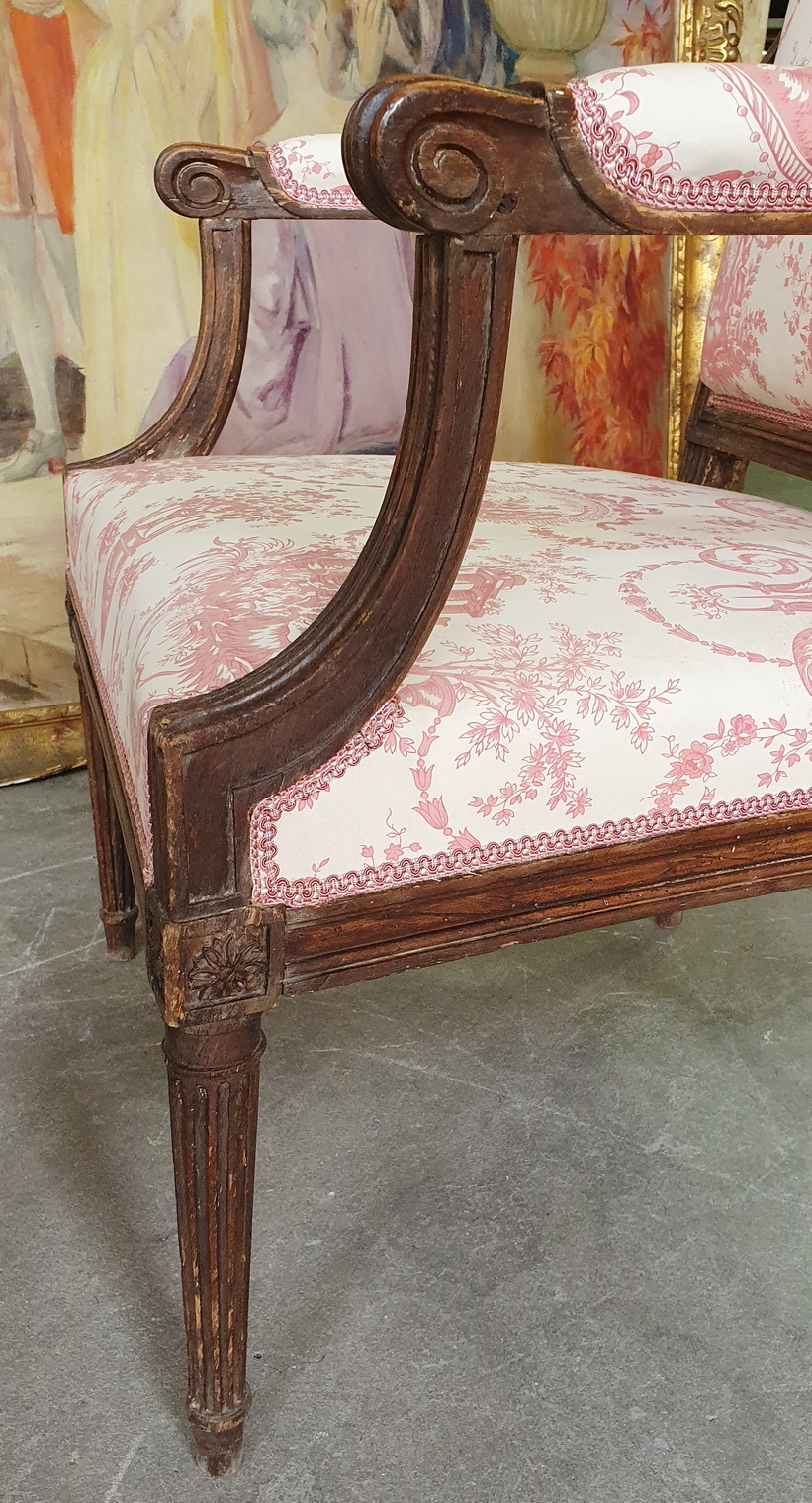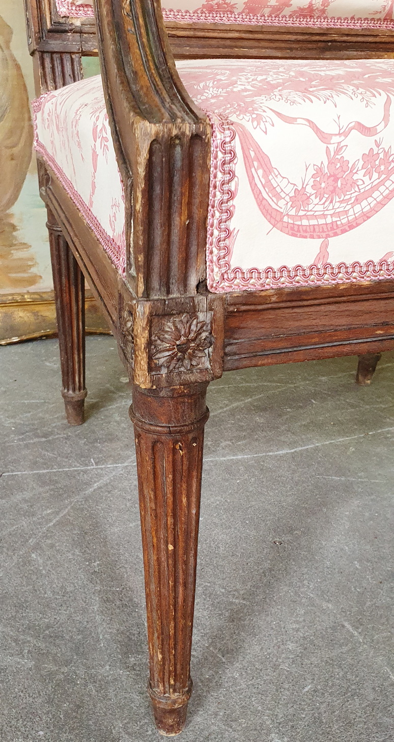 An18th century French Louis XVI period carved and turned beechwood Fauteuil armchair of understated elegance, the broad, square backrest above scrolled, upholstered arms, standing on tapering and fluted legs. Please note the Neoclassical proportions and decorative elements, including paterae and classical mouldings. Paris, circa 1780.
