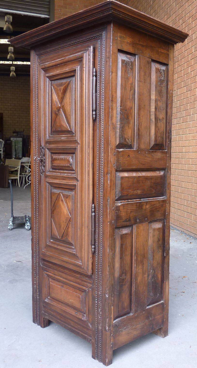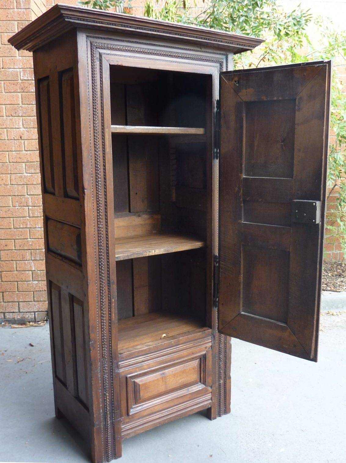 An early 18th century French Provincial Louis XIV single-door solid oak Bonnetiere cupboard,the pediment with an elegant over-hang, the door decorated with diamond-panelling. Internally fitted with shelves. This is stored at our second warehouse. Please call ahead of time to allow us to bring it to the shop for you.