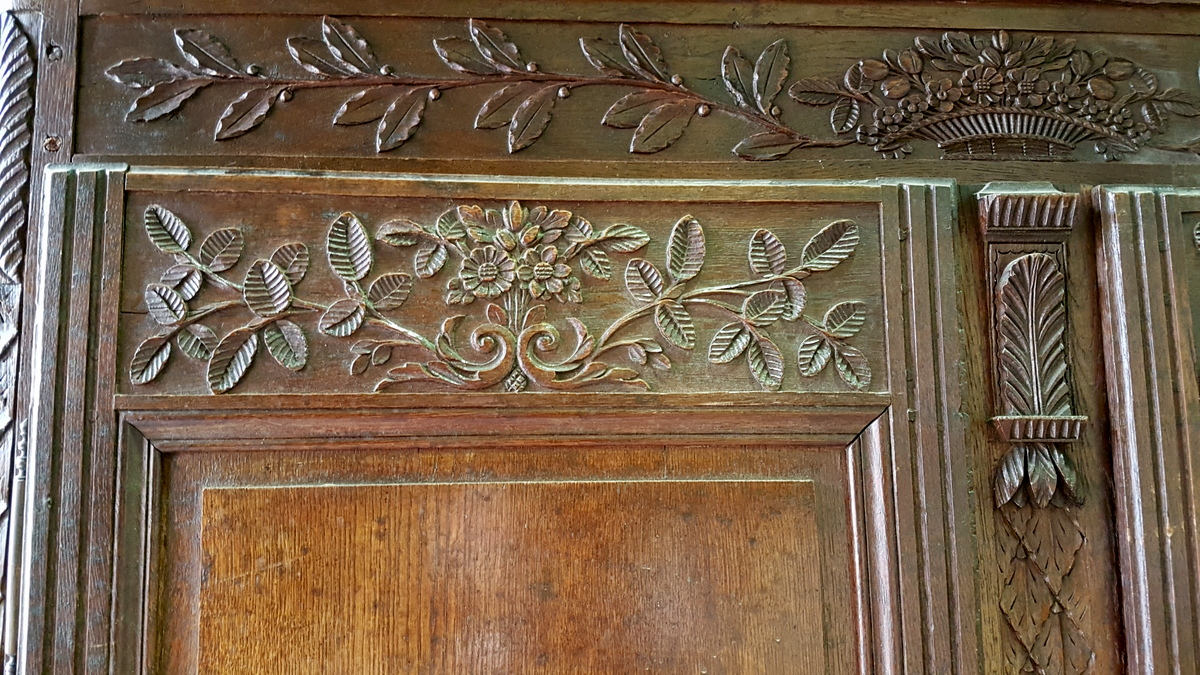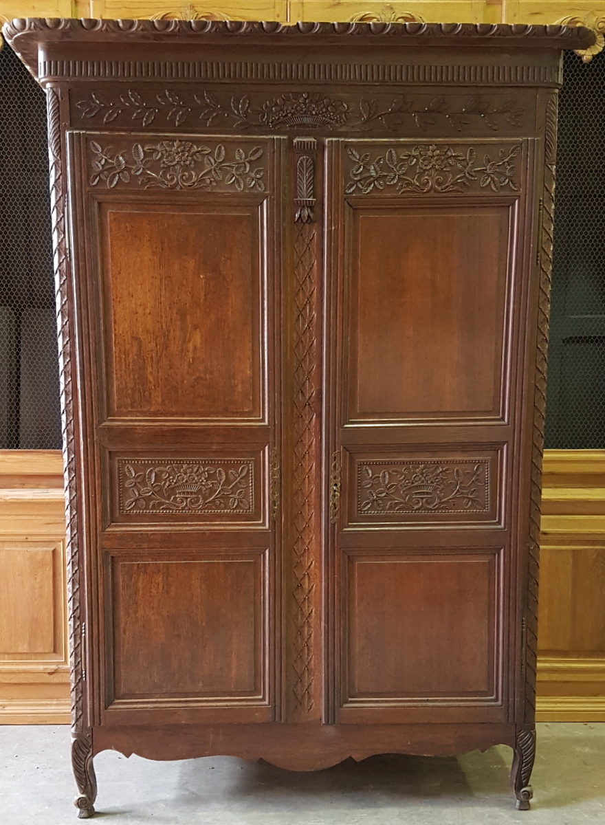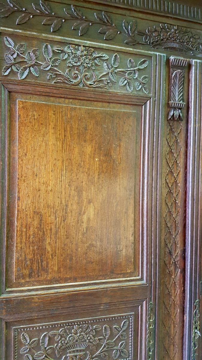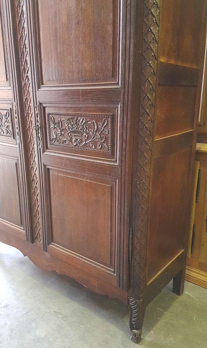 An early 19th century French carved solid oak Armoire de Mariage, decorated with haut-relief foliate and flower motifs, typical allegories for Spring time and fertility: the well-wishes for a married couple. Lower in height than most Armoires. Retaining a rich oak patination. Area of Rouen, Normandy, circa 1840.
