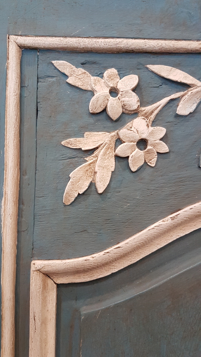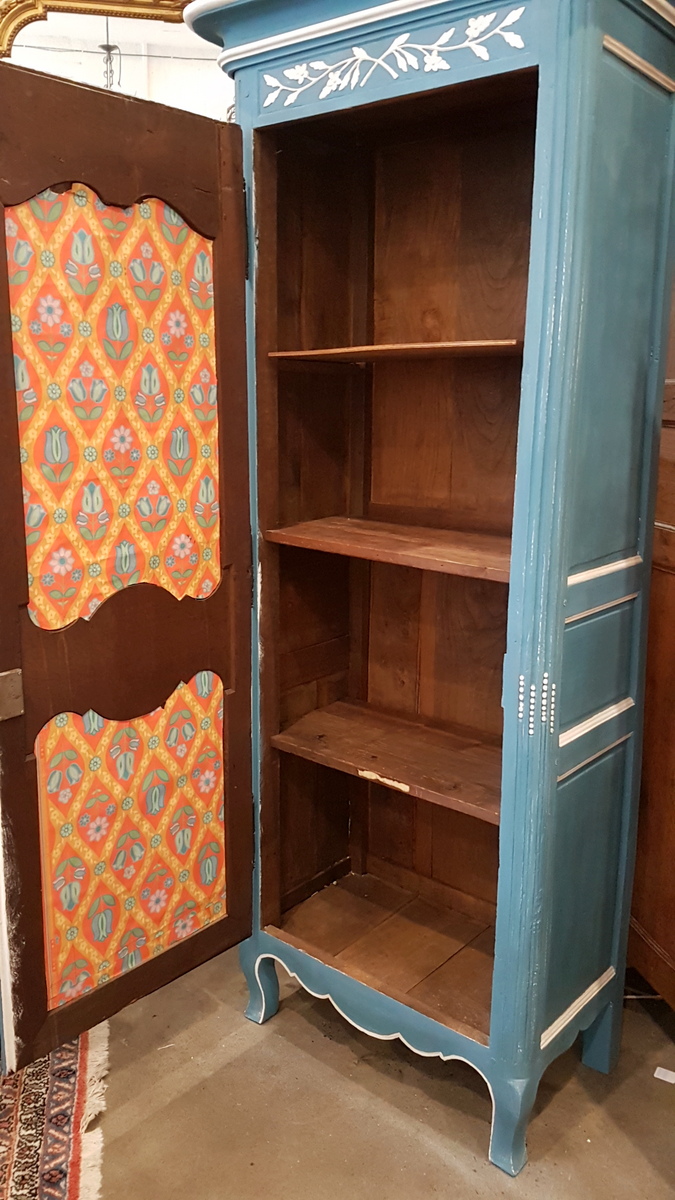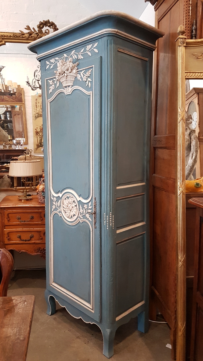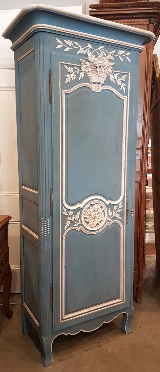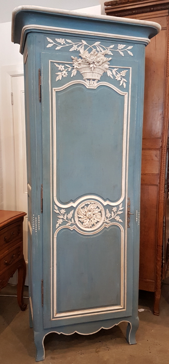 An early 20th century French carved and painted oak ‘Bonnetiere de Mariage’, a single-door Armoire from the city of Rouen, the capital of Normandy. In the French tradition, this sort of wardrobe was given in Normandy to a newly-wed couple as a wedding present, and it is decorated with carved bouquets and garlands of Spring flowers, allegories for abundance and for fertility. Internally fitted with shelves, this small armoire could be adapted to have a coat-hanger bar. Area of Rouen, circa 1930.