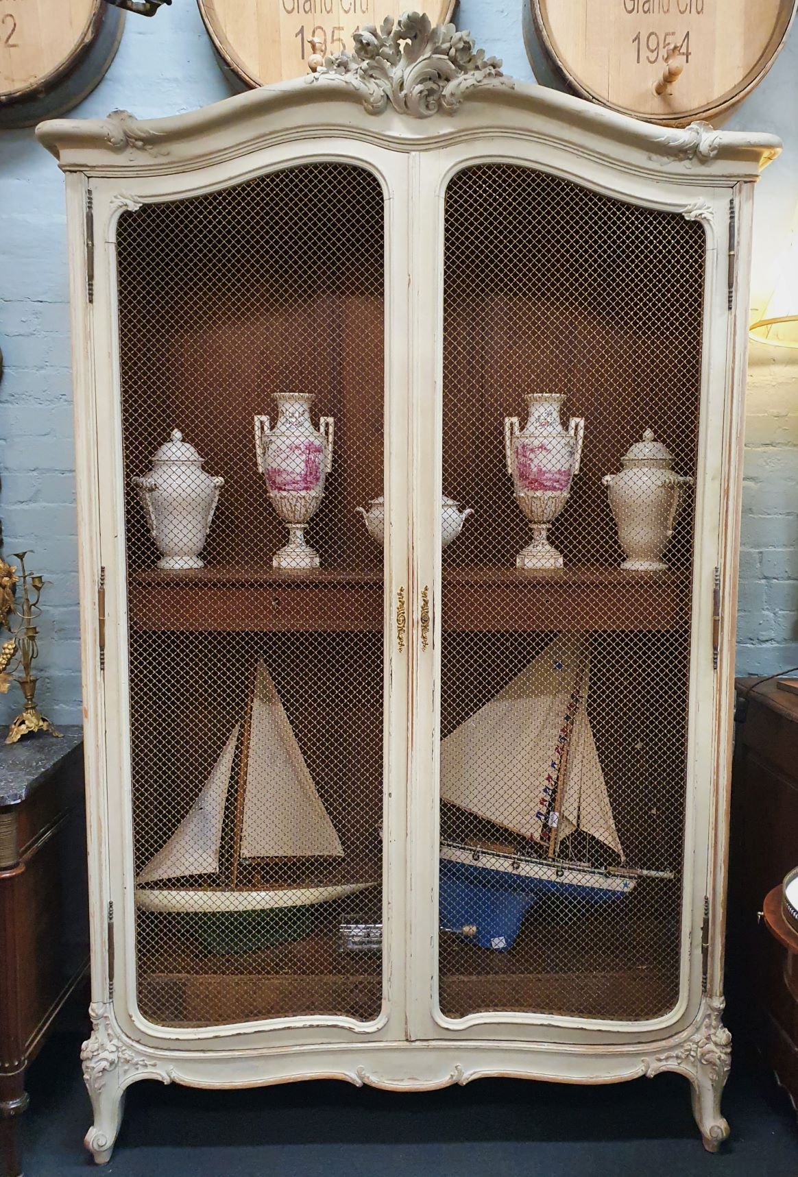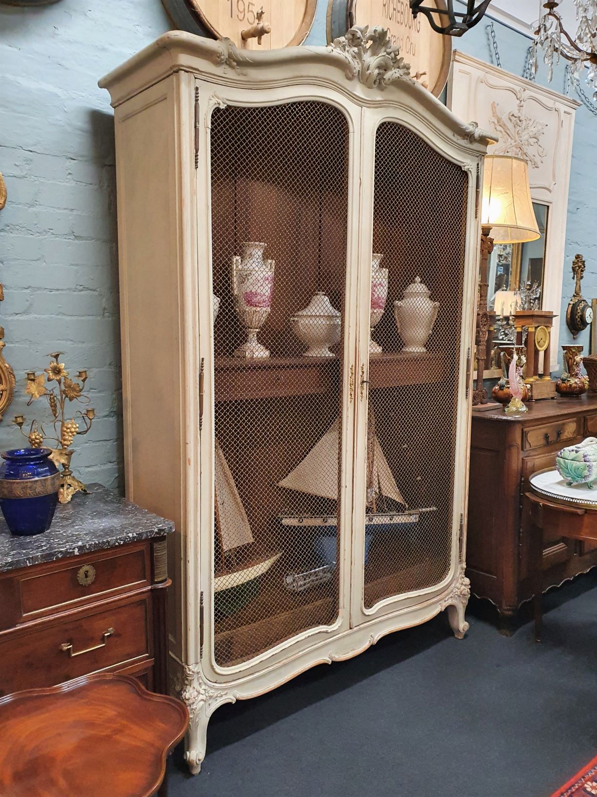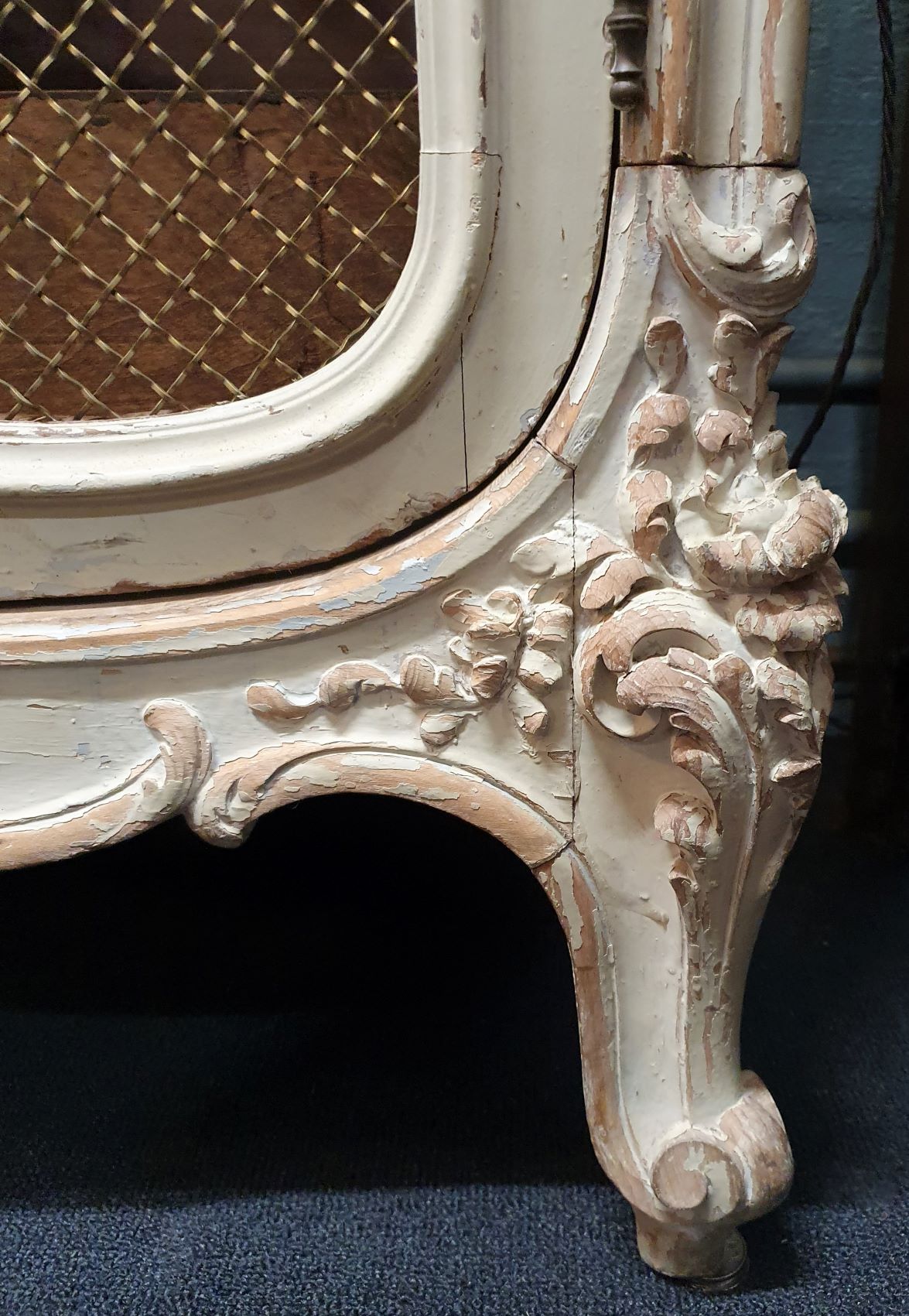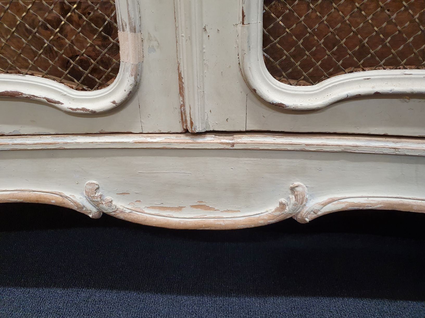 A fine, late 19th century French Louis XV style carved and painted two door Armoire, the shaped doors fitted with bronze mesh. Note elegantly curved pediment with its out-sized foliate scroll motifs, and the very fine, Parisian quality of the carvings. Internally with a shelf fitted with two drawers. Note the excellent, worn patina of the original milk paint finish. Area of Paris, circa 1880.