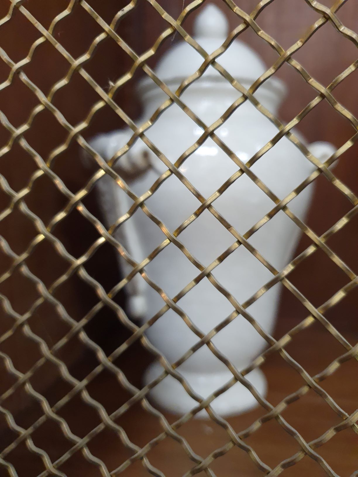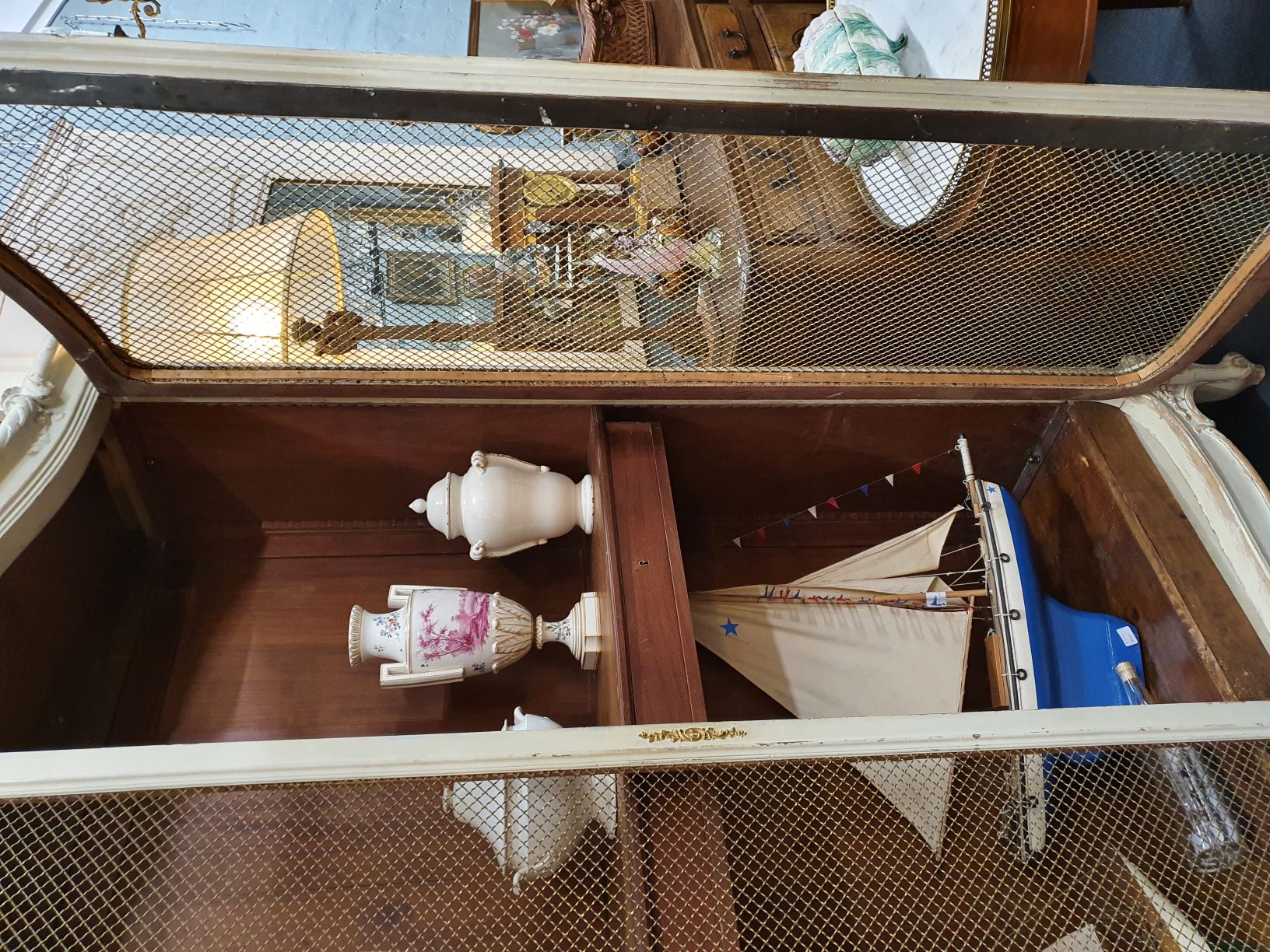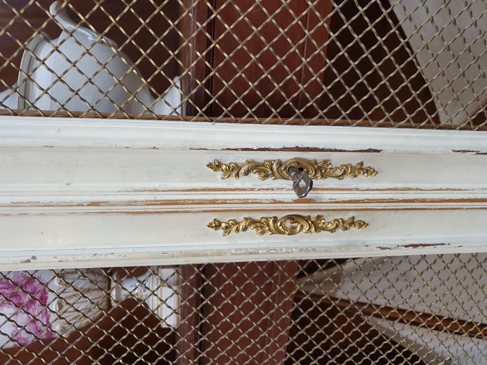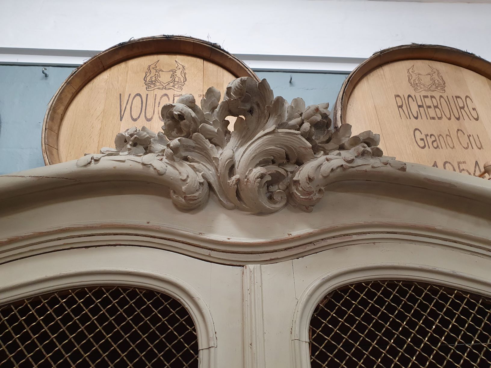 A fine, late 19th century French Louis XV style carved and painted two door Armoire, the shaped doors fitted with bronze mesh. Note elegantly curved pediment with its out-sized foliate scroll motifs, and the very fine, Parisian quality of the carvings. Internally with a shelf fitted with two drawers. Note the excellent, worn patina of the original milk paint finish. Area of Paris, circa 1880.