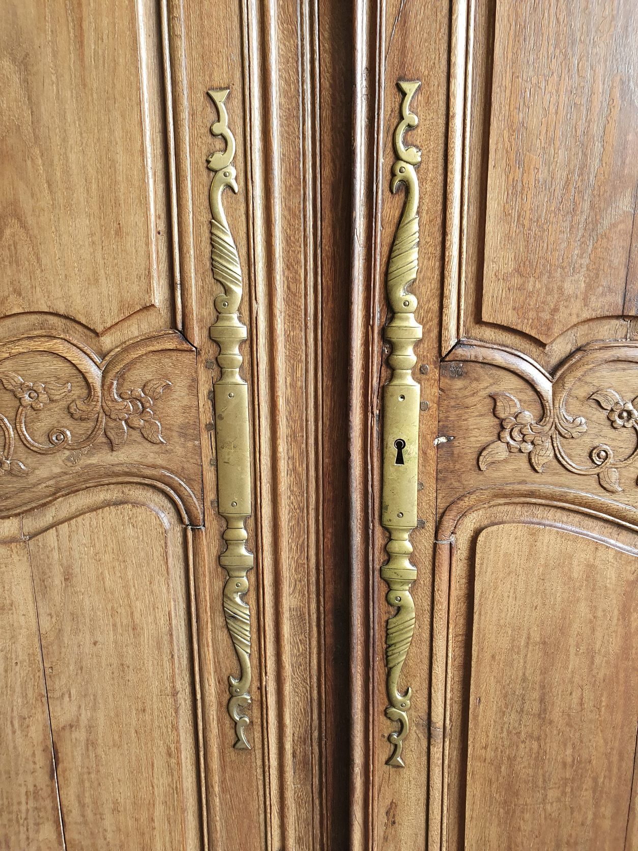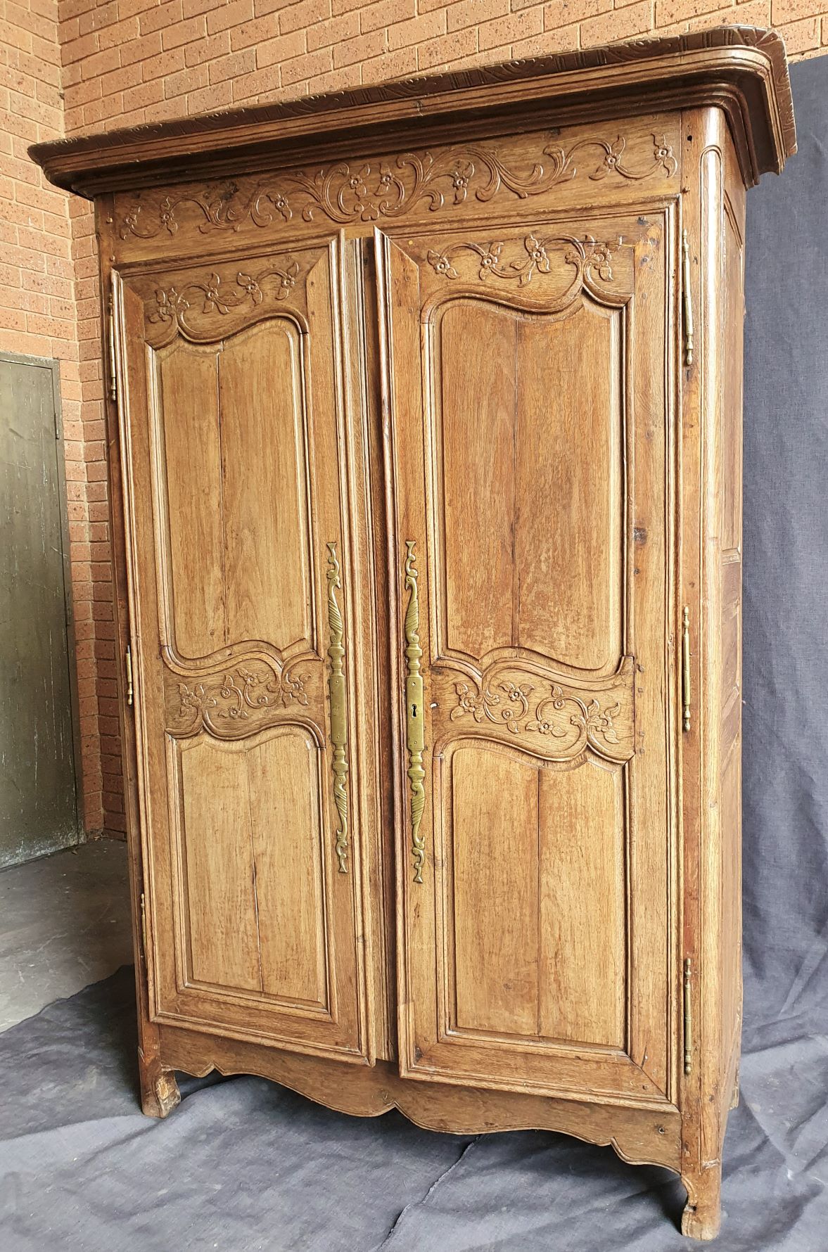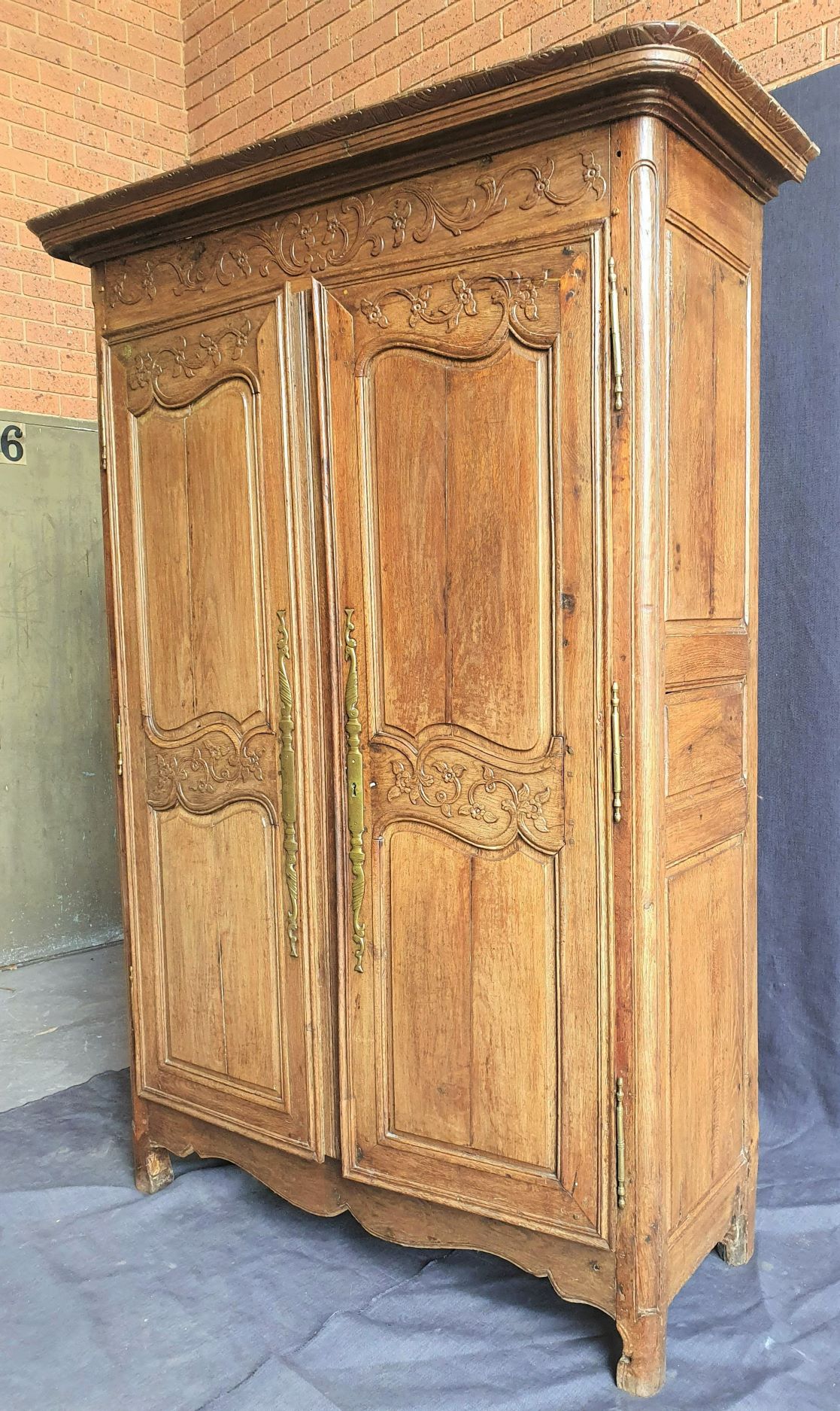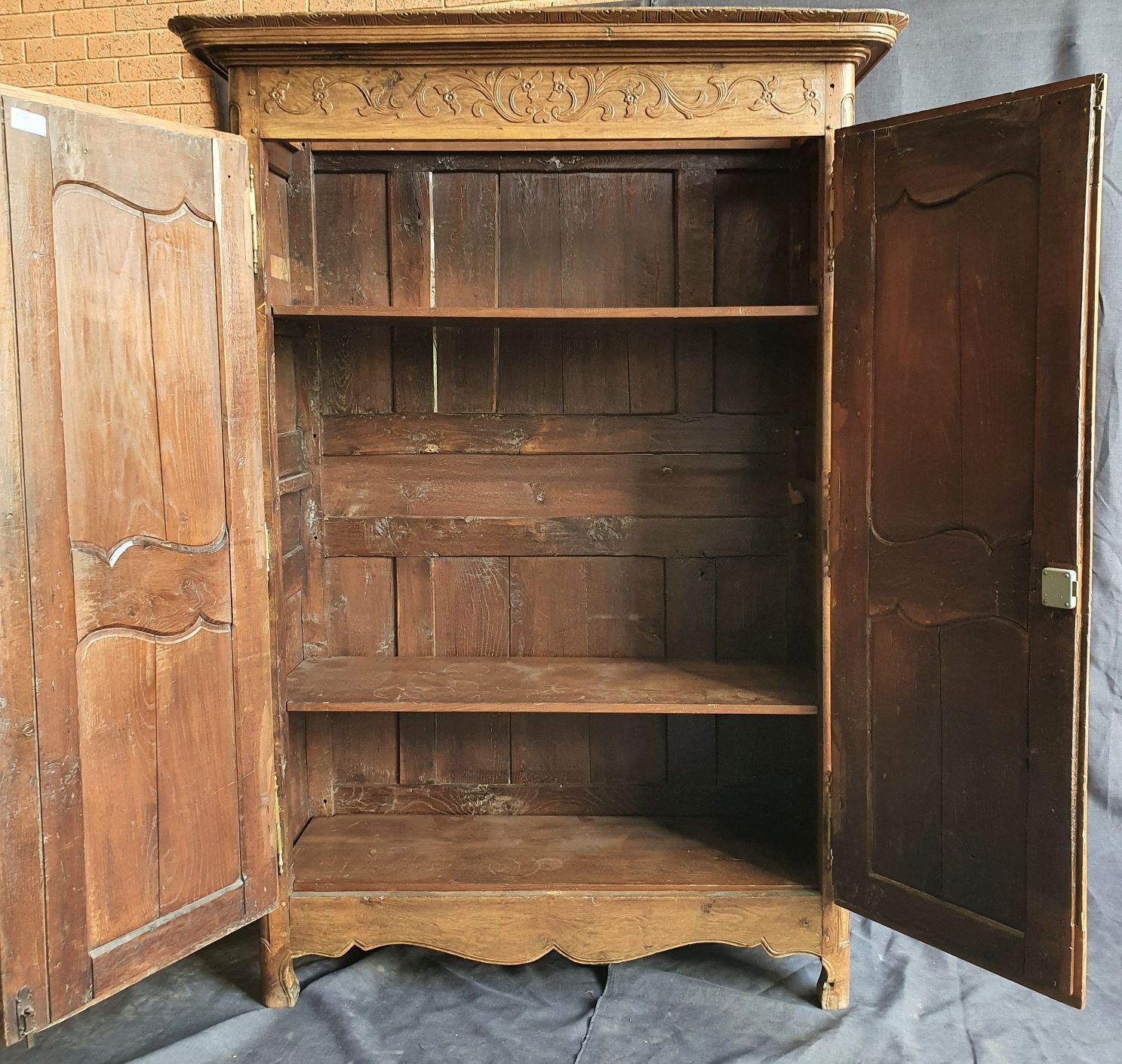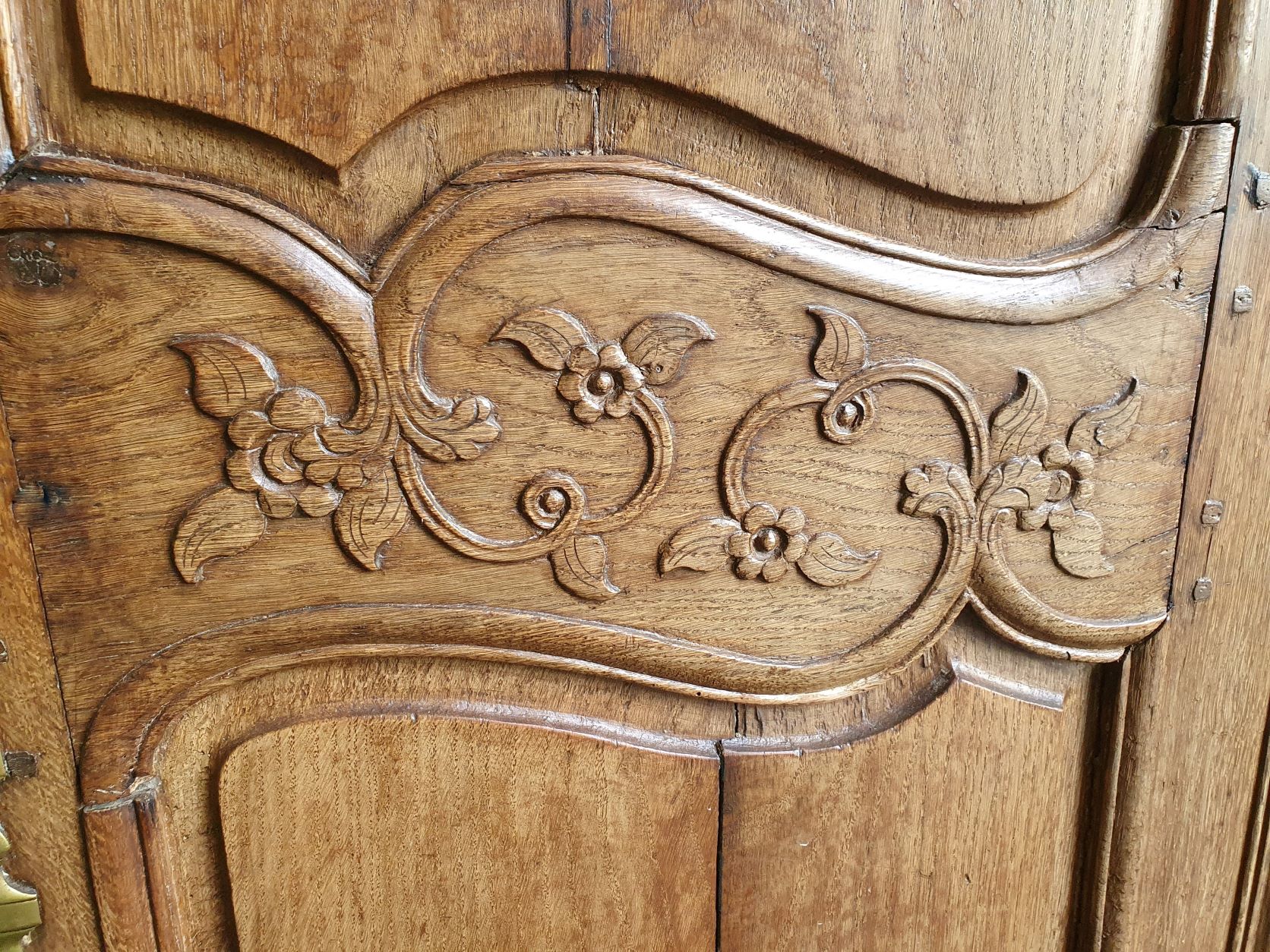 An 18th century French solid oak two-door 'Armoire de Mariage', haut-relief and bas-relief carved, internally fitted with shelves. Traditionally given as a gift to a newly-wed couple, this 'marriage' Armoire is decorated with allegorical motifs, including trellises of Spring flowers (for Youthfulness, fertility). Retaining a very nicely faded and well-burnished original patination. The rear and interiors show the adze and bow-saw toolmarks of its early construction techniques. France, circa 1770.