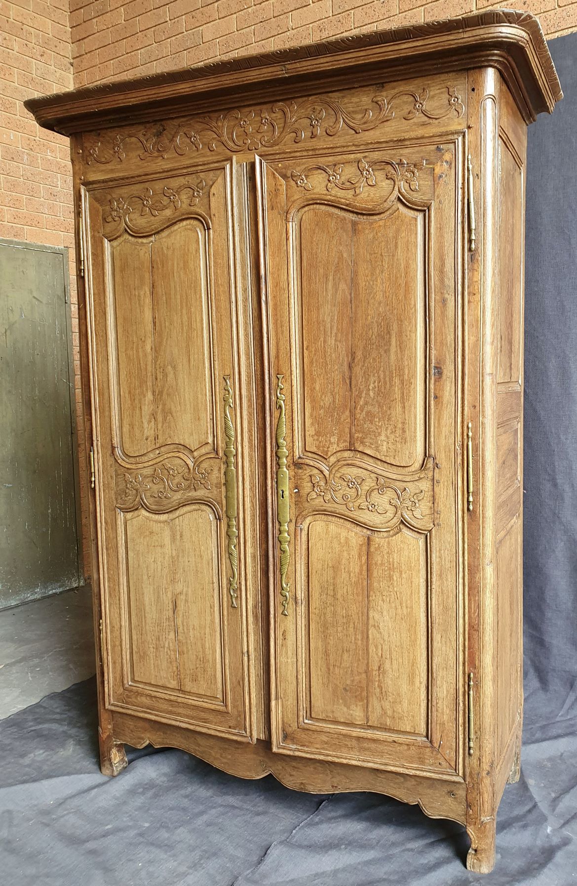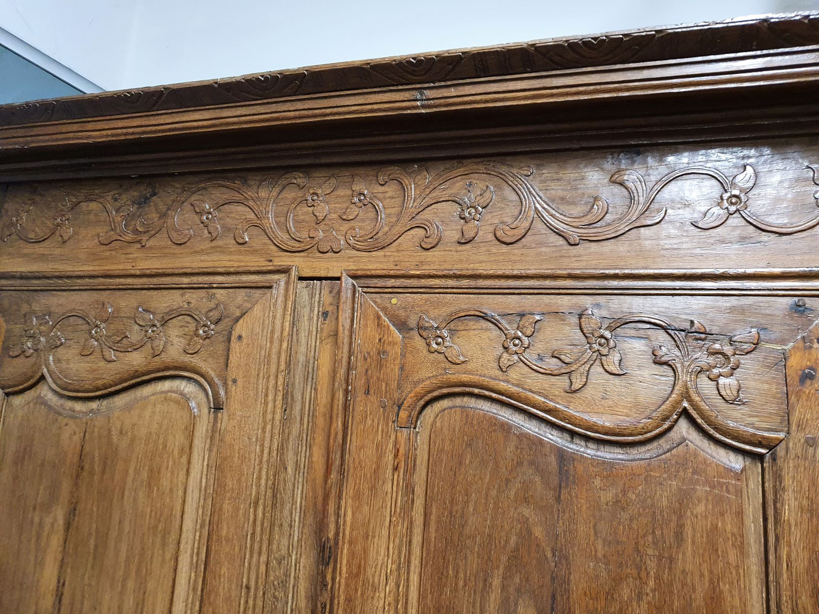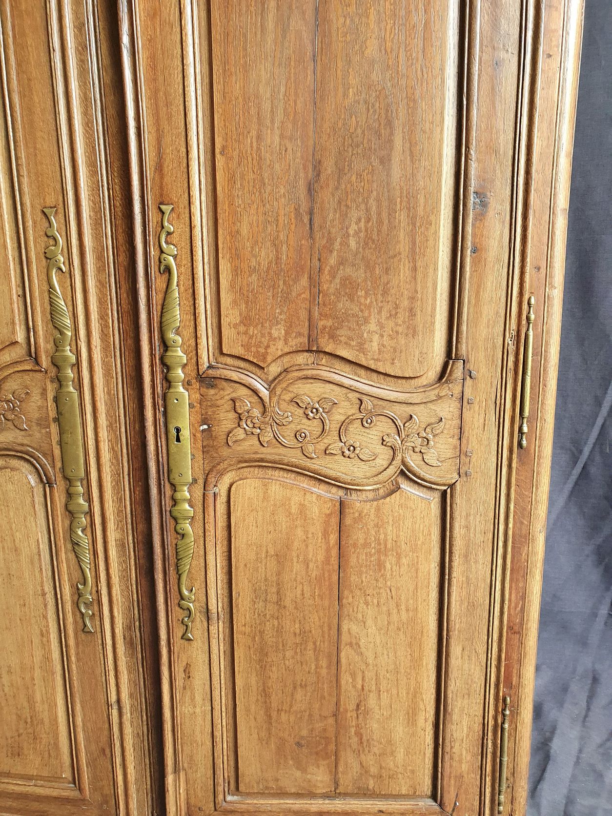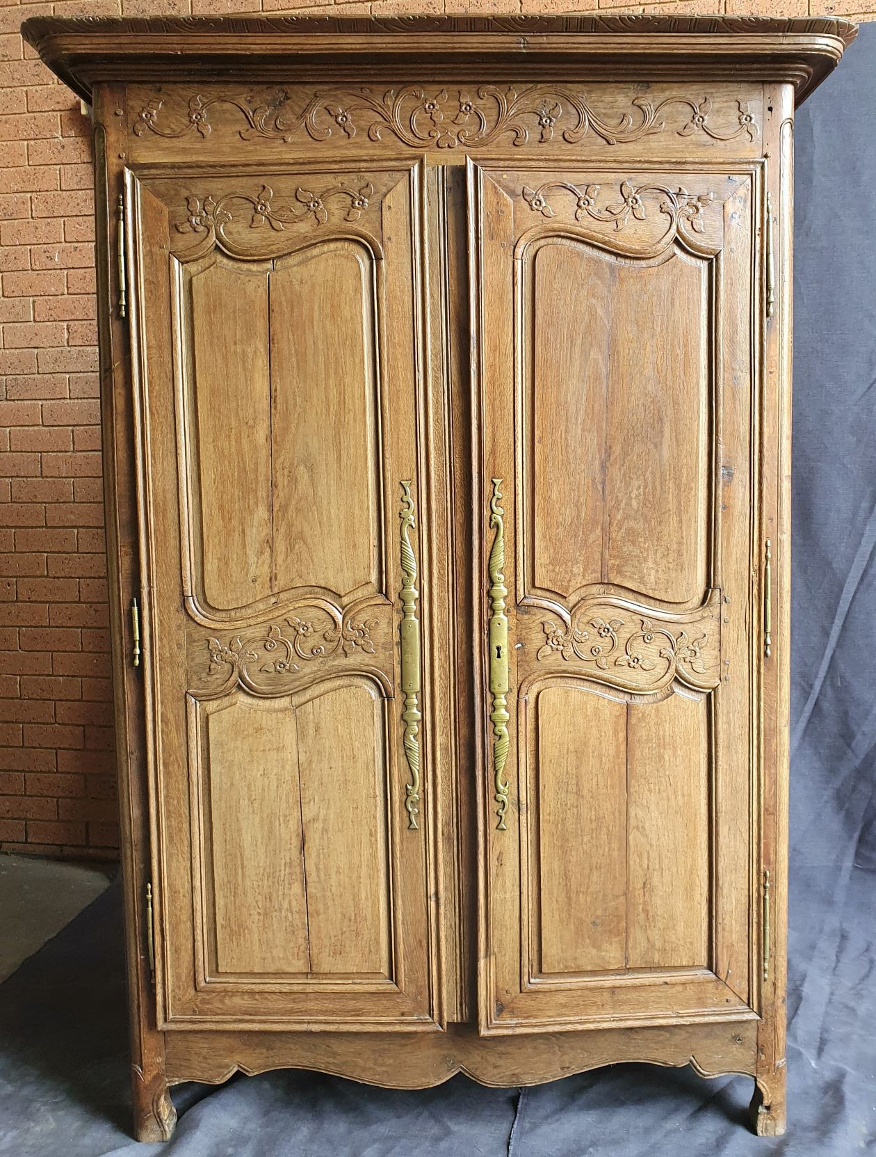 An 18th century French solid oak two-door 'Armoire de Mariage', haut-relief and bas-relief carved, internally fitted with shelves. Traditionally given as a gift to a newly-wed couple, this 'marriage' Armoire is decorated with allegorical motifs, including trellises of Spring flowers (for Youthfulness, fertility). Retaining a very nicely faded and well-burnished original patination. The rear and interiors show the adze and bow-saw toolmarks of its early construction techniques. France, circa 1770.